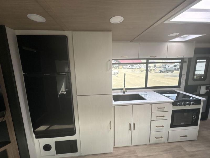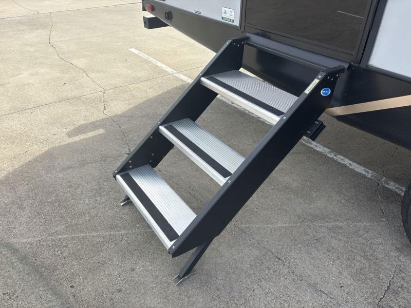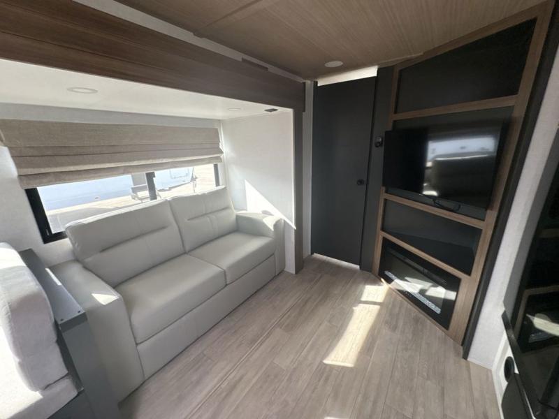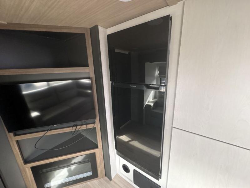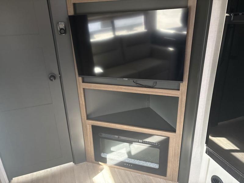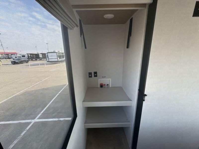 You will love camping every other weekend in this spacious travel trailer. There is a full rear bath with a spacious shower and linen closet for towels and toiletries. Your crew can get comfortable on the theater seating across from the entertainment center, and it even swings open to reveal hidden pantry storage. Easily prepare your meals in the kitchen on the three burner cooktop, or in the oven. There is also a 12V refrigerator, plus a microwave for meals on the go. When you're ready to call it a night, the front private bedroom is sure to provide comfort with its custom king bed, wardrobe, and underbed storage.