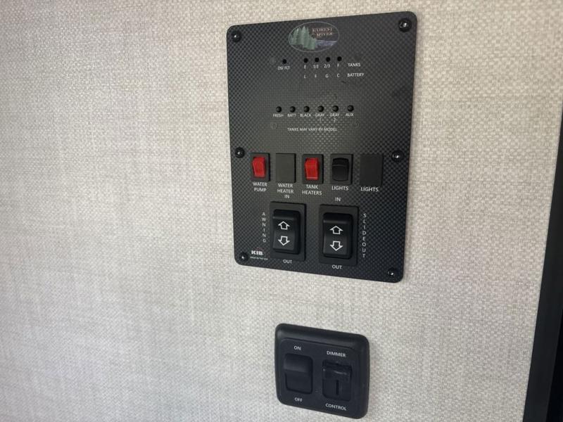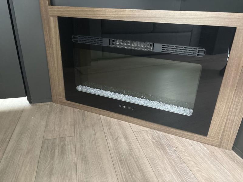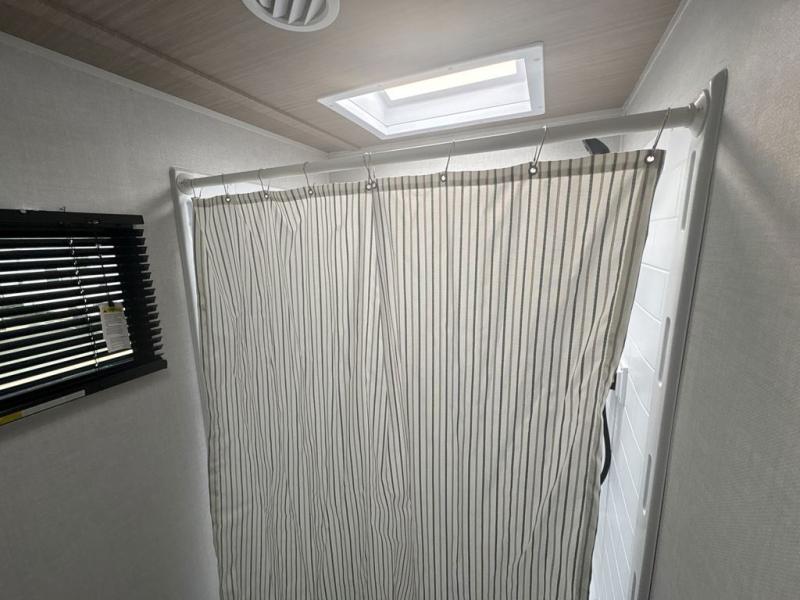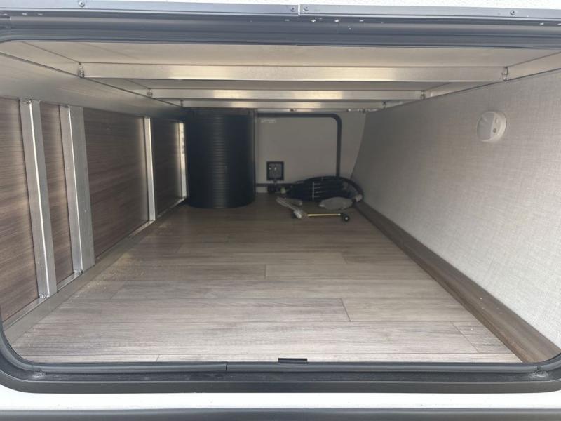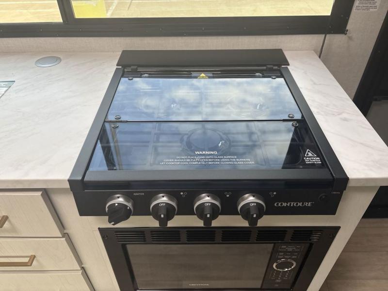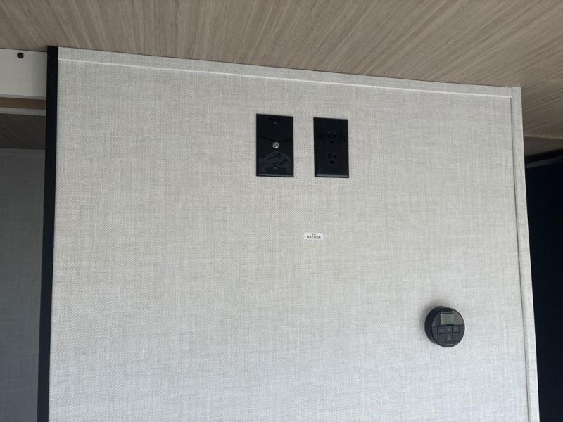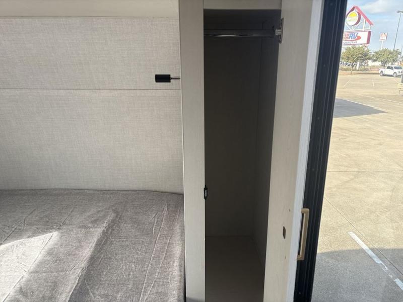 You will love camping every other weekend in this spacious travel trailer. There is a full rear bath with a spacious shower and linen closet for towels and toiletries. Your crew can get comfortable on the theater seating across from the entertainment center, and it even swings open to reveal hidden pantry storage. Easily prepare your meals in the kitchen on the three burner cooktop, or in the oven. There is also a 12V refrigerator, plus a microwave for meals on the go. When you're ready to call it a night, the front private bedroom is sure to provide comfort with its custom king bed, wardrobe, and underbed storage.