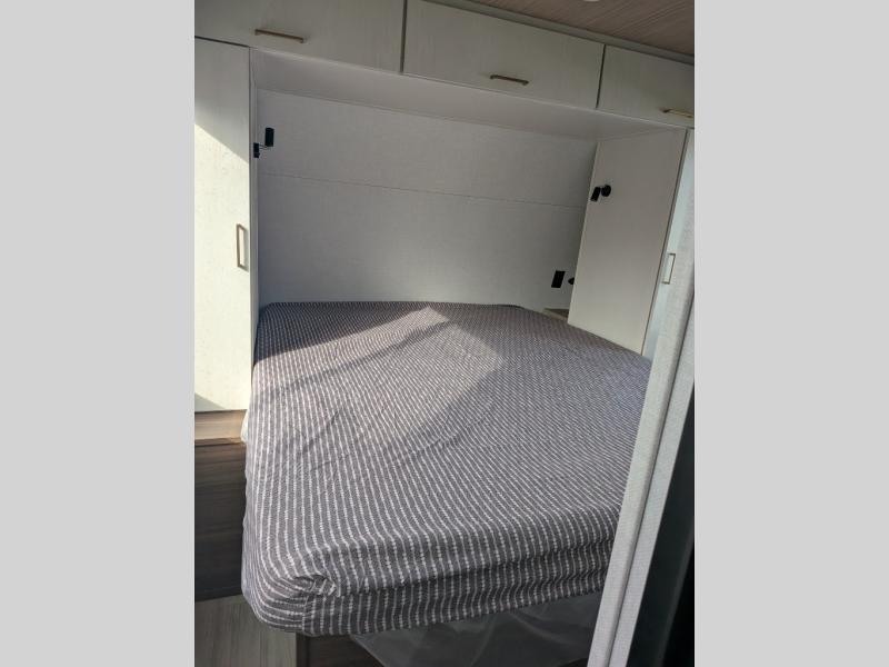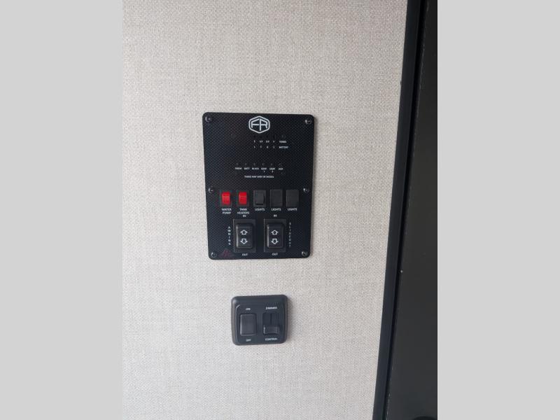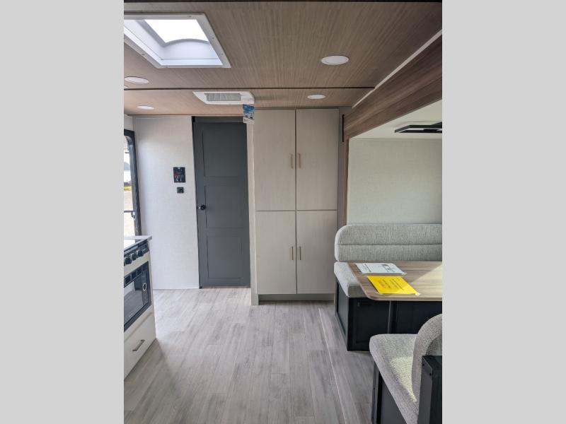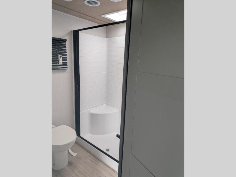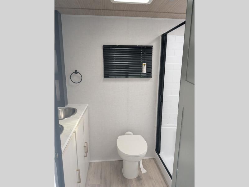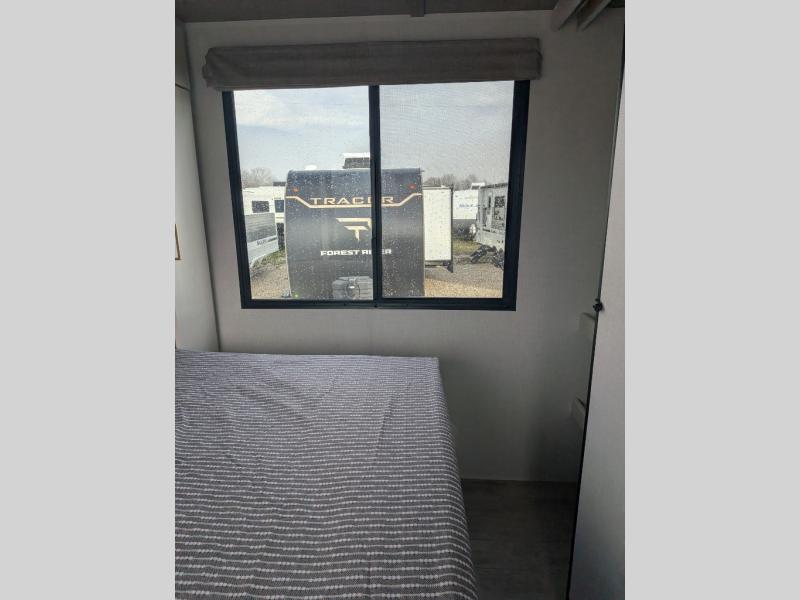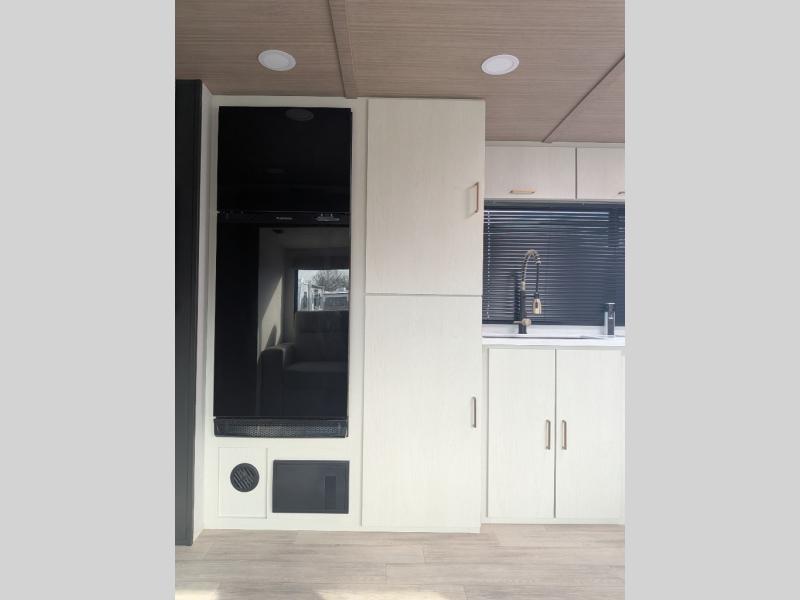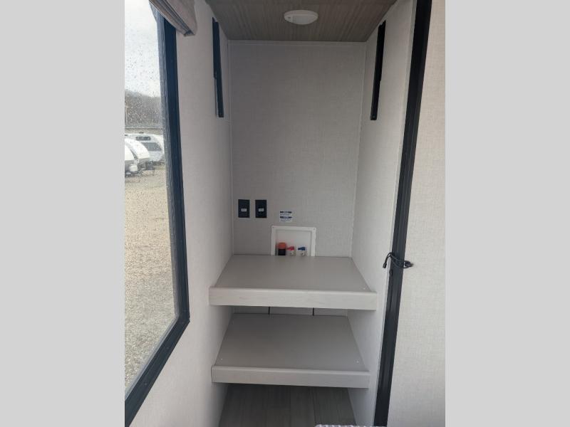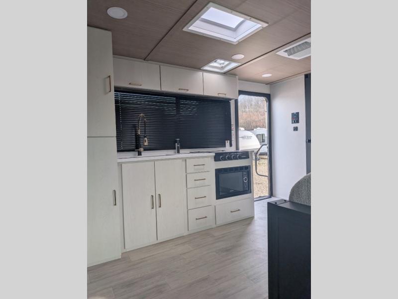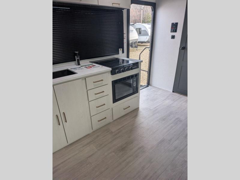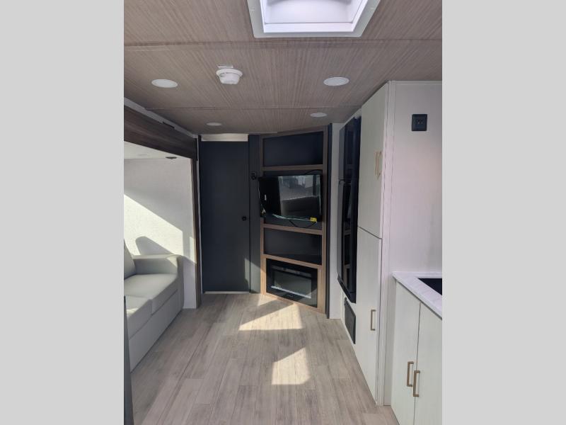 You will love camping every other weekend in this spacious travel trailer. There is a full rear bath with a spacious shower and linen closet for towels and toiletries. Your crew can get comfortable on the theater seating across from the entertainment center and fireplace. Easily prepare your meals in the kitchen on the three-burner cooktop, or in the oven. There is also a 12V refrigerator, plus a microwave for meals on the go. When you're ready to call it a night, the front private bedroom is sure to provide comfort with its custom king bed and generous storage space.