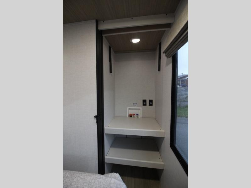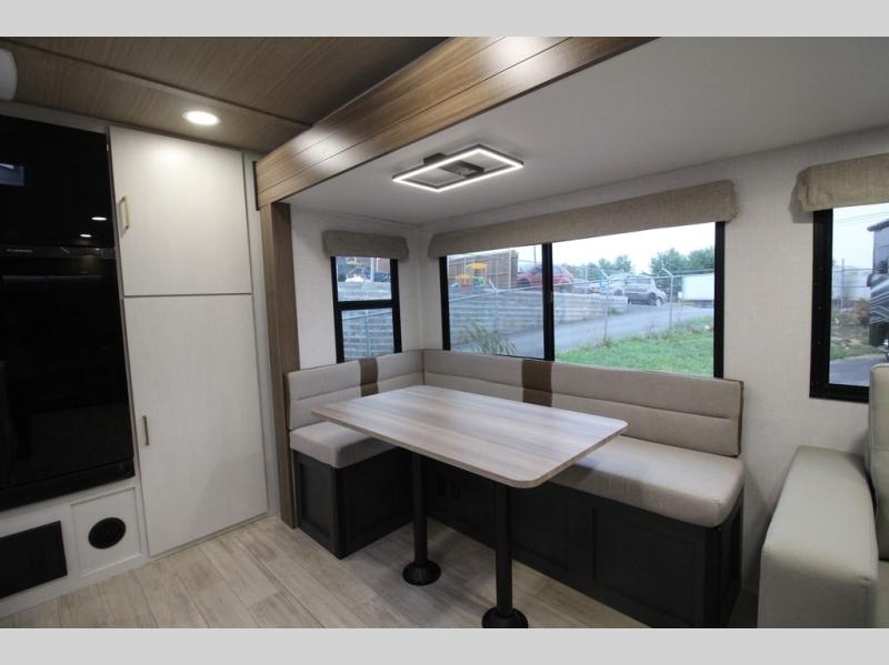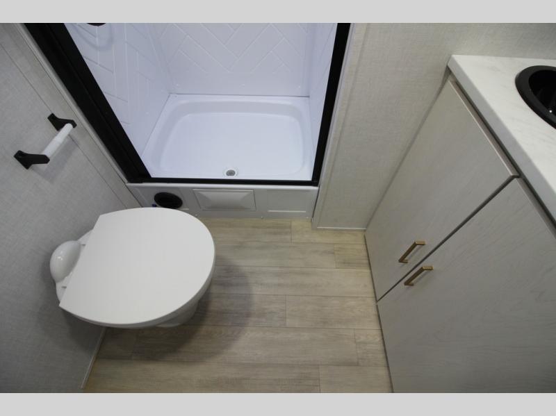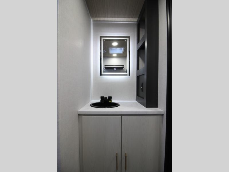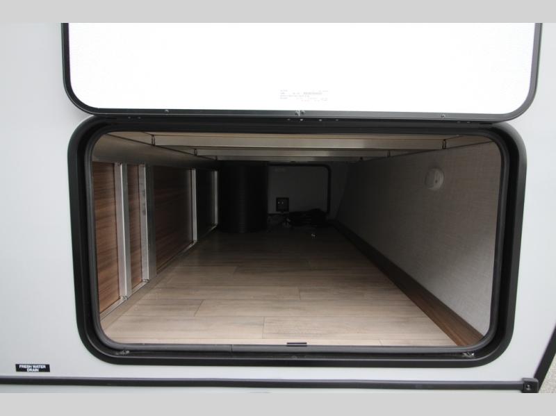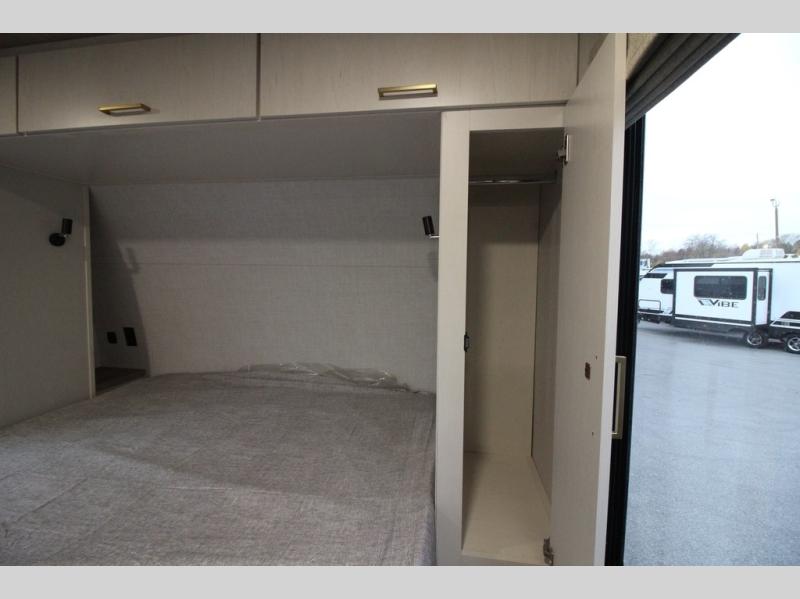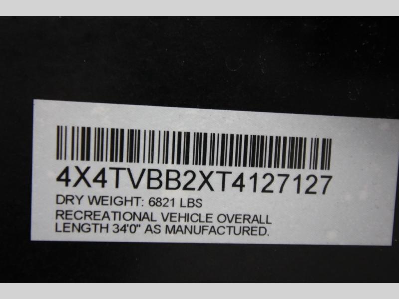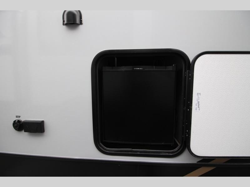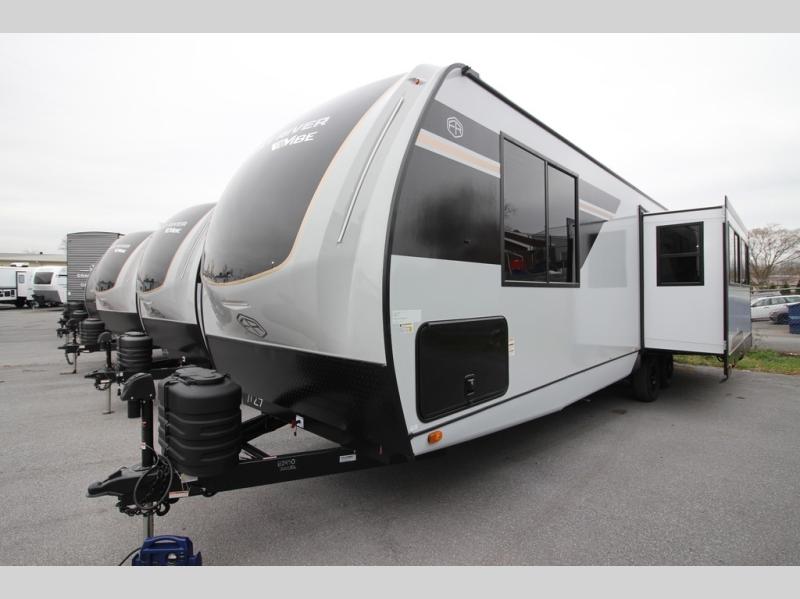 Escape to the great outdoors in this Vibe travel trailer. Once you arrive at your campsite, set up the 20' electric awning with LED lights, then grab the fishing poles from the large pass-through storage. You can make lunch on the electric oven/air fryer, and your food can be stored in the 12V refrigerator. The spacious full bath includes a 36" x 30" walk-in shower to clean up every day, and there is a linen closet to store clean towels and necessities.