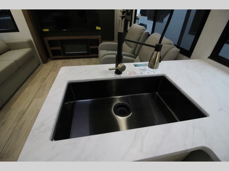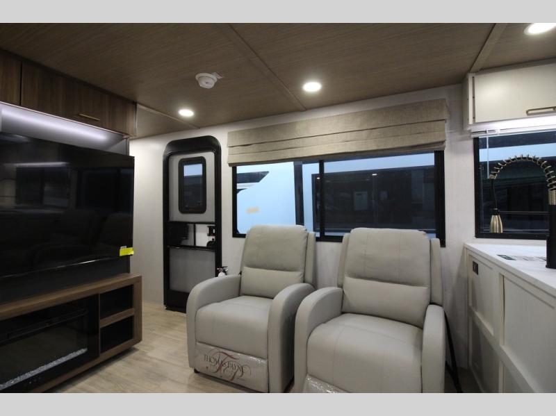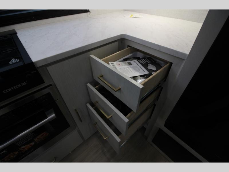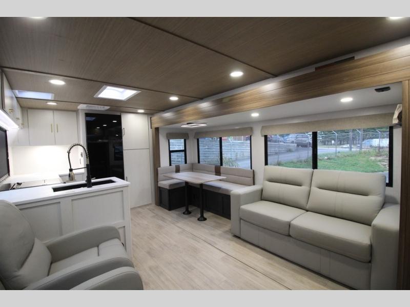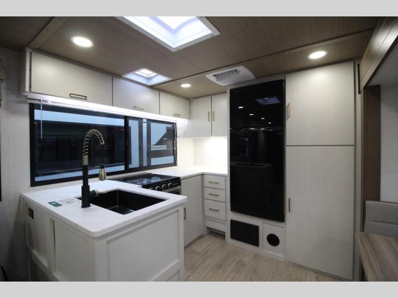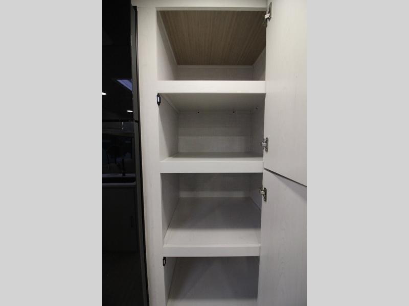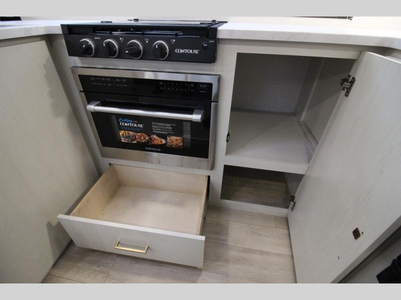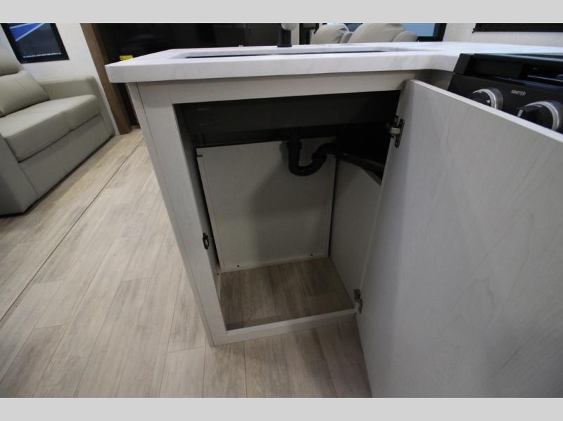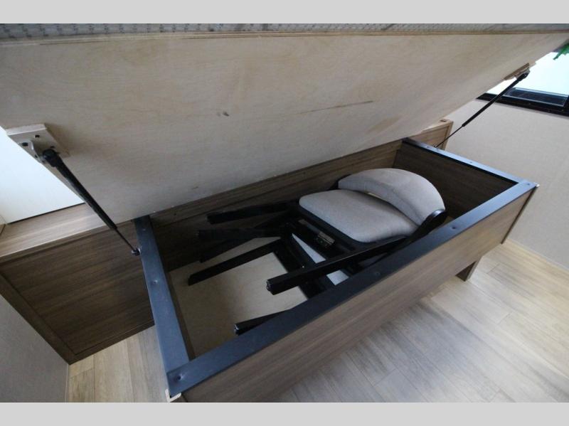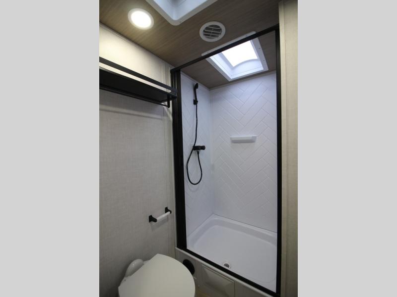 Escape to the great outdoors in this Vibe travel trailer. Once you arrive at your campsite, set up the 20' electric awning with LED lights, then grab the fishing poles from the large pass-through storage. You can make lunch on the electric oven/air fryer, and your food can be stored in the 12V refrigerator. The spacious full bath includes a 36" x 30" walk-in shower to clean up every day, and there is a linen closet to store clean towels and necessities.