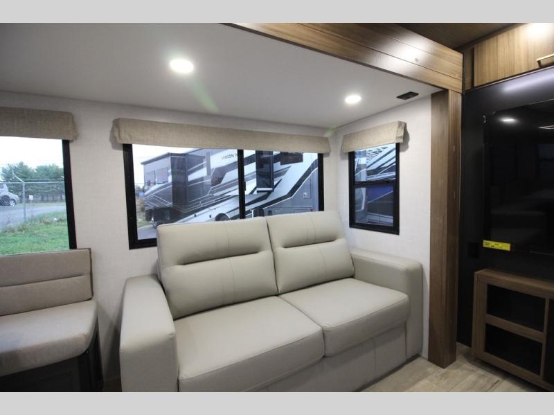 With any Vibe travel trailer by Forest River, you will enjoy comfort at every turn! There is a Norco huck-bolted steel frame, an enclosed underbelly with 12V heating pads, and a PVC roof membrane for added durability. You will also find a universal docking station outside, along with slam latch doors, European style square windows, and an automotive painted front cap. Head inside to enjoy the premium residential-style furniture, decorative window treatments, privacy shades in the living room and bedroom, and many more comforts!