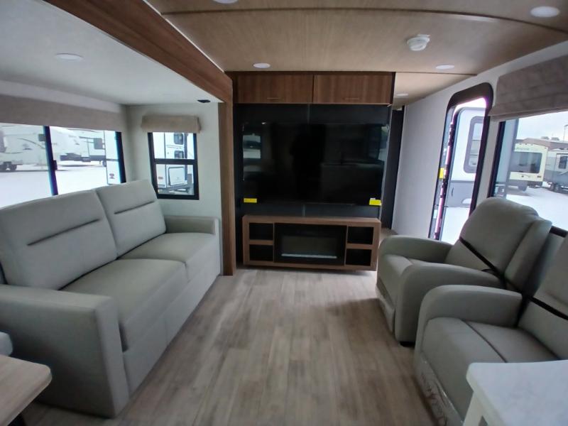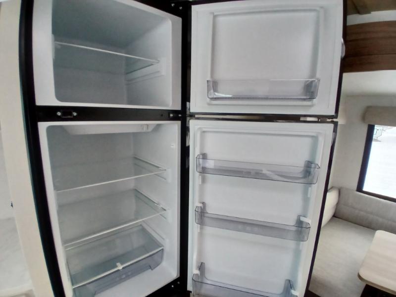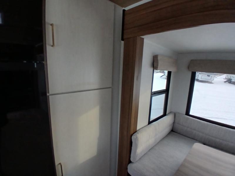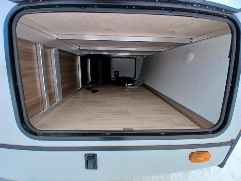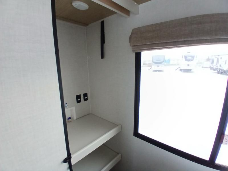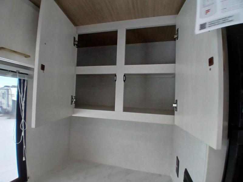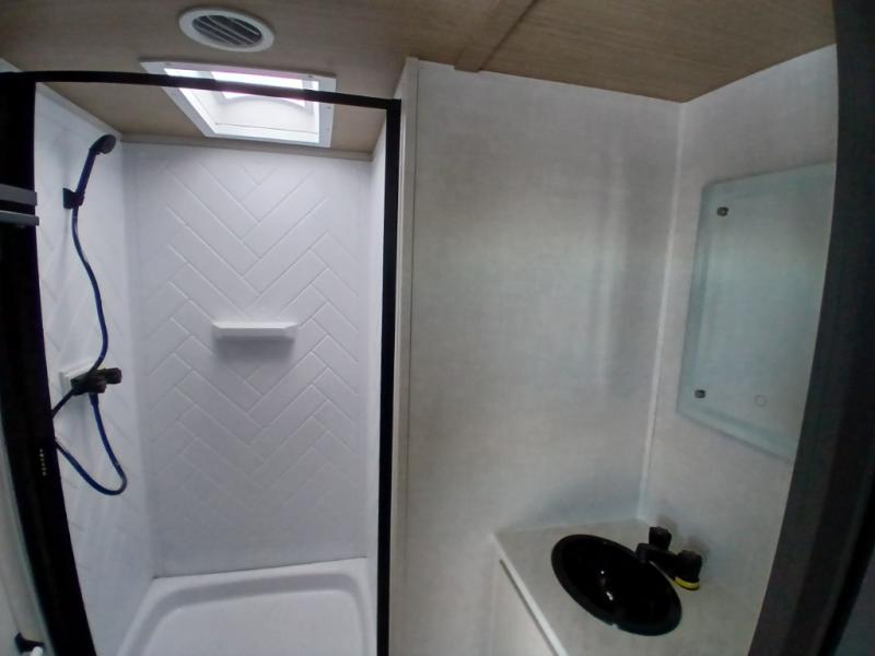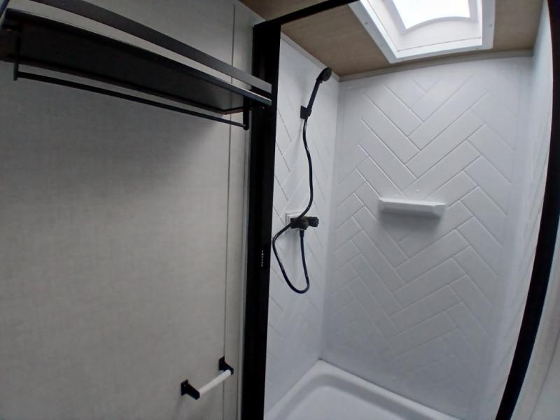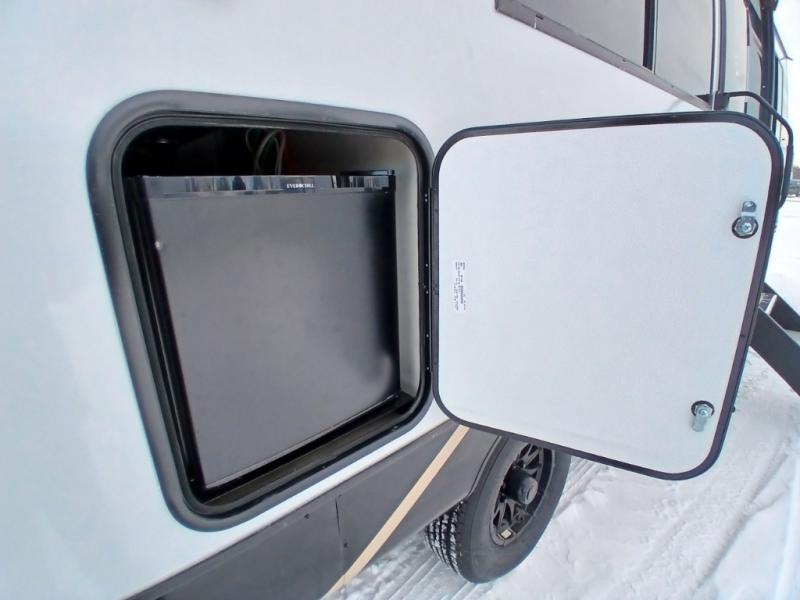 Escape to the great outdoors in this Vibe travel trailer. Once you arrive at your campsite, set up the 20' electric awning with LED lights, then grab the fishing poles from the large pass-through storage. You can make lunch on the electric oven/air fryer, and your food can be stored in the 12V refrigerator. The spacious full bath includes a 36" x 30" walk-in shower to clean up every day, and there is a linen closet to store clean towels and necessities.