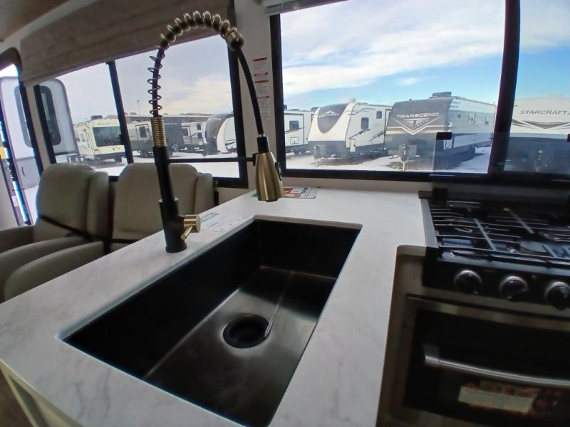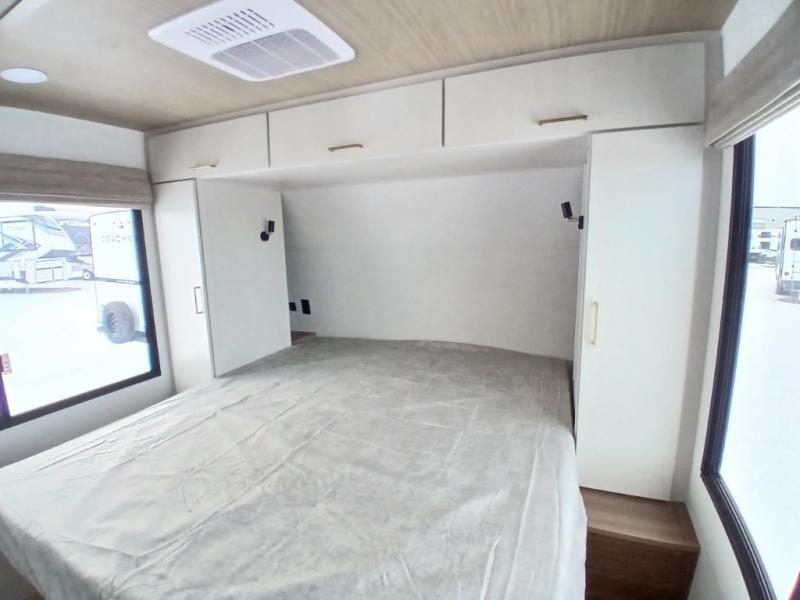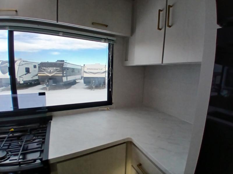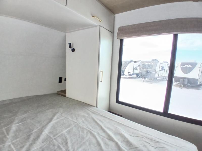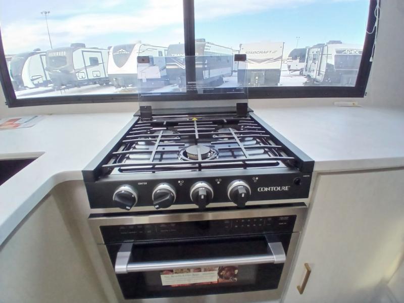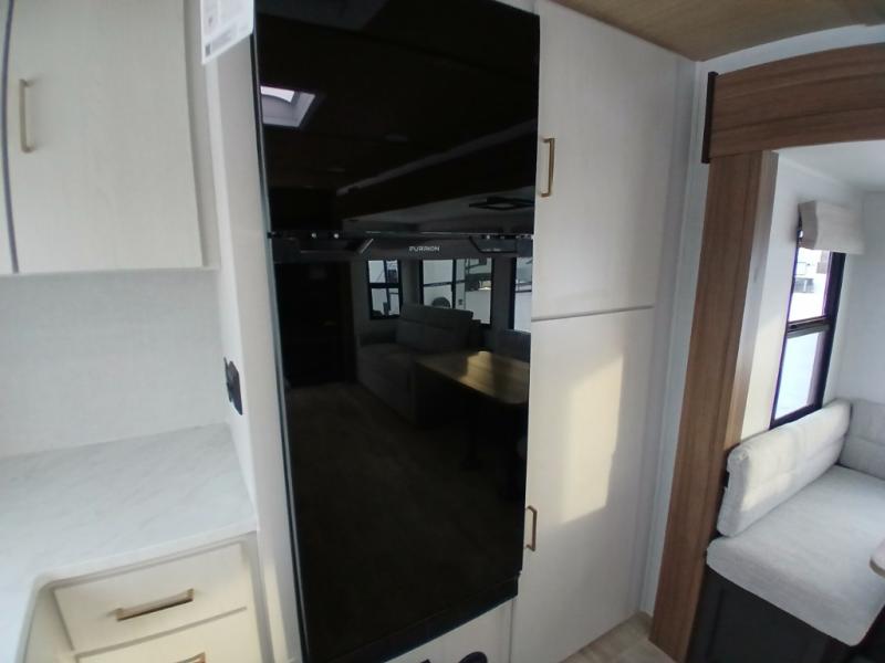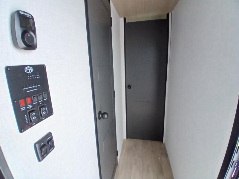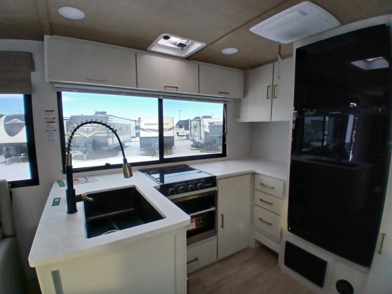 Escape to the great outdoors in this Vibe travel trailer. Once you arrive at your campsite, set up the 20' electric awning with LED lights, then grab the fishing poles from the large pass-through storage. You can make lunch on the electric oven/air fryer, and your food can be stored in the 12V refrigerator. The spacious full bath includes a 36" x 30" walk-in shower to clean up every day, and there is a linen closet to store clean towels and necessities.