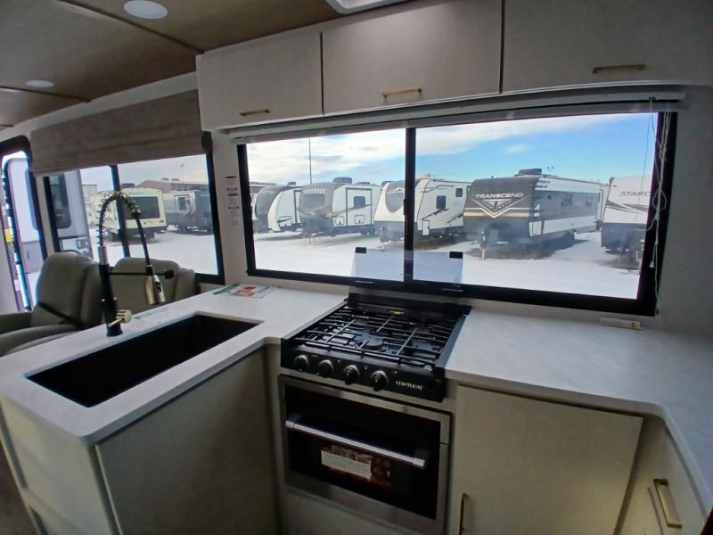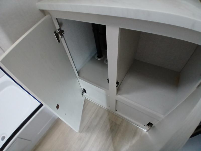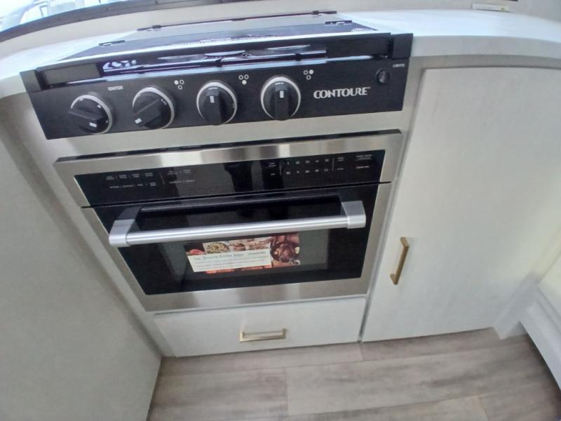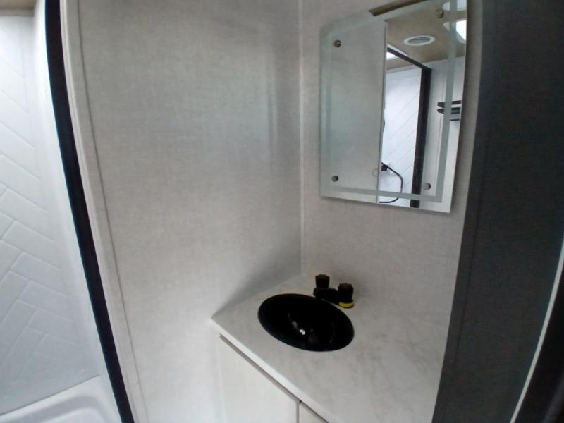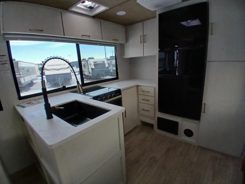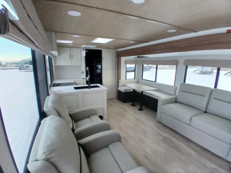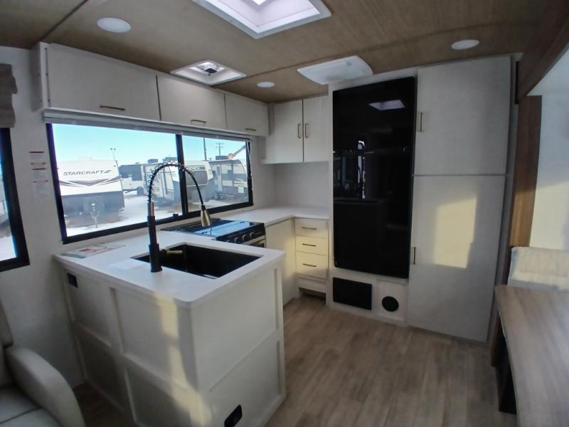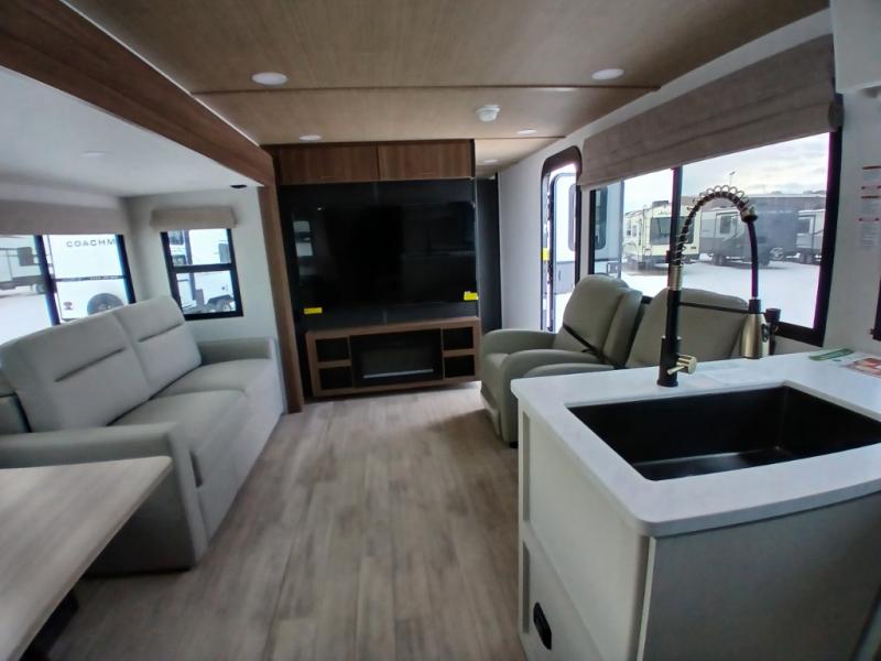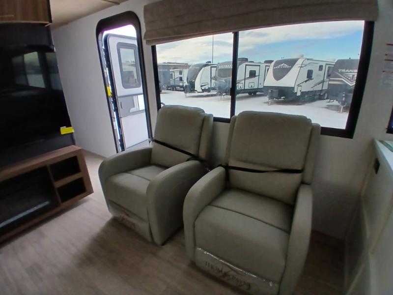 Escape to the great outdoors in this Vibe travel trailer. Once you arrive at your campsite, set up the 20' electric awning with LED lights, then grab the fishing poles from the large pass-through storage. You can make lunch on the electric oven/air fryer, and your food can be stored in the 12V refrigerator. The spacious full bath includes a 36" x 30" walk-in shower to clean up every day, and there is a linen closet to store clean towels and necessities.