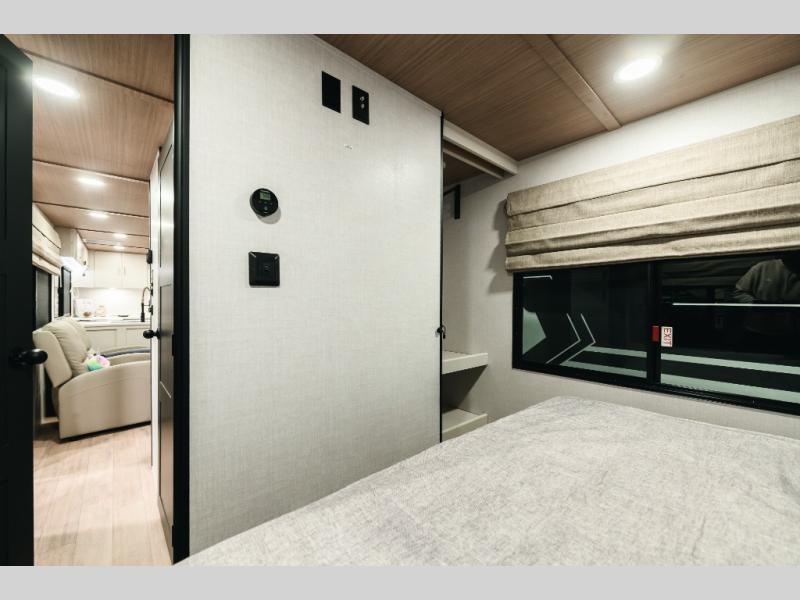 Escape to the great outdoors in this Vibe travel trailer. Once you arrive at your campsite, set up the 20' electric awning with LED lights, then grab the fishing poles from the large pass-through storage. You can make lunch on the electric oven/air fryer, and your food can be stored in the 12V refrigerator. The spacious full bath includes a 36" x 30" walk-in shower to clean up every day, and there is a linen closet to store clean towels and necessities.