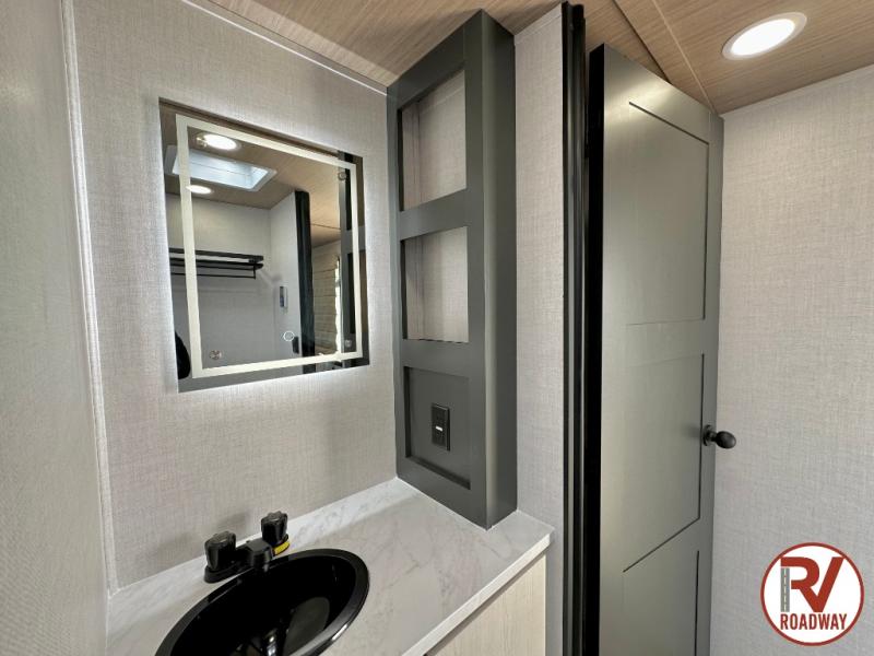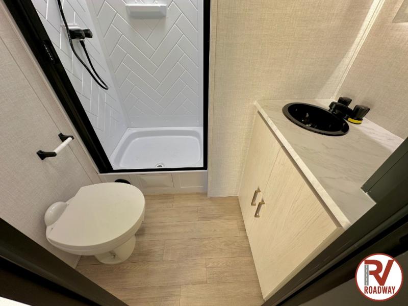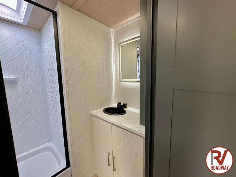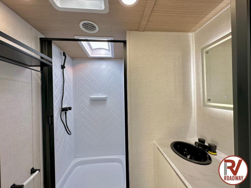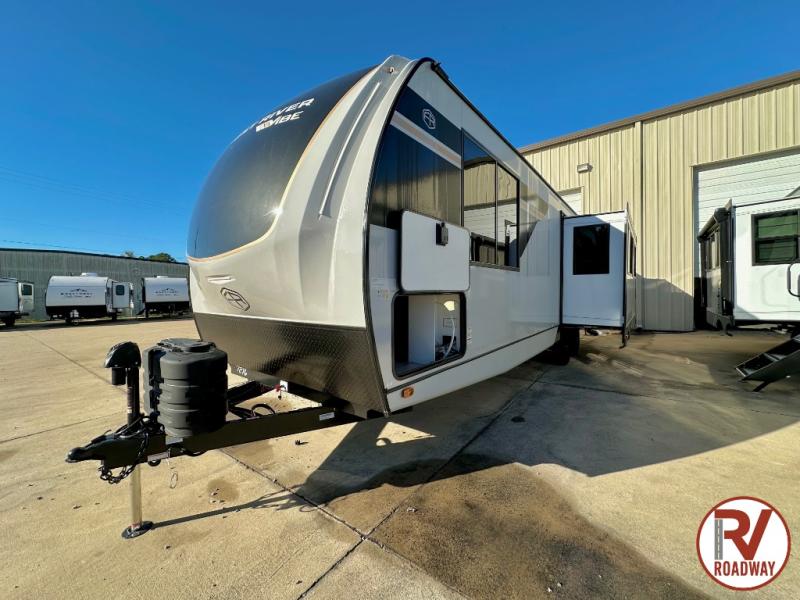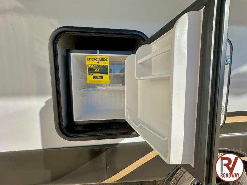 Escape to the great outdoors in this Vibe travel trailer. Once you arrive at your campsite, set up the 20' electric awning with LED lights, then grab the fishing poles from the large pass-through storage. You can make lunch on the electric oven/air fryer, and your food can be stored in the 12V refrigerator. The spacious full bath includes a 36" x 30" walk-in shower to clean up every day, and there is a linen closet to store clean towels and necessities.