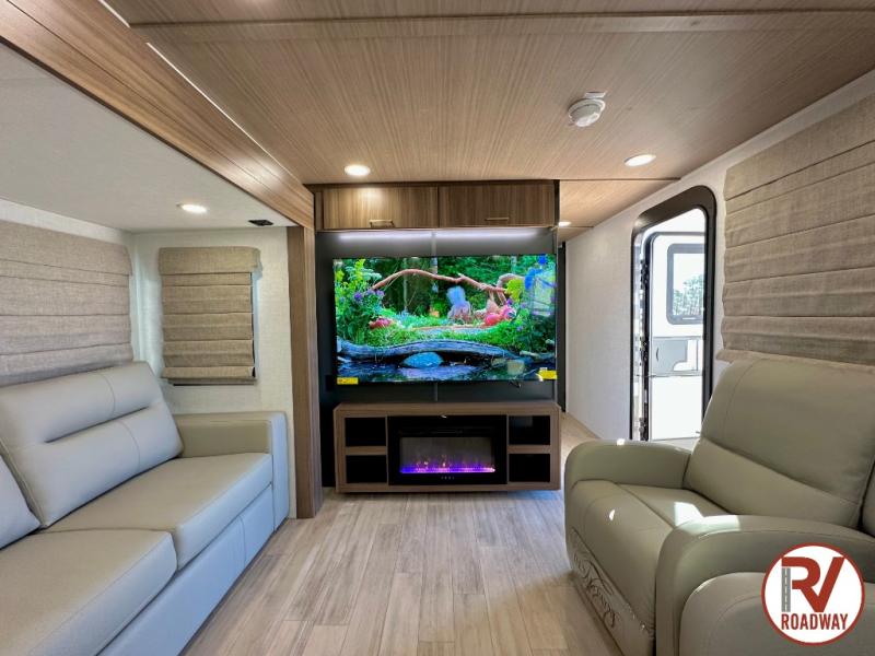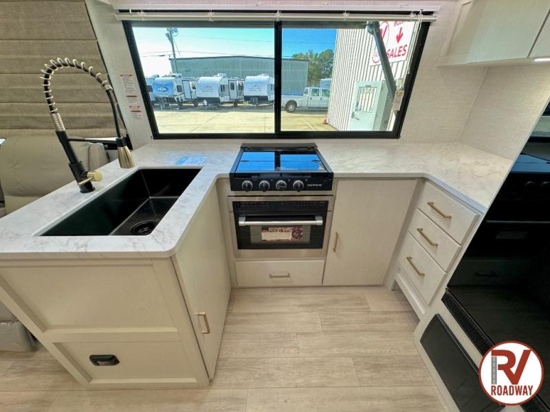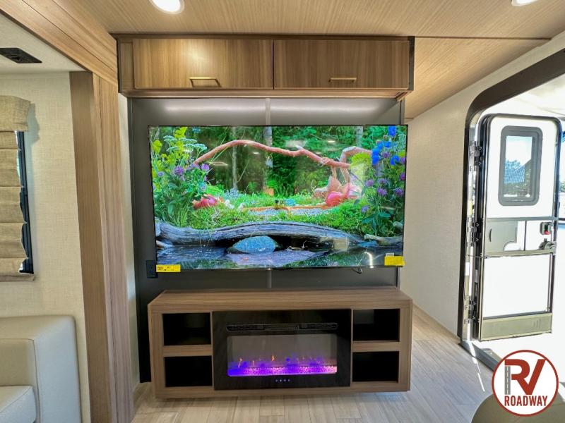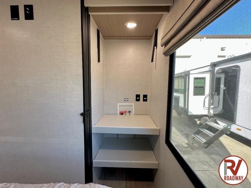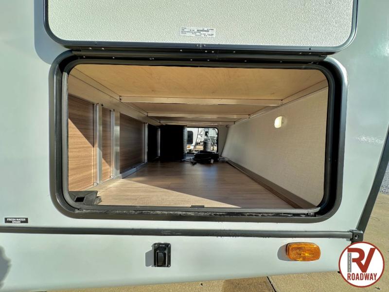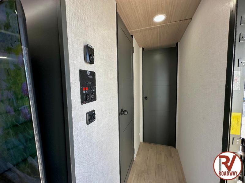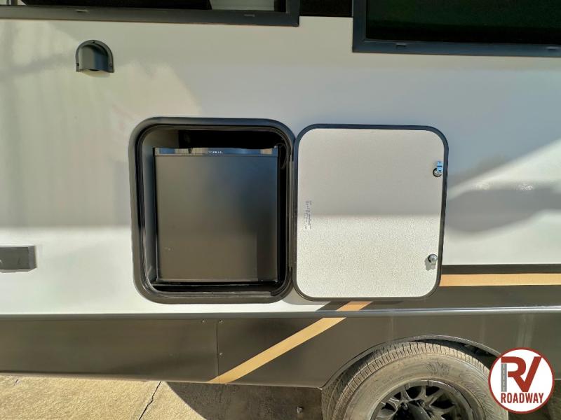 Escape to the great outdoors in this Vibe travel trailer. Once you arrive at your campsite, set up the 20' electric awning with LED lights, then grab the fishing poles from the large pass-through storage. You can make lunch on the electric oven/air fryer, and your food can be stored in the 12V refrigerator. The spacious full bath includes a 36" x 30" walk-in shower to clean up every day, and there is a linen closet to store clean towels and necessities.