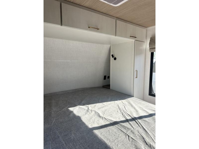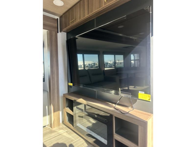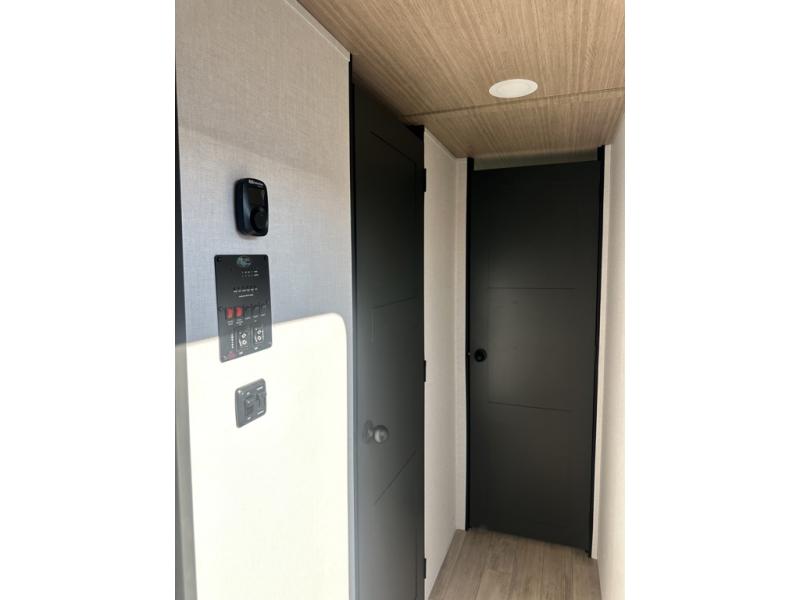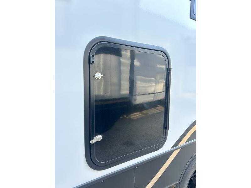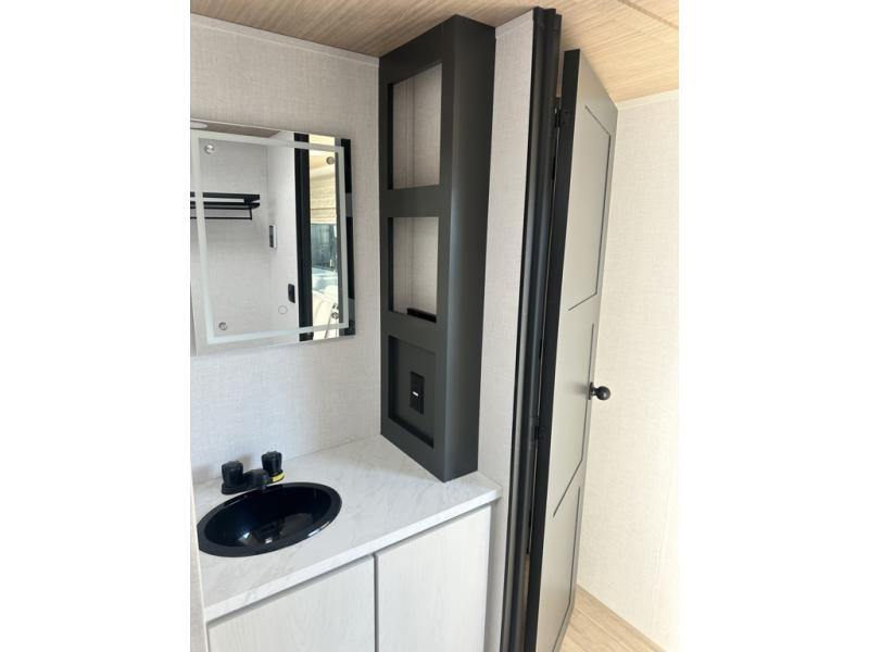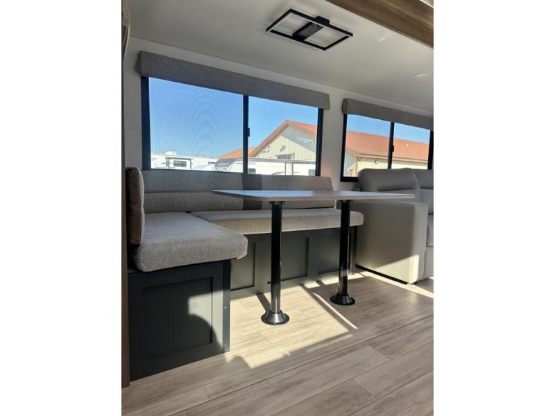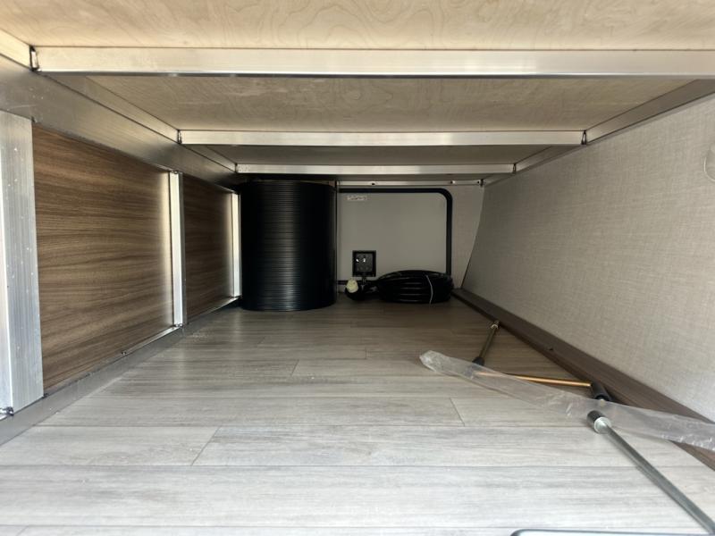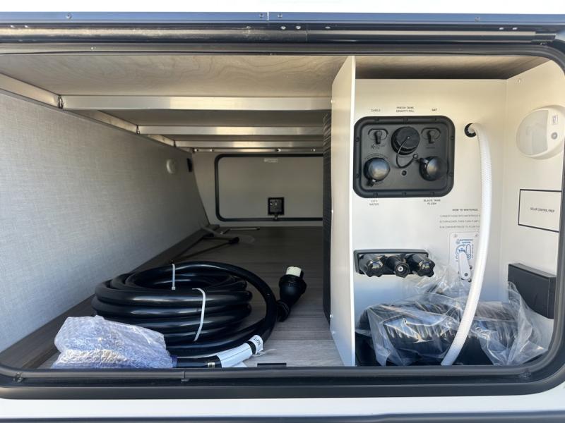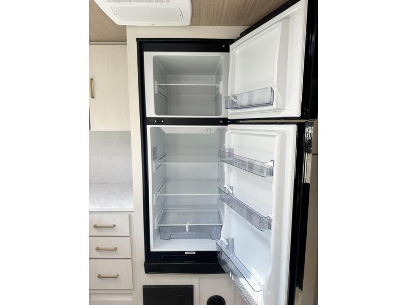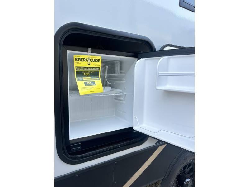Escape to the great outdoors in this Vibe travel trailer. Once you arrive at your campsite, set up the 20' electric awning with LED lights, then grab the fishing poles from the large pass-through storage. You can make lunch on the electric oven/air fryer, and your food can be stored in the 12V refrigerator. The spacious full bath includes a 36" x 30" walk-in shower to clean up every day, and there is a linen closet to store clean towels and necessities.