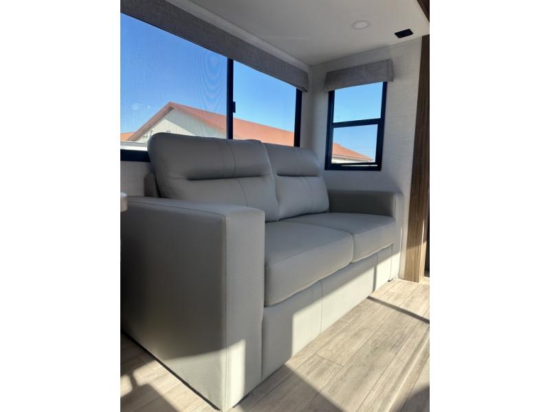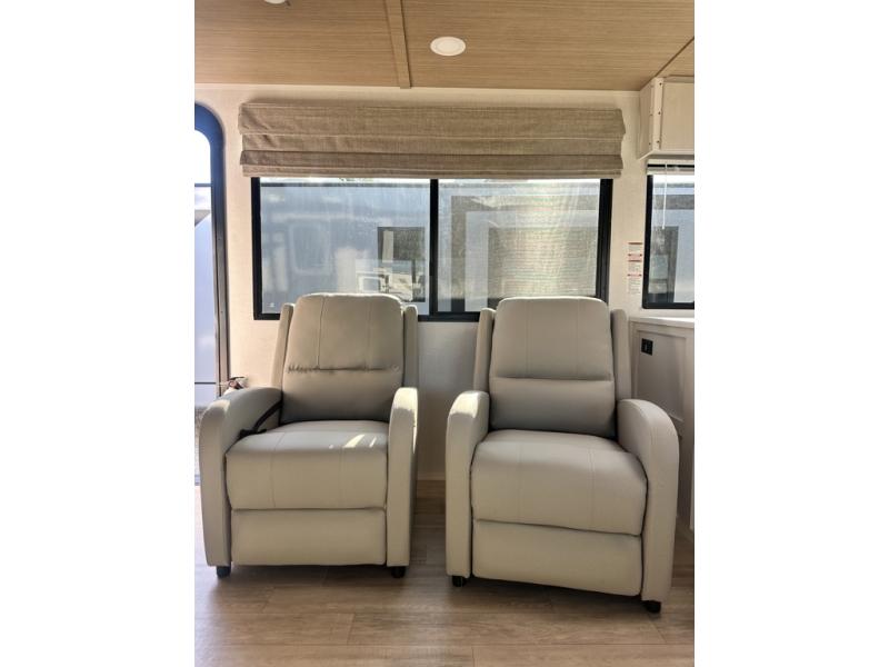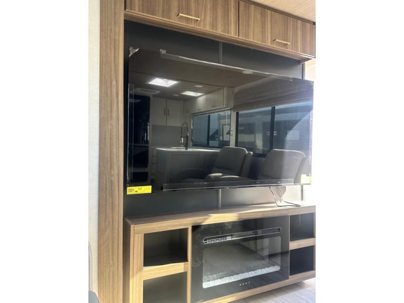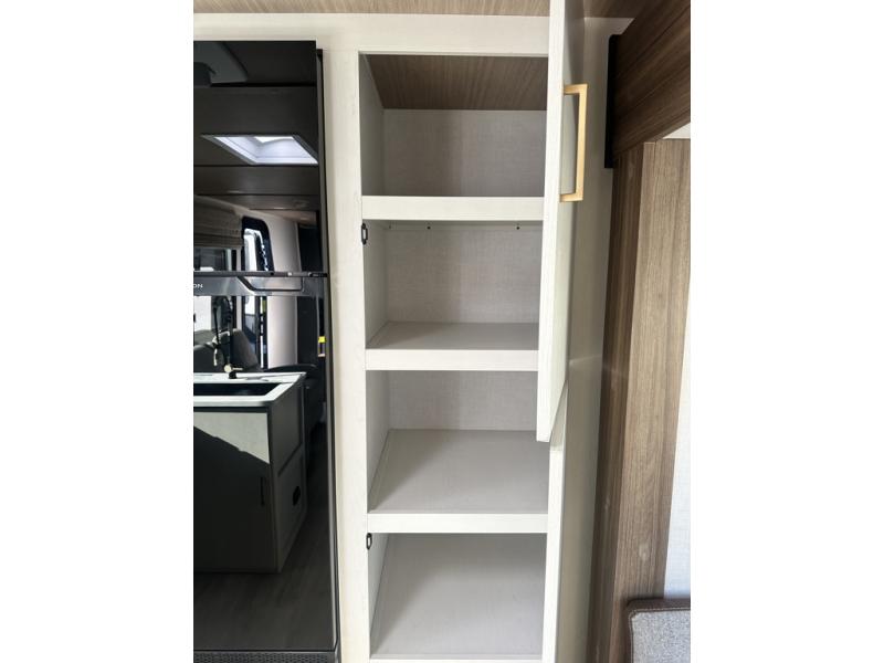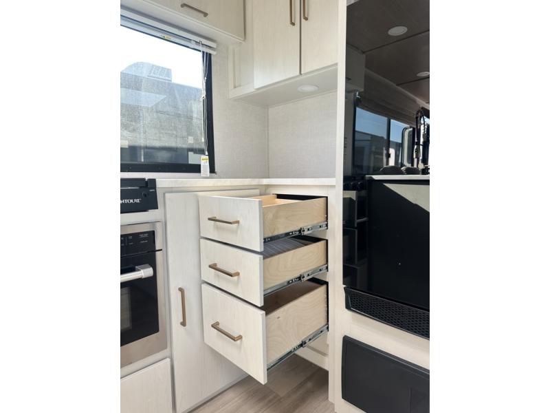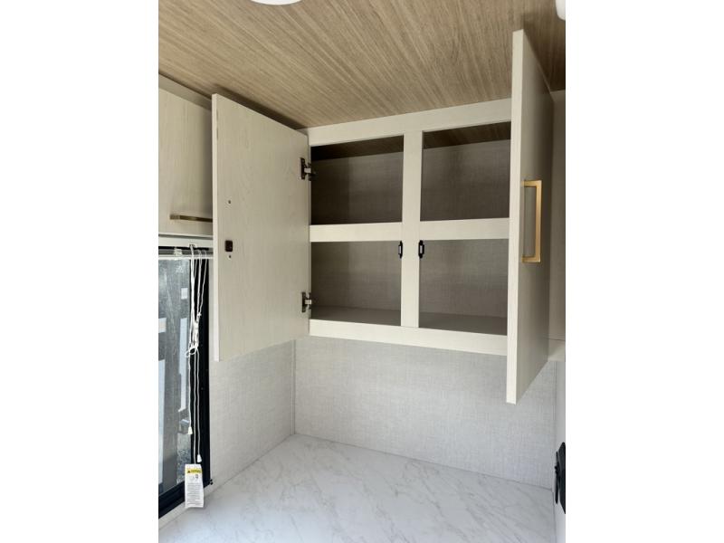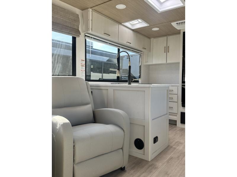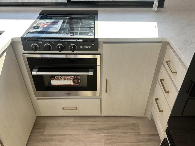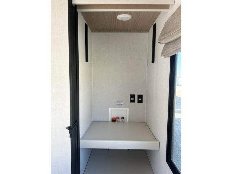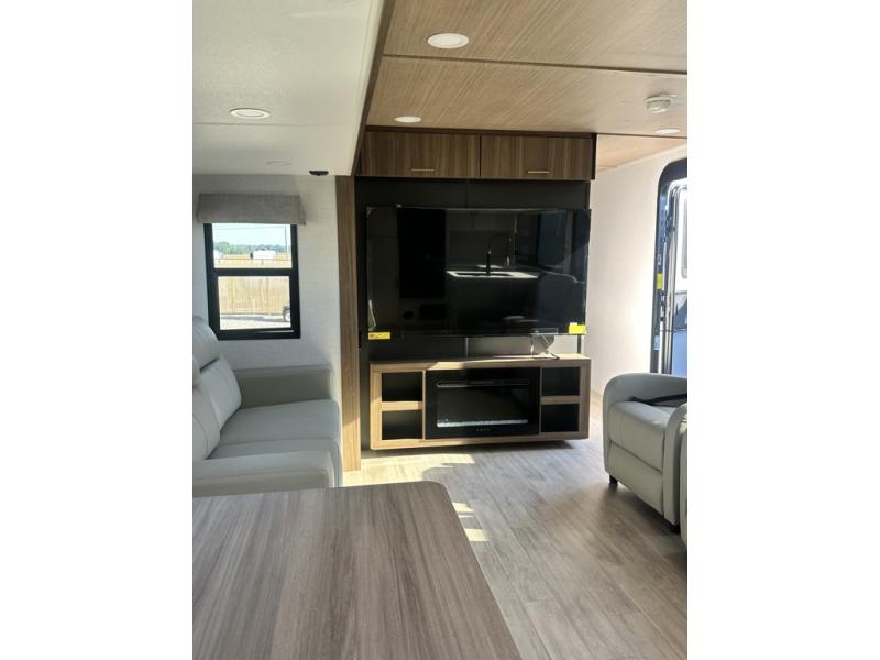 Escape to the great outdoors in this Vibe travel trailer. Once you arrive at your campsite, set up the 20' electric awning with LED lights, then grab the fishing poles from the large pass-through storage. You can make lunch on the electric oven/air fryer, and your food can be stored in the 12V refrigerator. The spacious full bath includes a 36" x 30" walk-in shower to clean up every day, and there is a linen closet to store clean towels and necessities.