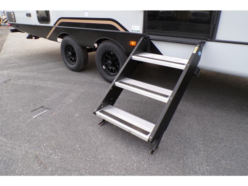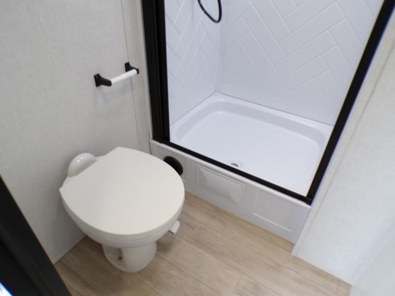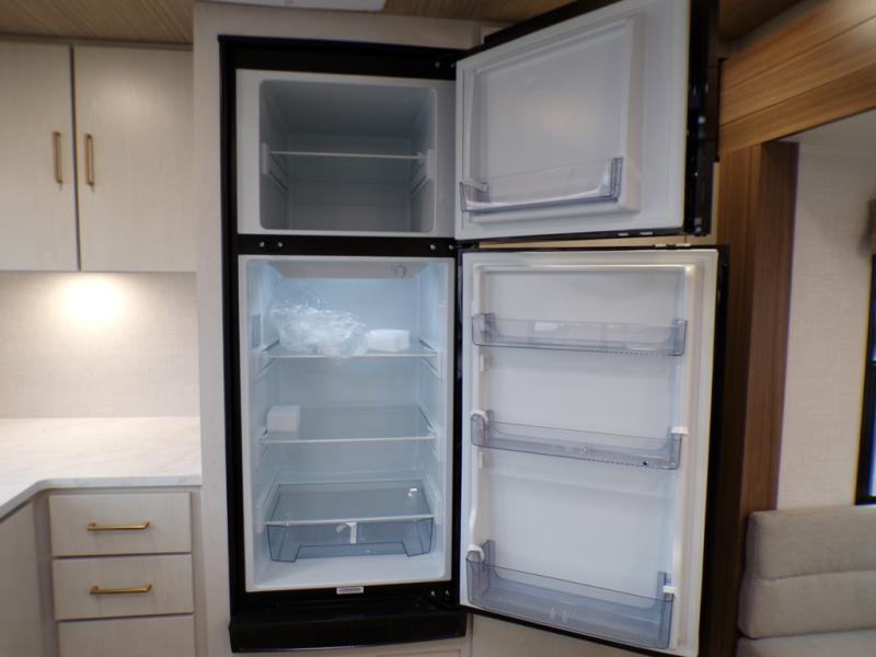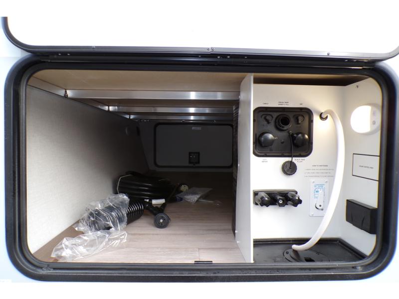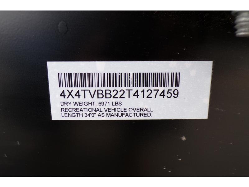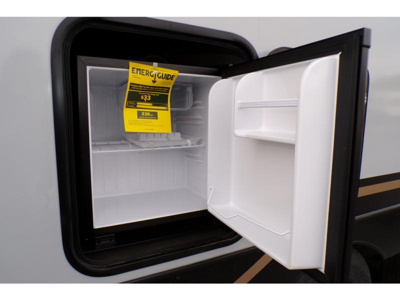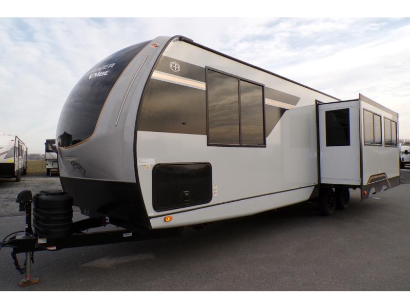 Escape to the great outdoors in this Vibe travel trailer. Once you arrive at your campsite, set up the 20' electric awning with LED lights, then grab the fishing poles from the large pass-through storage. You can make lunch on the electric oven/air fryer, and your food can be stored in the 12V refrigerator. The spacious full bath includes a 36" x 30" walk-in shower to clean up every day, and there is a linen closet to store clean towels and necessities.