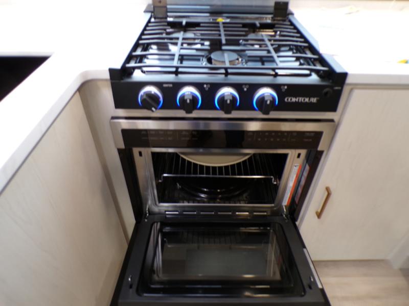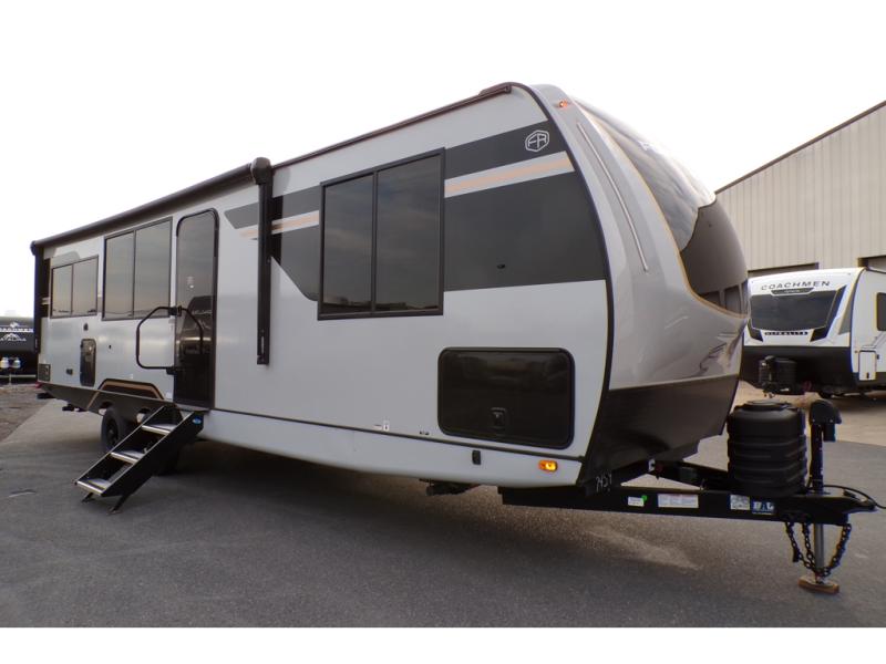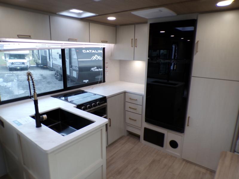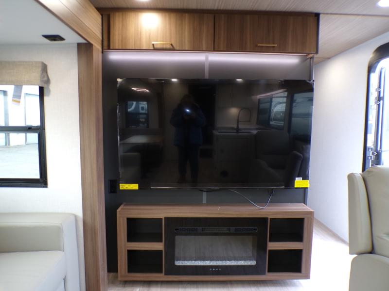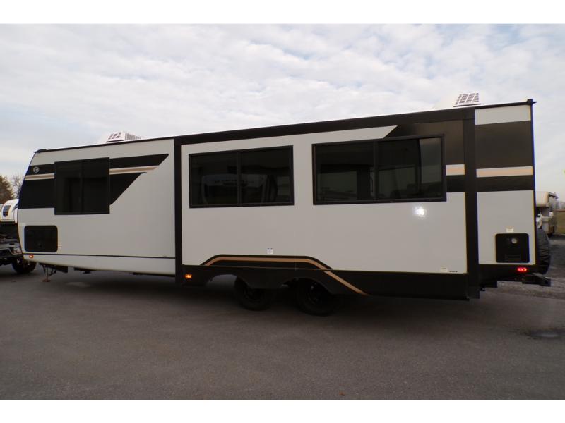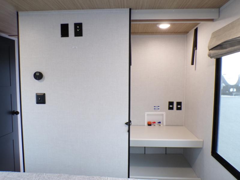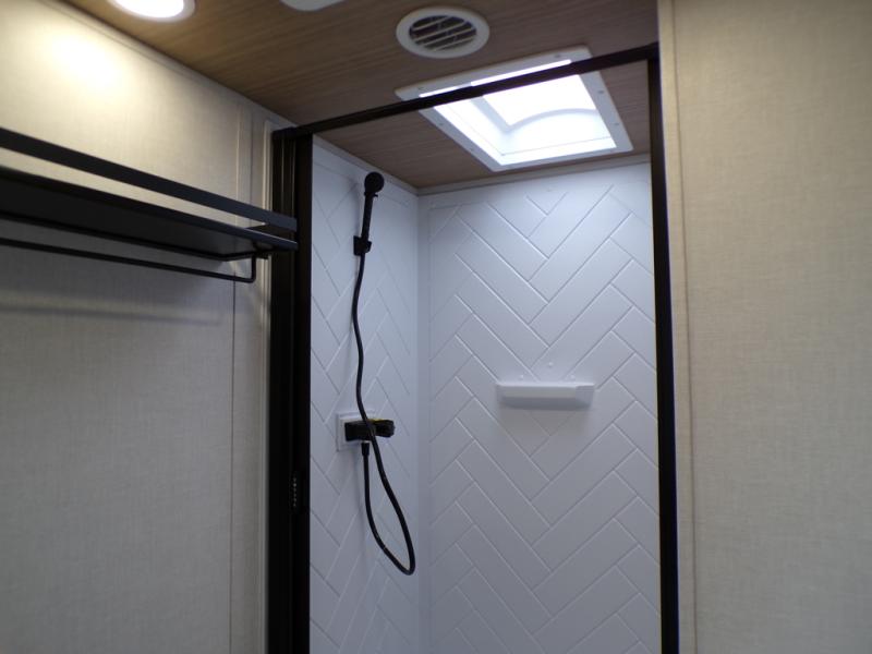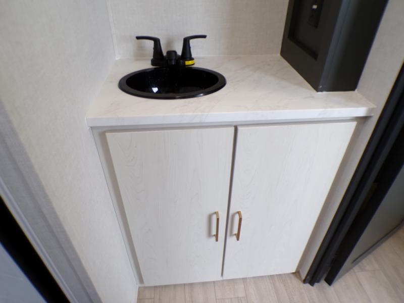 Escape to the great outdoors in this Vibe travel trailer. Once you arrive at your campsite, set up the 20' electric awning with LED lights, then grab the fishing poles from the large pass-through storage. You can make lunch on the electric oven/air fryer, and your food can be stored in the 12V refrigerator. The spacious full bath includes a 36" x 30" walk-in shower to clean up every day, and there is a linen closet to store clean towels and necessities.