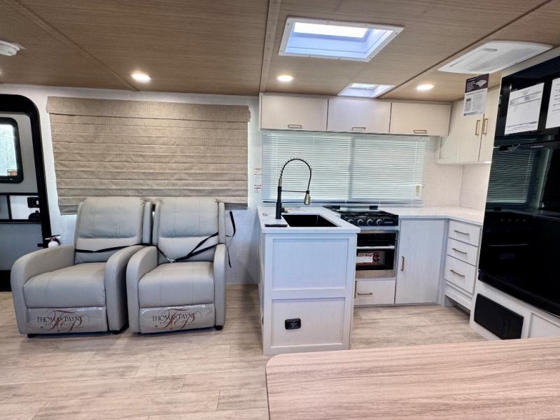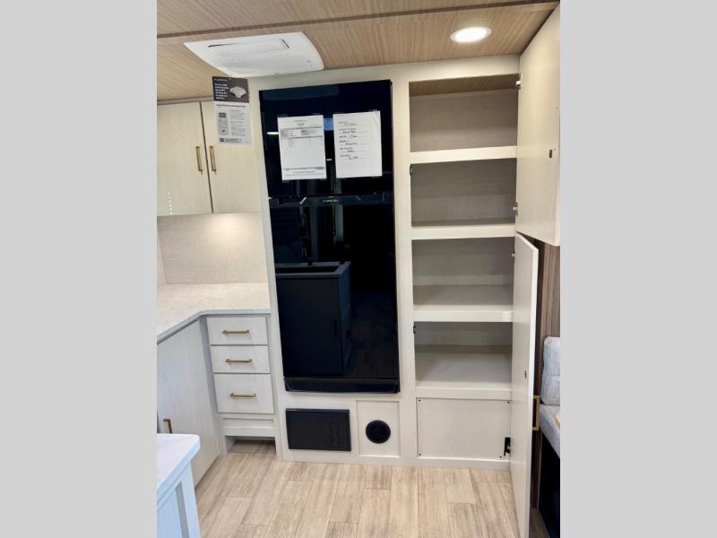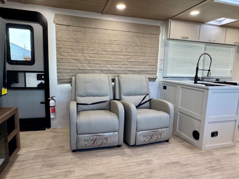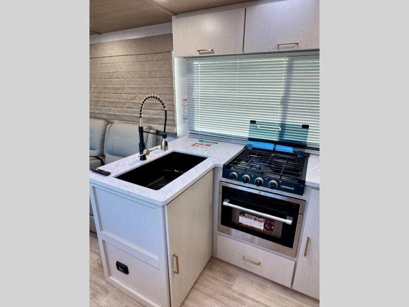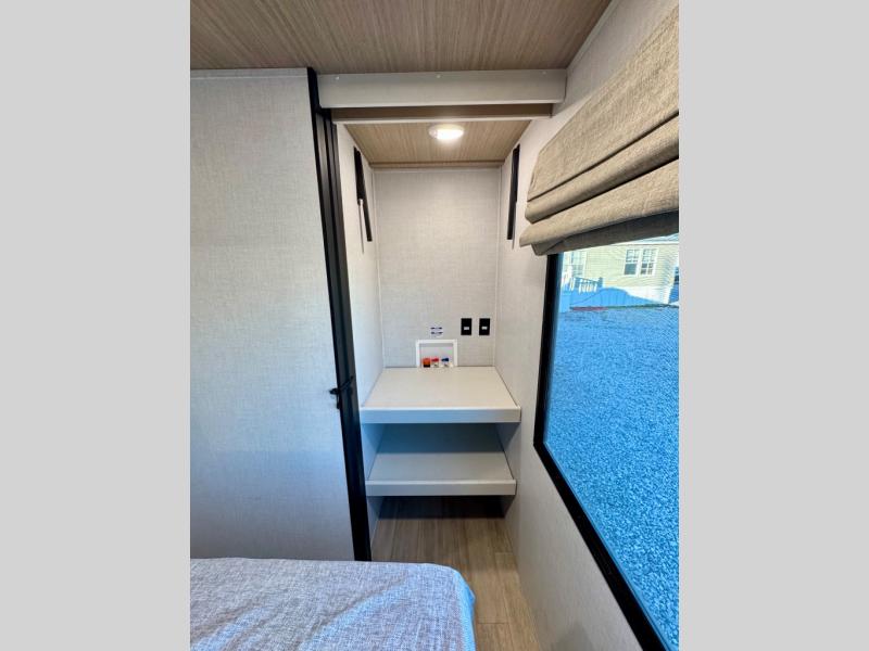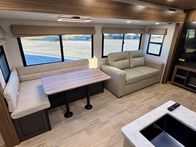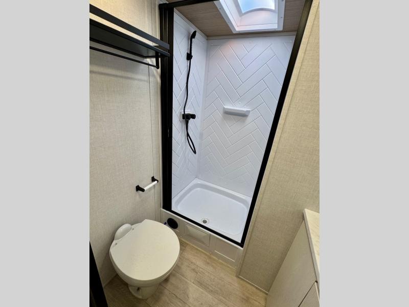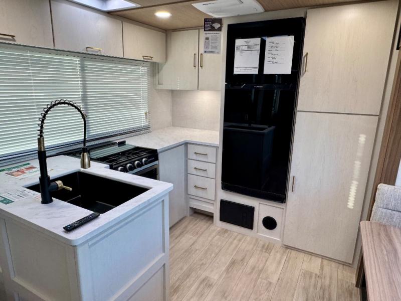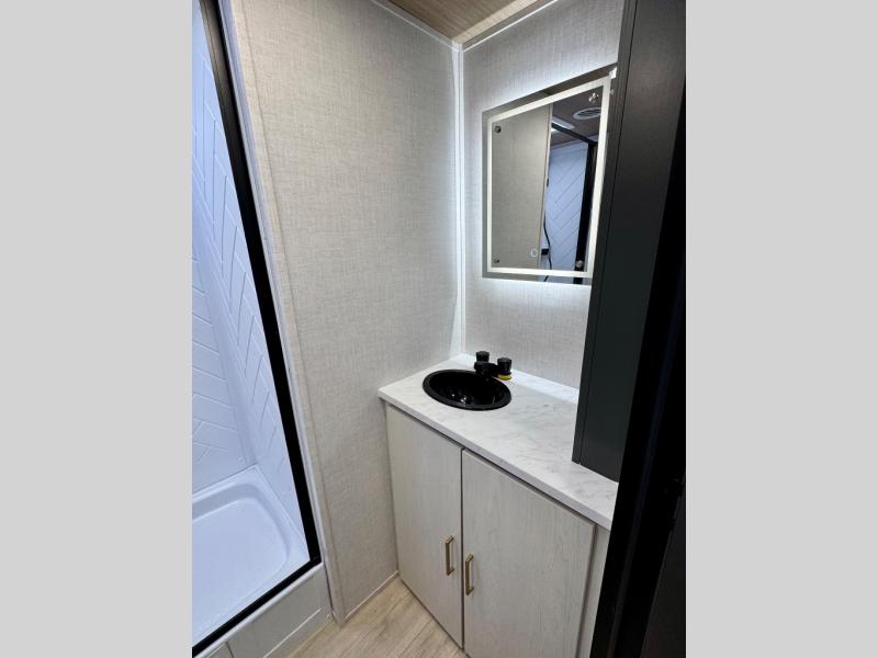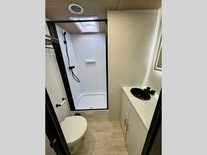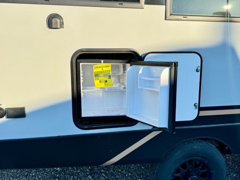 Escape to the great outdoors in this Vibe travel trailer. Once you arrive at your campsite, set up the 20' electric awning with LED lights, then grab the fishing poles from the large pass-through storage. You can make lunch on the electric oven/air fryer, and your food can be stored in the 12V refrigerator. The spacious full bath includes a 36" x 30" walk-in shower to clean up every day, and there is a linen closet to store clean towels and necessities.