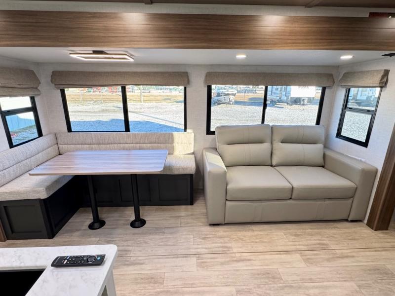 With any Vibe travel trailer by Forest River, you will enjoy comfort at every turn! There is a Norco huck-bolted steel frame, an enclosed underbelly with 12V heating pads, and a PVC roof membrane for added durability. You will also find a universal docking station outside, along with slam latch doors, European style square windows, and an automotive painted front cap. Head inside to enjoy the premium residential-style furniture, decorative window treatments, privacy shades in the living room and bedroom, and many more comforts!