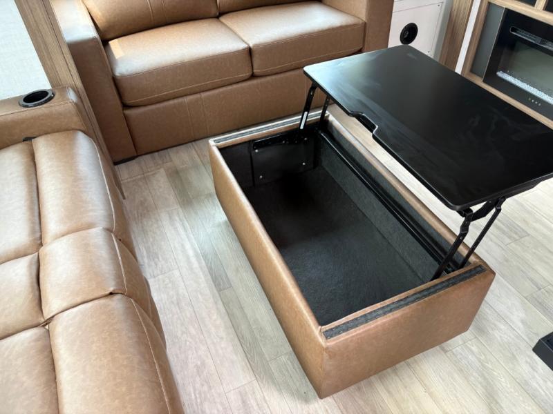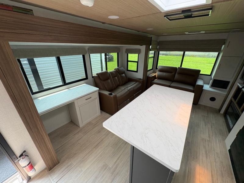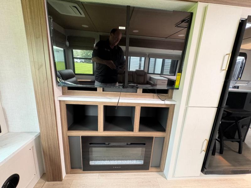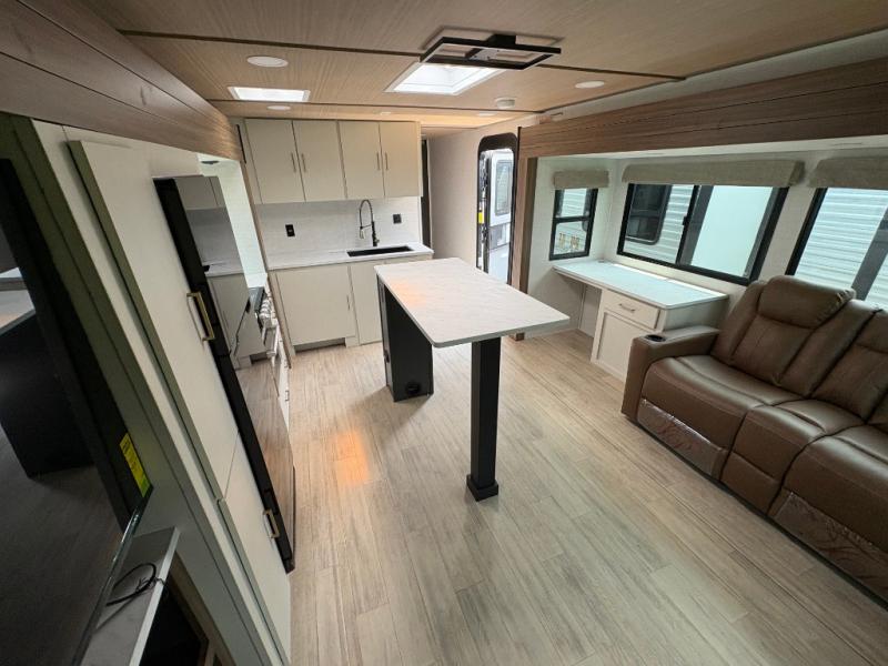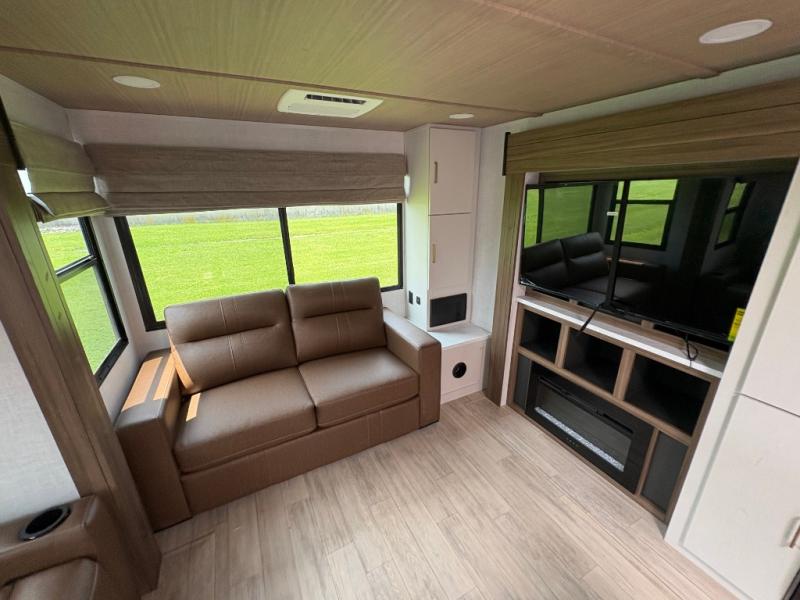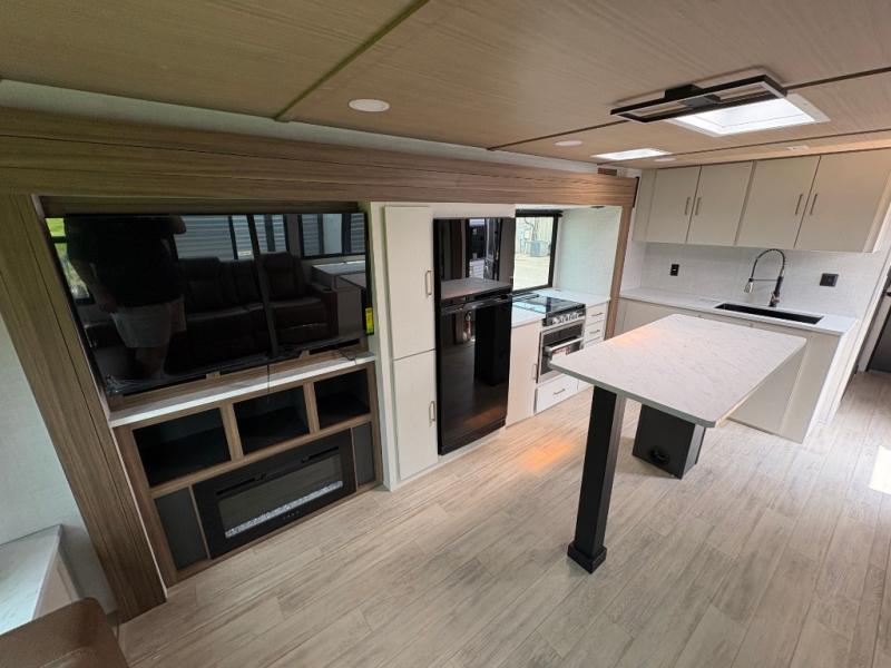 This travel trailer allows you to enjoy the great outdoors without having to give up your creature comforts. The dual opposing slides provide the chef space to work around the kitchen island, and there is plenty of seating space for your guests on the theater seating or the sleeper sofa, plus there's a desk area with chair so you can work on the go. The fireplace with a TV above will be perfect for those rainy days, and there is even a large skylight to let natural light into the living room. This model also includes Sure-Step entry steps, pass-through storage, plus two power awnings with LED lights so you can spend more time outdoors with friends and family!