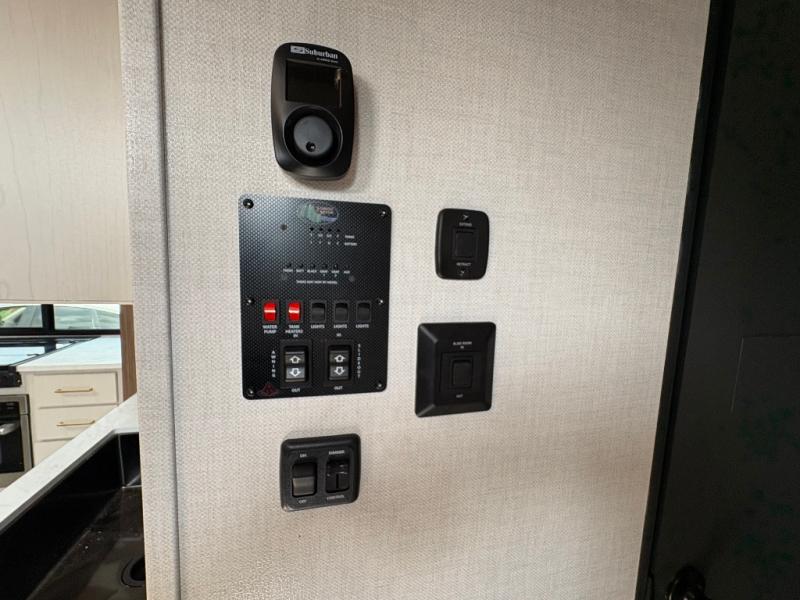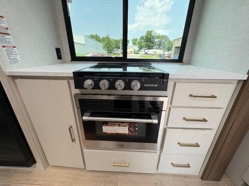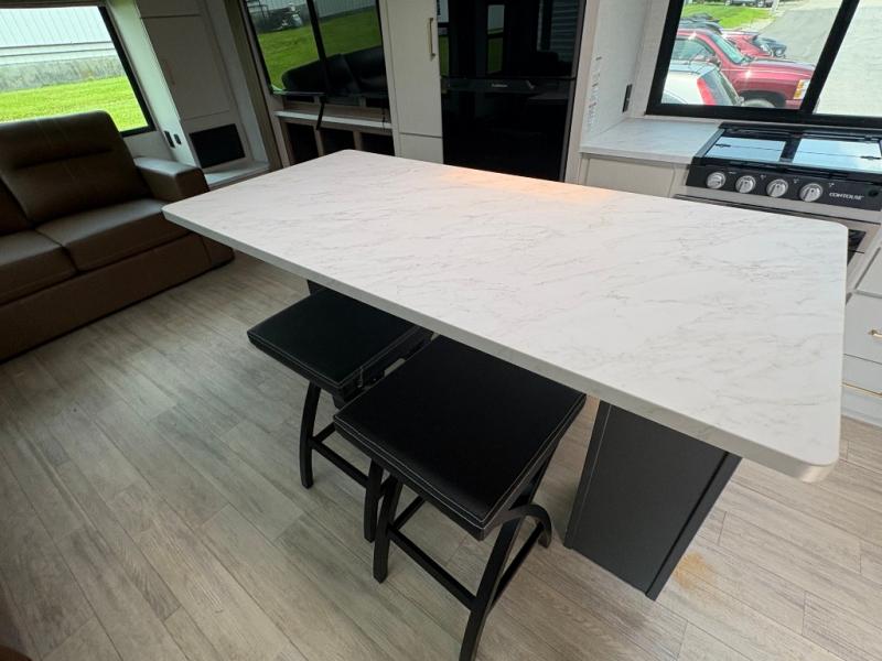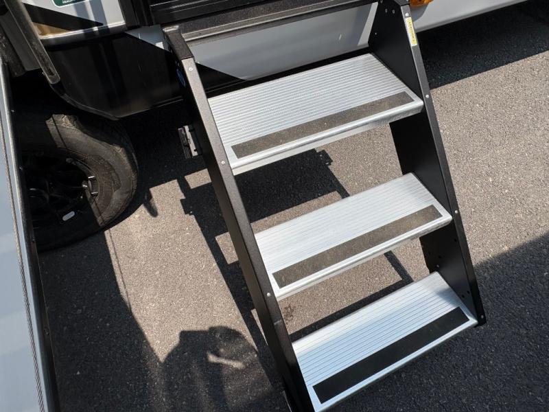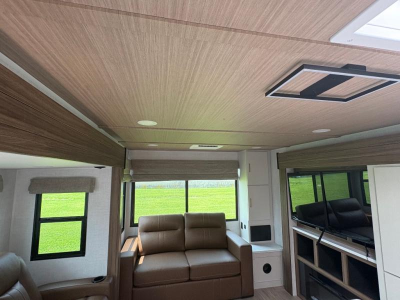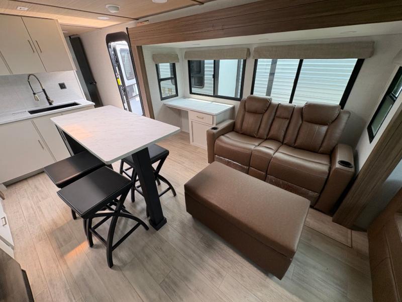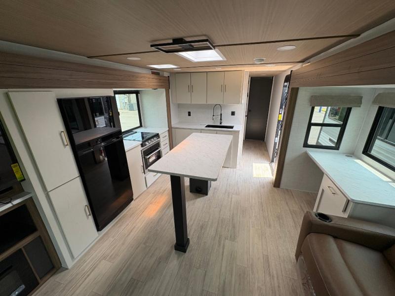 This travel trailer allows you to enjoy the great outdoors without having to give up your creature comforts. The dual opposing slides provide the chef space to work around the kitchen island, and there is plenty of seating space for your guests on the theater seating or the sleeper sofa, plus there's a desk area with chair so you can work on the go. The fireplace with a TV above will be perfect for those rainy days, and there is even a large skylight to let natural light into the living room. This model also includes Sure-Step entry steps, pass-through storage, plus two power awnings with LED lights so you can spend more time outdoors with friends and family!