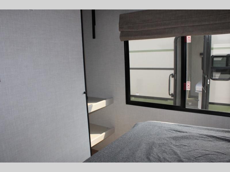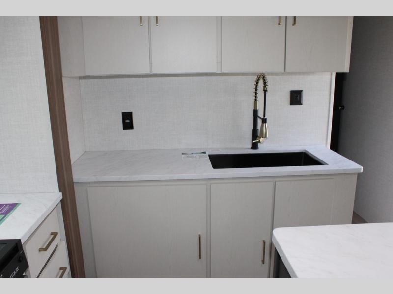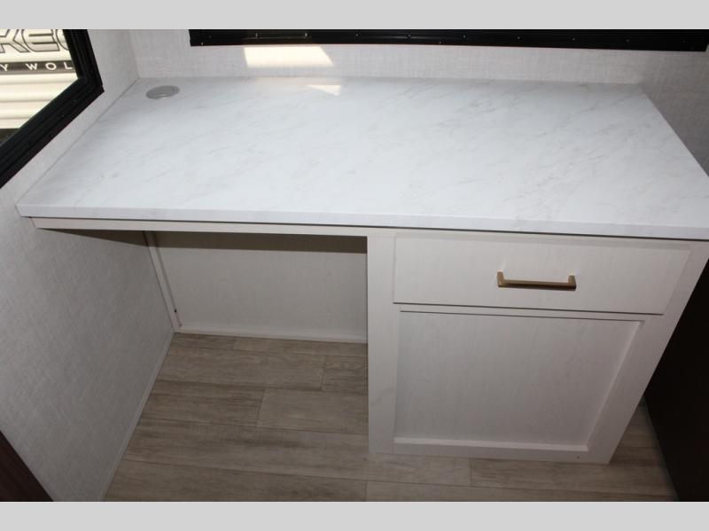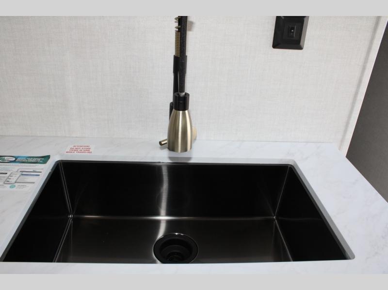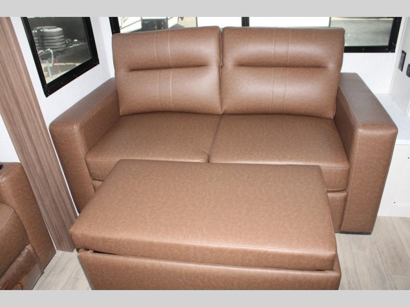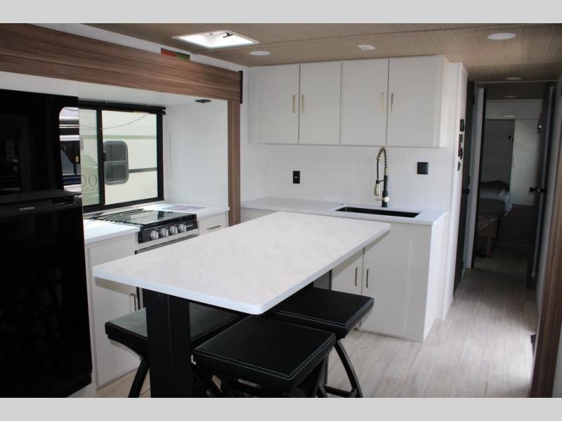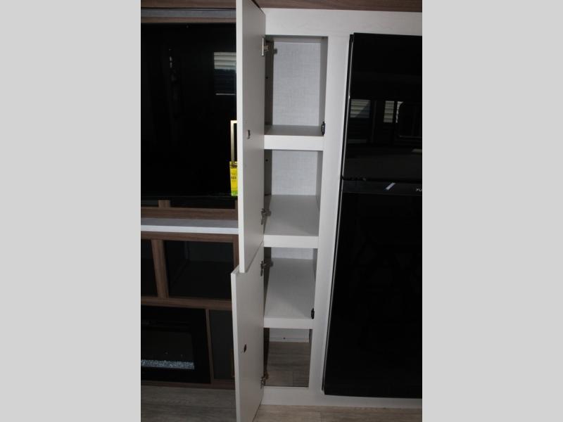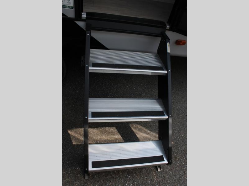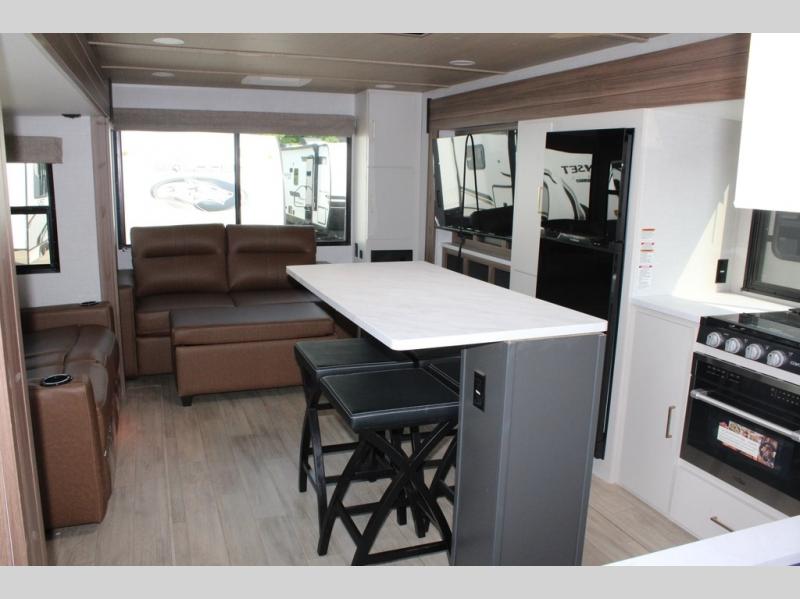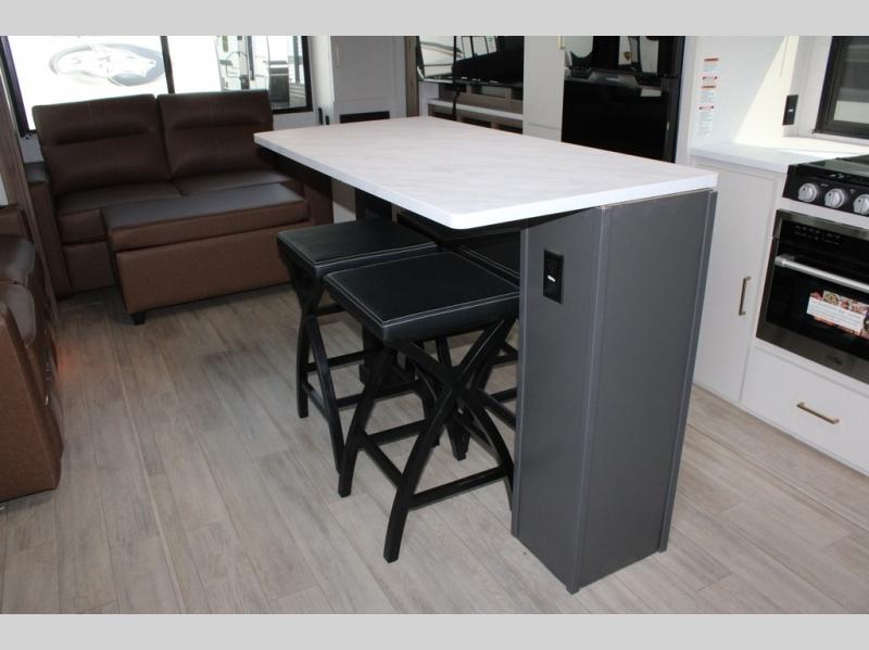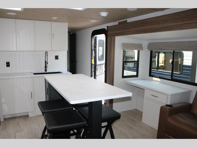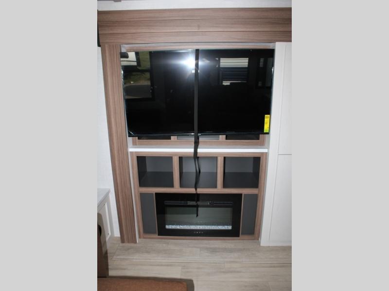 This travel trailer allows you to enjoy the great outdoors without having to give up your creature comforts. The dual opposing slides provide the chef space to work around the kitchen island, and there is plenty of seating space for your guests on the theater seating or the sleeper sofa, plus there's a desk area with chair so you can work on the go. The fireplace with a TV above will be perfect for those rainy days, and there is even a large skylight to let natural light into the living room. This model also includes Sure-Step entry steps, pass-through storage, plus two power awnings with LED lights so you can spend more time outdoors with friends and family!
