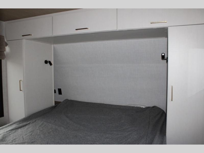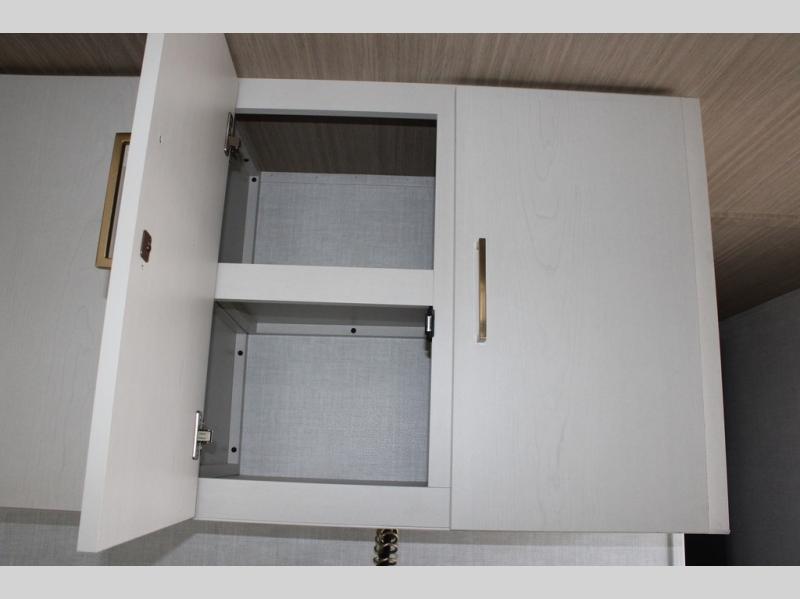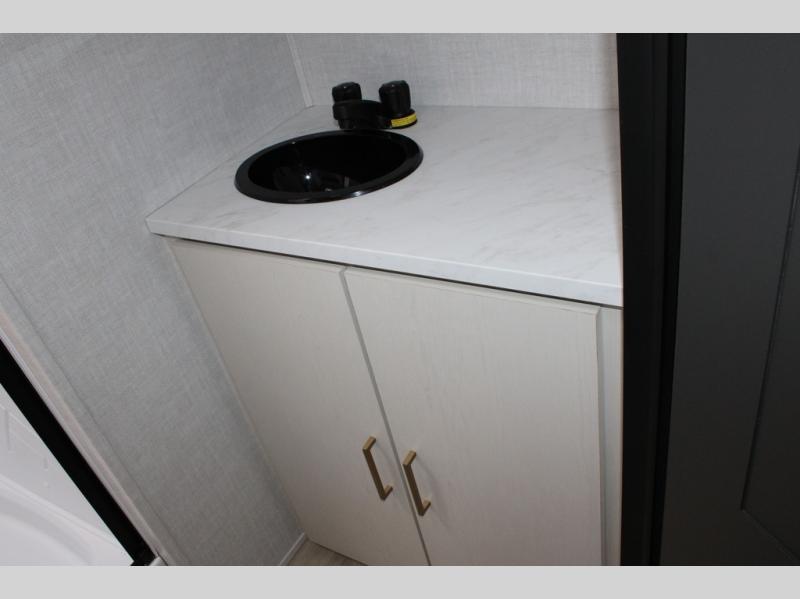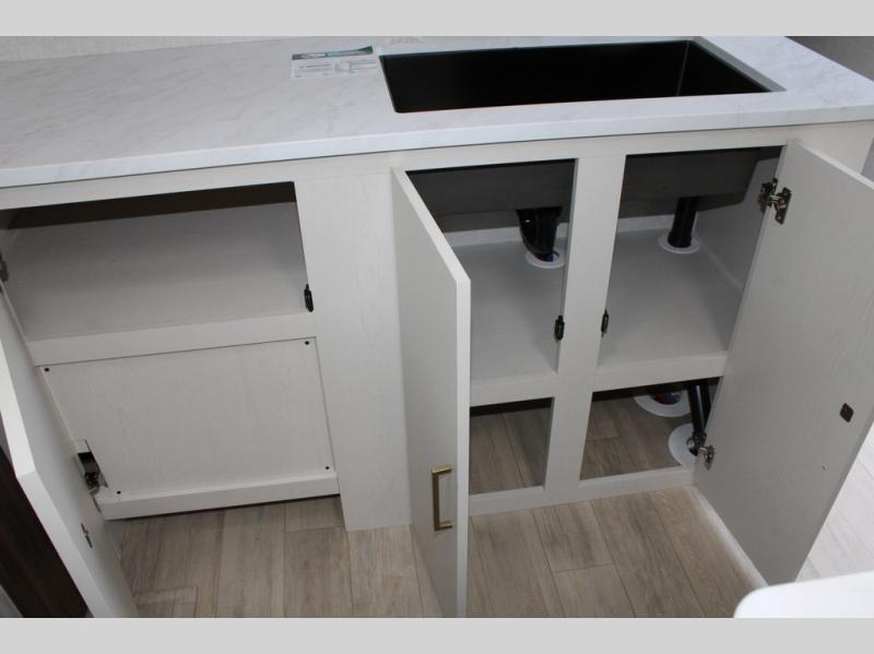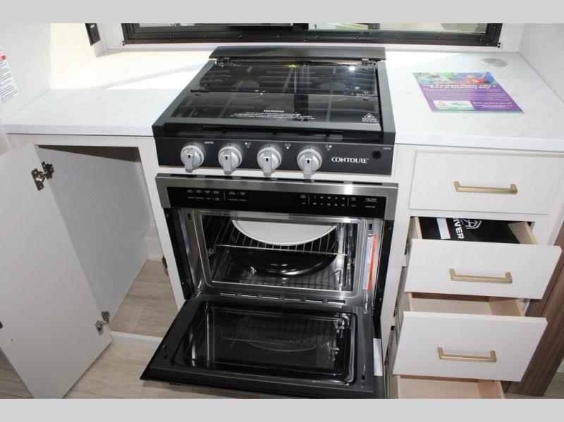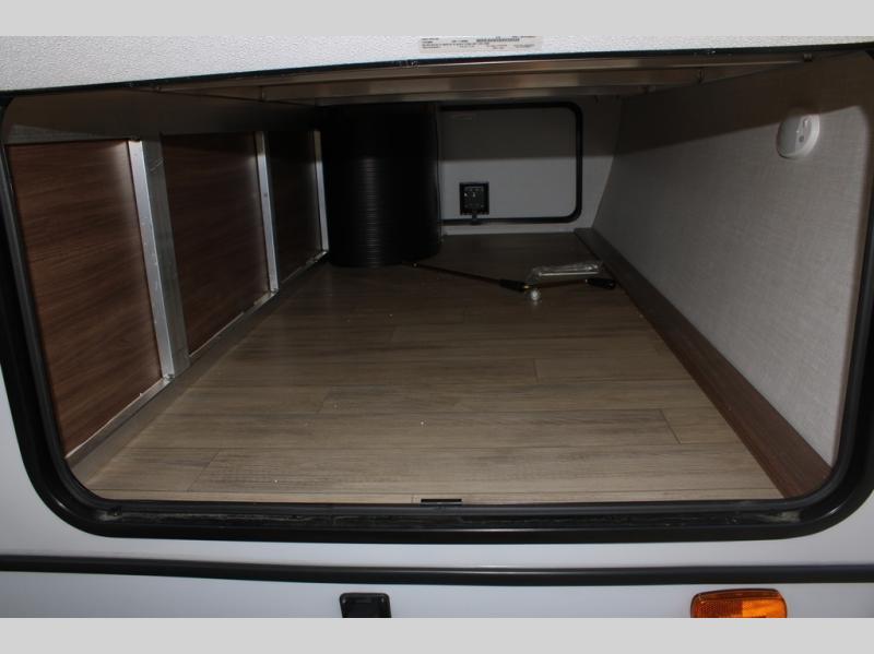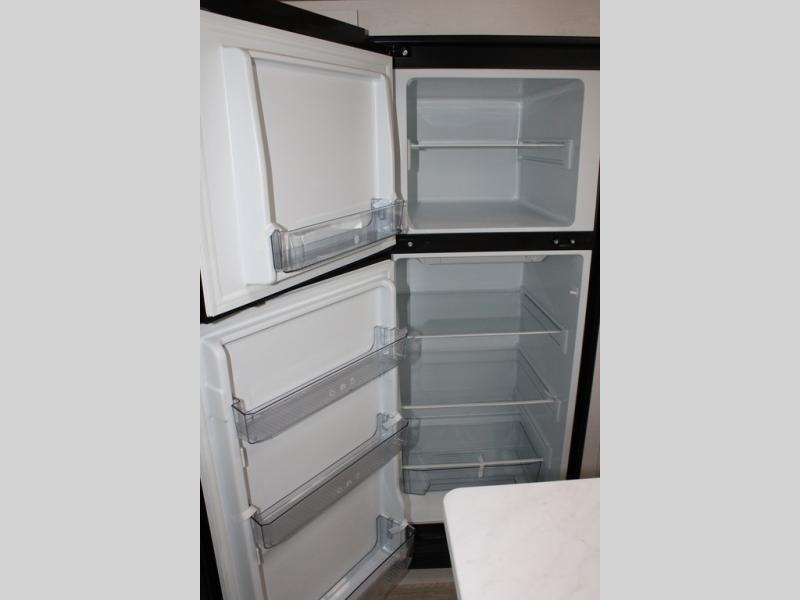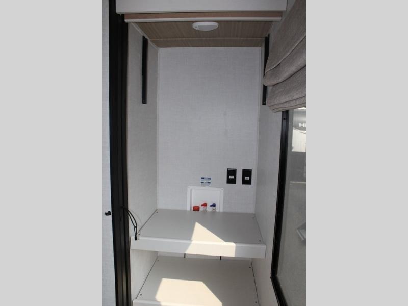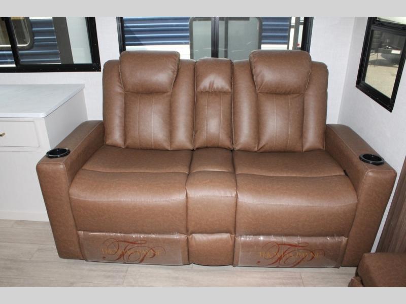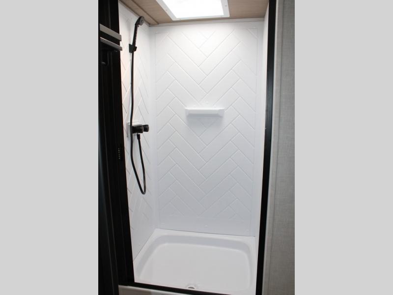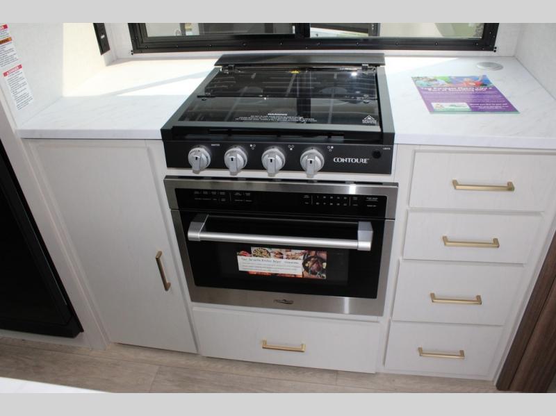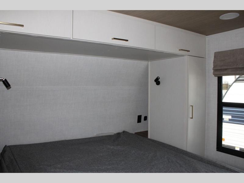 This travel trailer allows you to enjoy the great outdoors without having to give up your creature comforts. The dual opposing slides provide the chef space to work around the kitchen island, and there is plenty of seating space for your guests on the theater seating or the sleeper sofa, plus there's a desk area with chair so you can work on the go. The fireplace with a TV above will be perfect for those rainy days, and there is even a large skylight to let natural light into the living room. This model also includes Sure-Step entry steps, pass-through storage, plus two power awnings with LED lights so you can spend more time outdoors with friends and family!