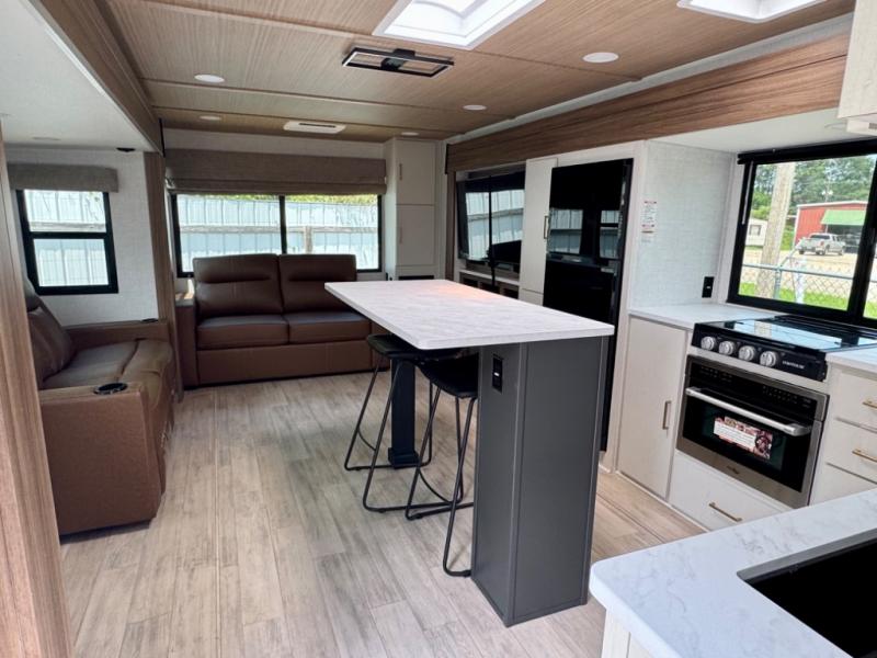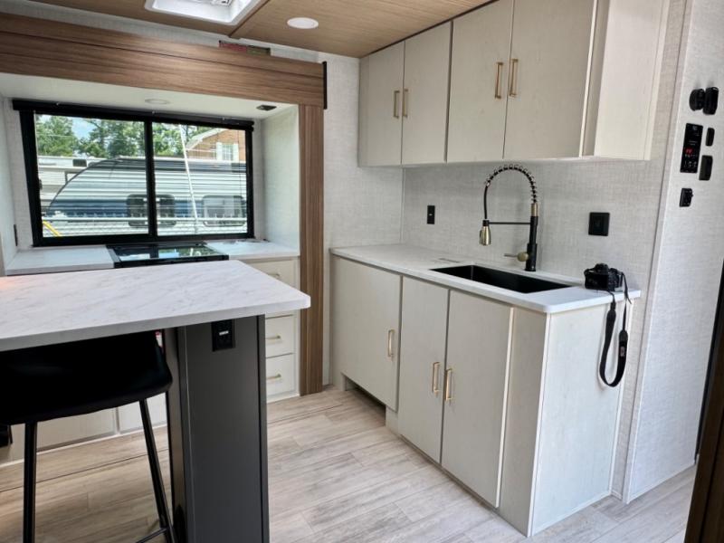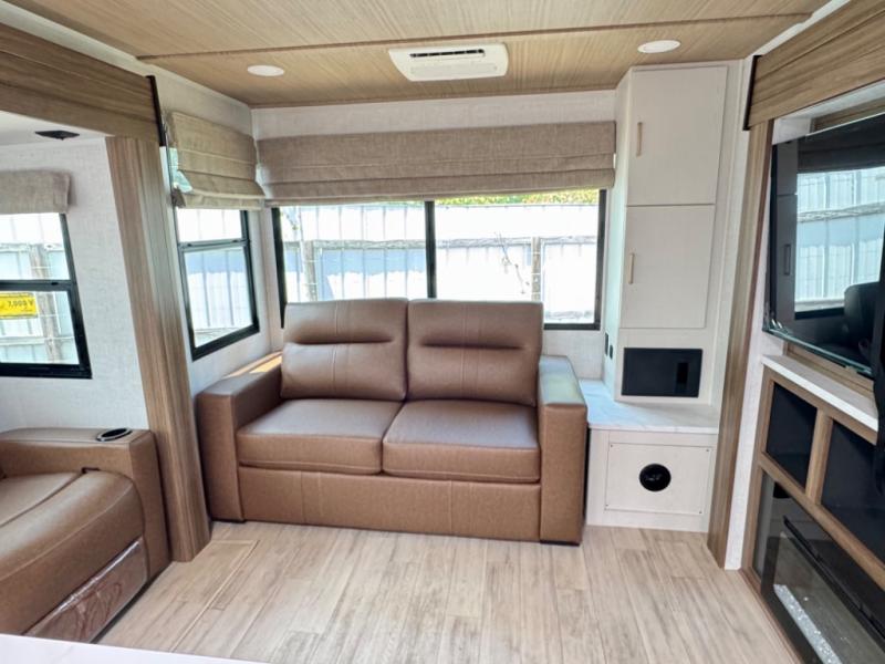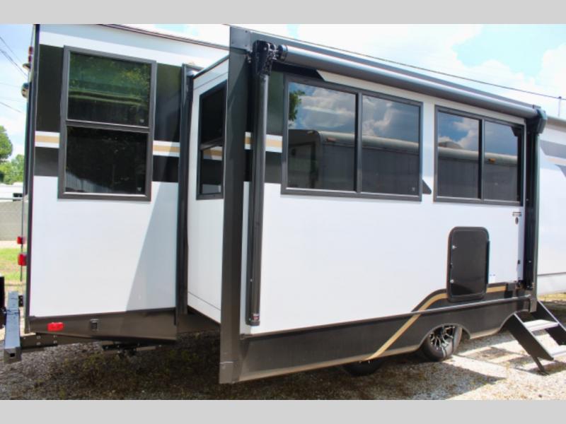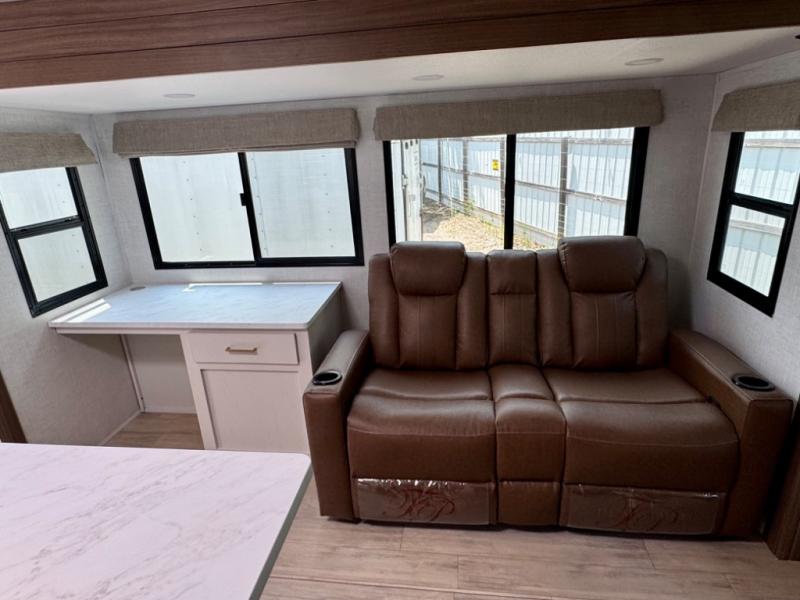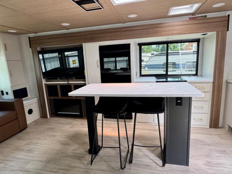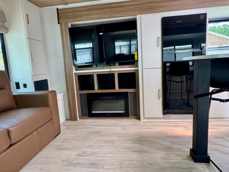 This travel trailer allows you to enjoy the great outdoors without having to give up your creature comforts. The dual opposing slides provide the chef space to work around the kitchen island, and there is plenty of seating space for your guests on the theater seating or the sleeper sofa, plus there's a desk area with chair so you can work on the go. The fireplace with a TV above will be perfect for those rainy days, and there is even a large skylight to let natural light into the living room. This model also includes Sure-Step entry steps, pass-through storage, plus two power awnings with LED lights so you can spend more time outdoors with friends and family!