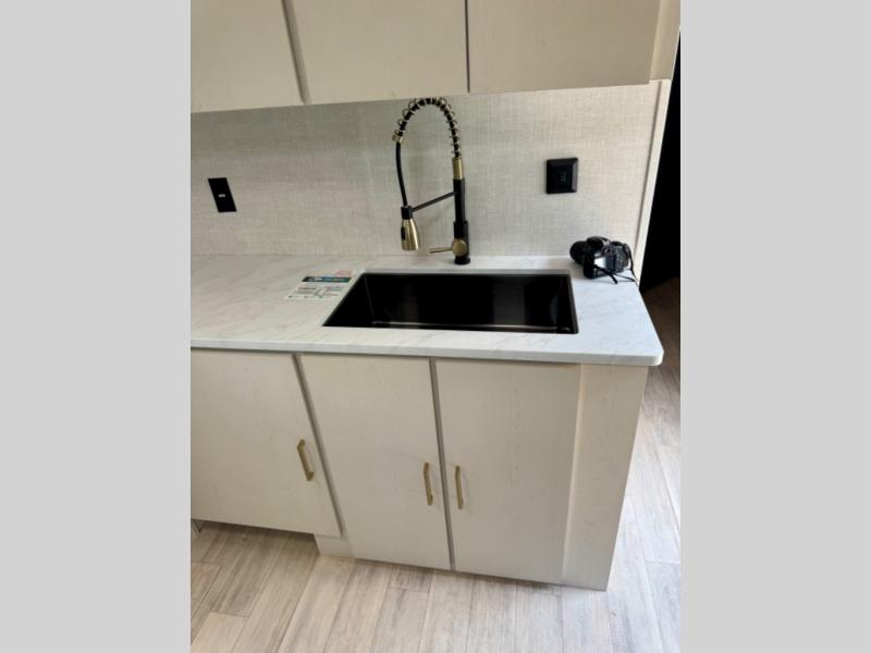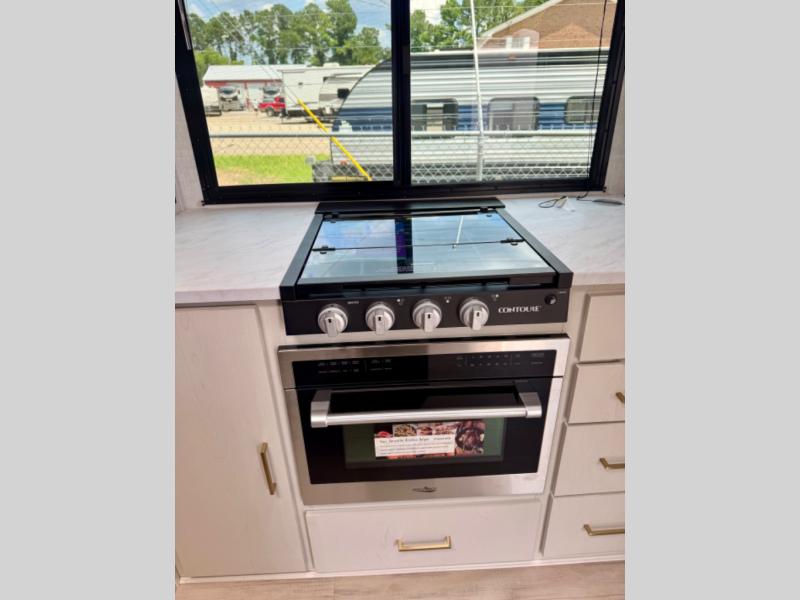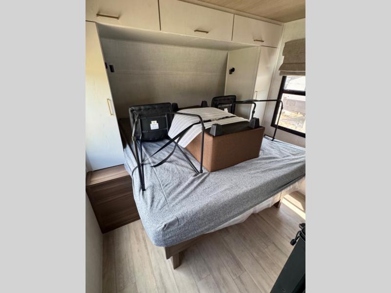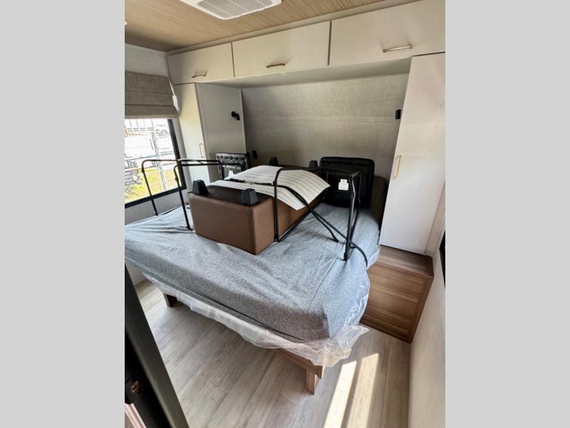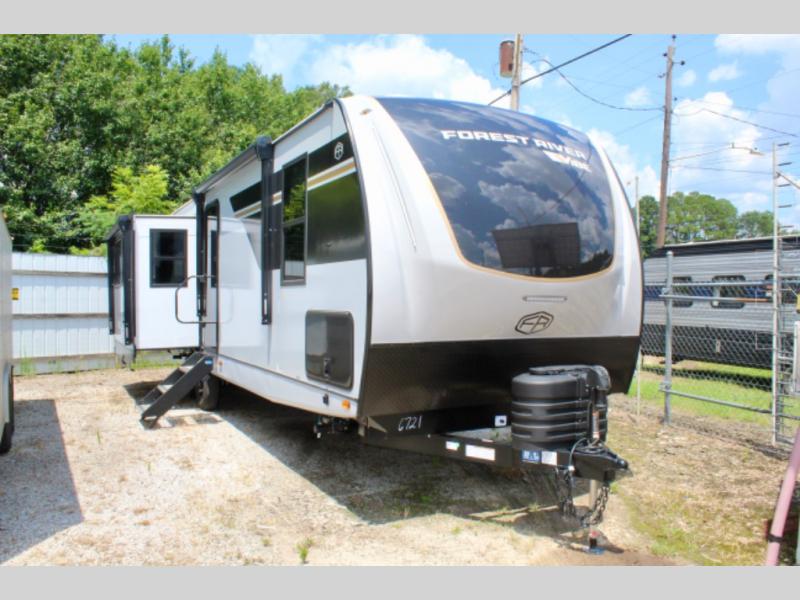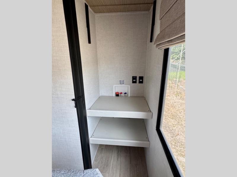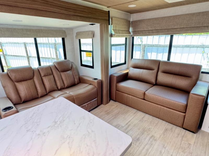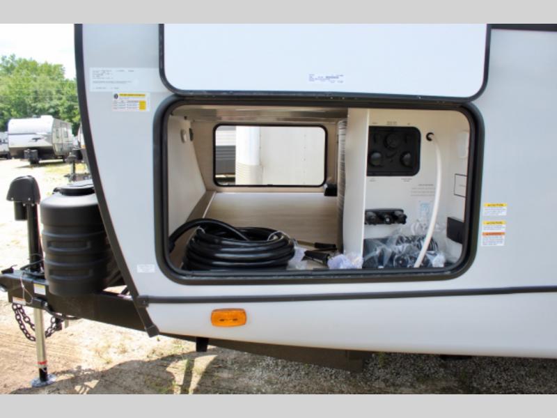 This travel trailer allows you to enjoy the great outdoors without having to give up your creature comforts. The dual opposing slides provide the chef space to work around the kitchen island, and there is plenty of seating space for your guests on the theater seating or the sleeper sofa, plus there's a desk area with chair so you can work on the go. The fireplace with a TV above will be perfect for those rainy days, and there is even a large skylight to let natural light into the living room. This model also includes Sure-Step entry steps, pass-through storage, plus two power awnings with LED lights so you can spend more time outdoors with friends and family!