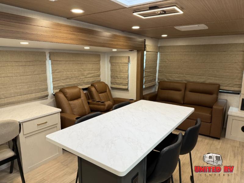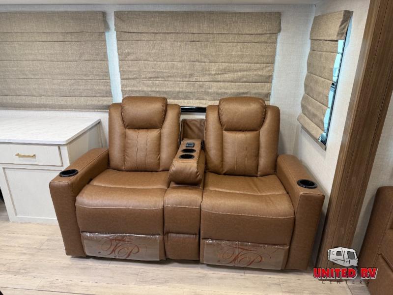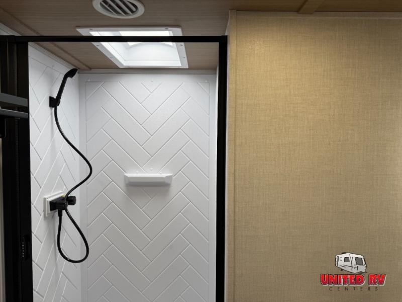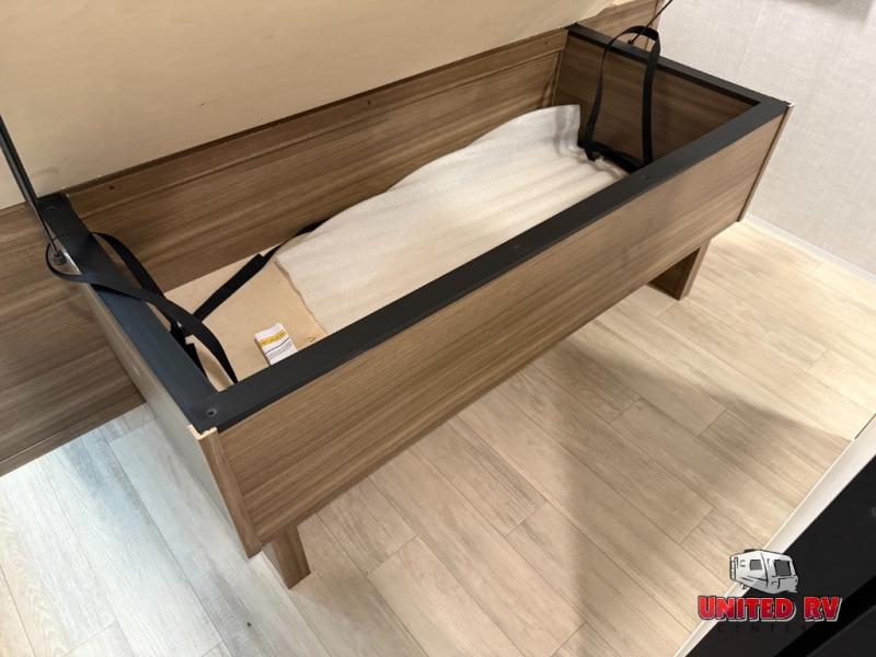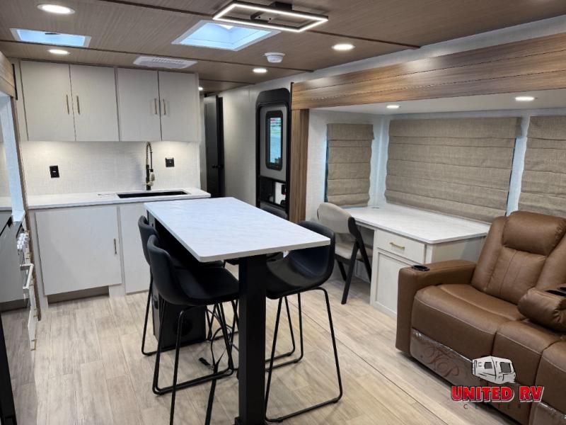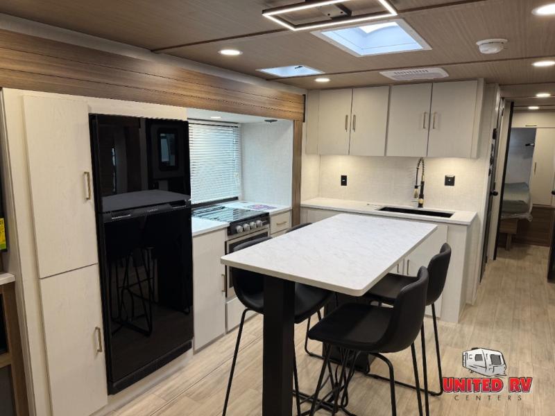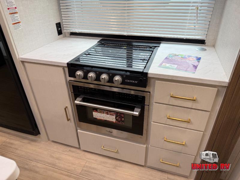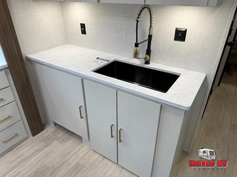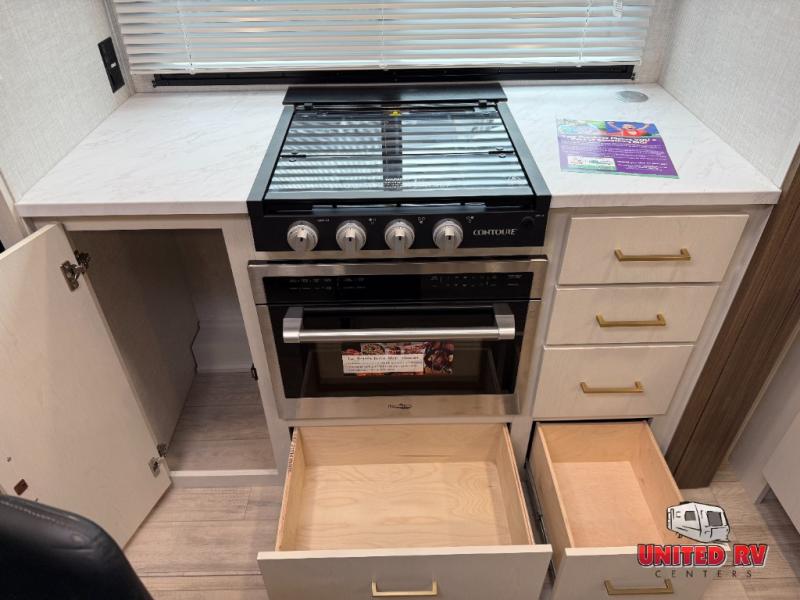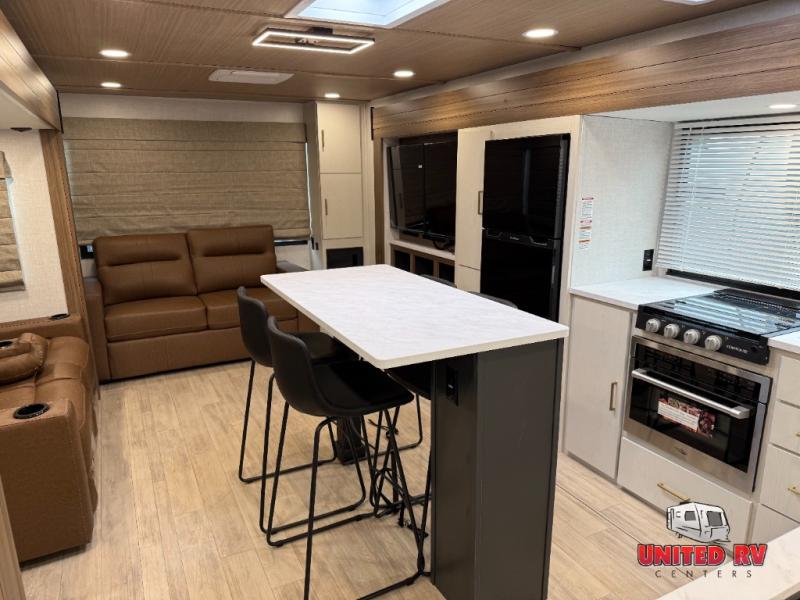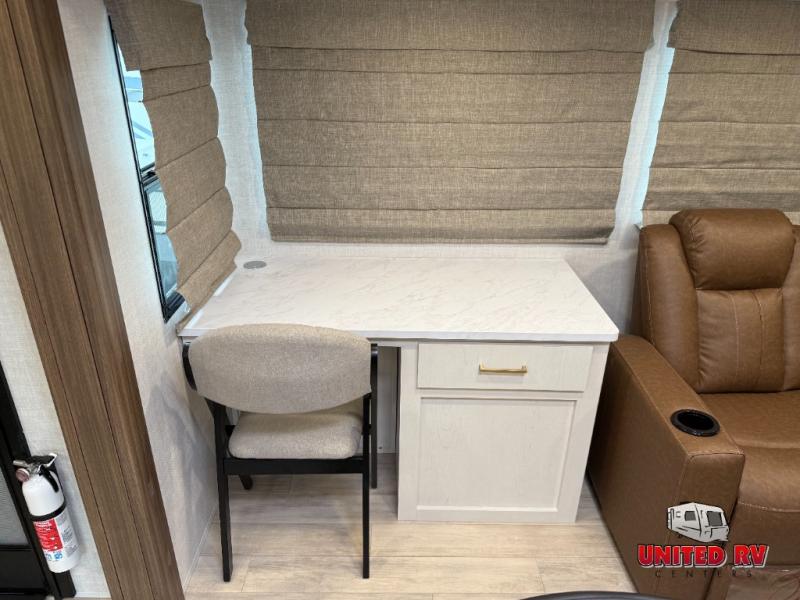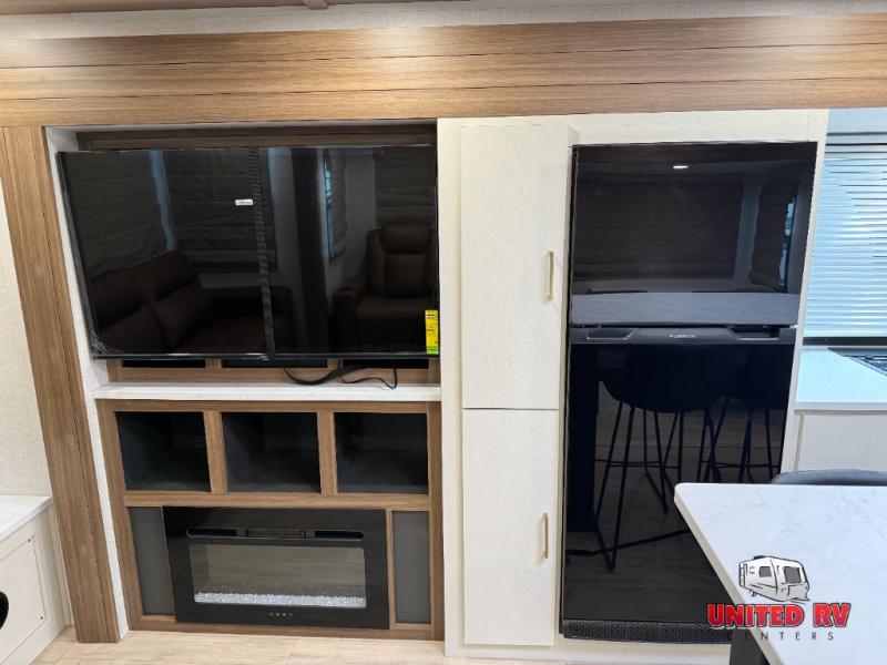This travel trailer allows you to enjoy the great outdoors without having to give up your creature comforts. The dual opposing slides provide the chef space to work around the kitchen island, and there is plenty of seating space for your guests on the theater seating or the sleeper sofa, plus there's a desk area with chair so you can work on the go. The fireplace with a TV above will be perfect for those rainy days, and there is even a large skylight to let natural light into the living room. This model also includes Sure-Step entry steps, pass-through storage, plus two power awnings with LED lights so you can spend more time outdoors with friends and family!