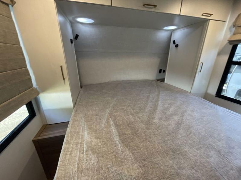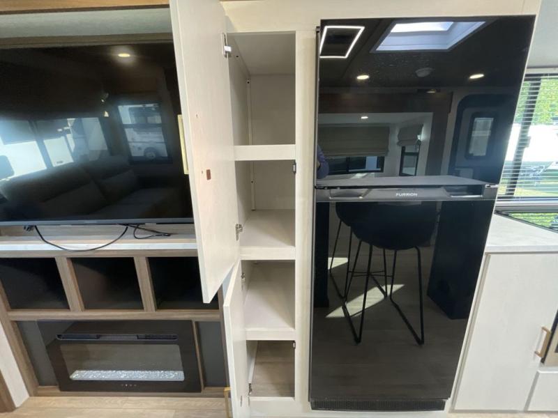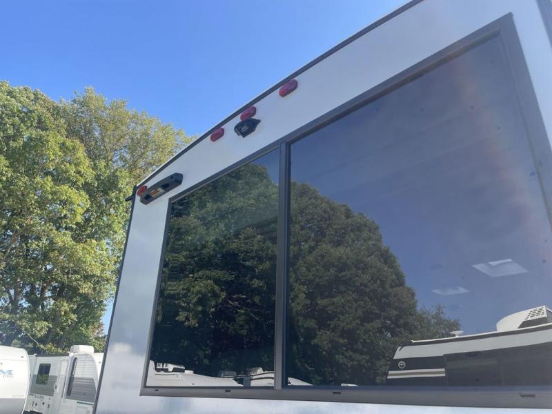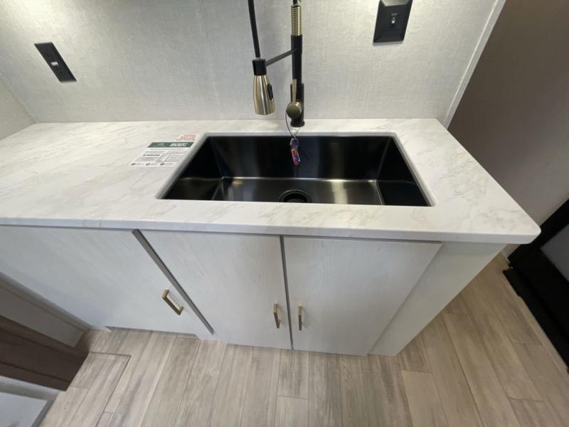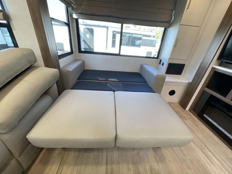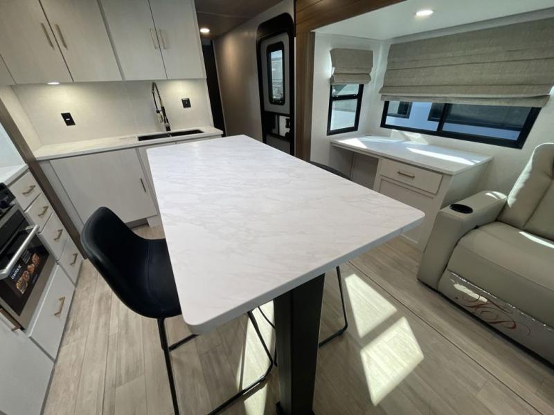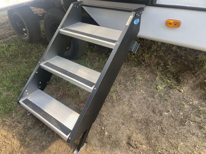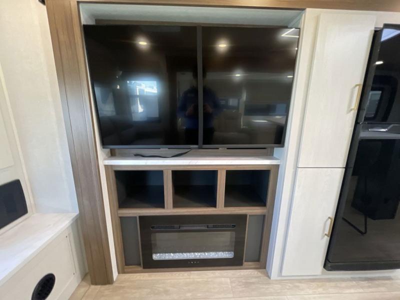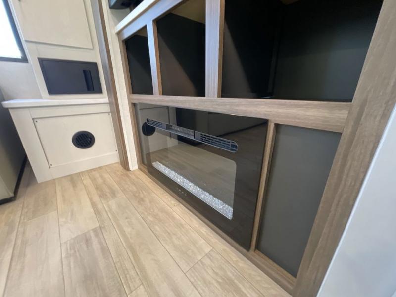 This travel trailer allows you to enjoy the great outdoors without having to give up your creature comforts. The dual opposing slides provide the chef space to work around the kitchen island, and there is plenty of seating space for your guests on the theater seating or the sleeper sofa, plus there's a desk area with chair so you can work on the go. The fireplace with a TV above will be perfect for those rainy days, and there is even a large skylight to let natural light into the living room. This model also includes Sure-Step entry steps, pass-through storage, plus two power awnings with LED lights so you can spend more time outdoors with friends and family!