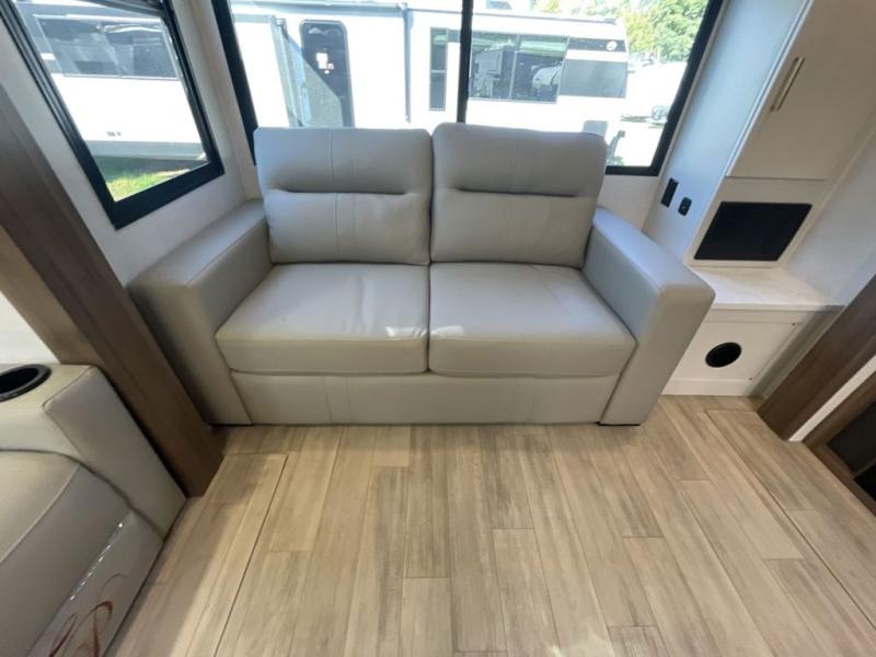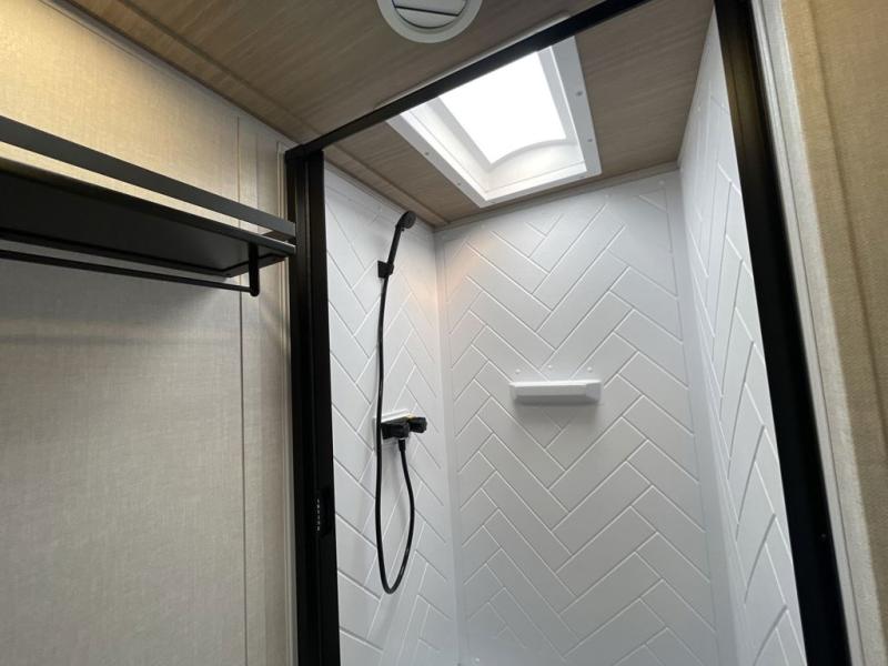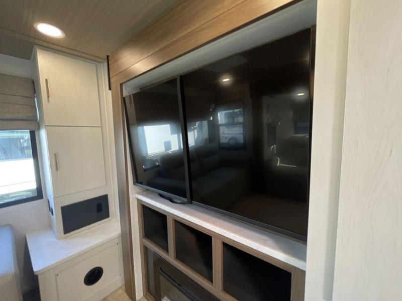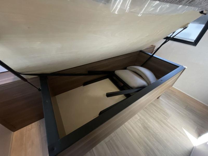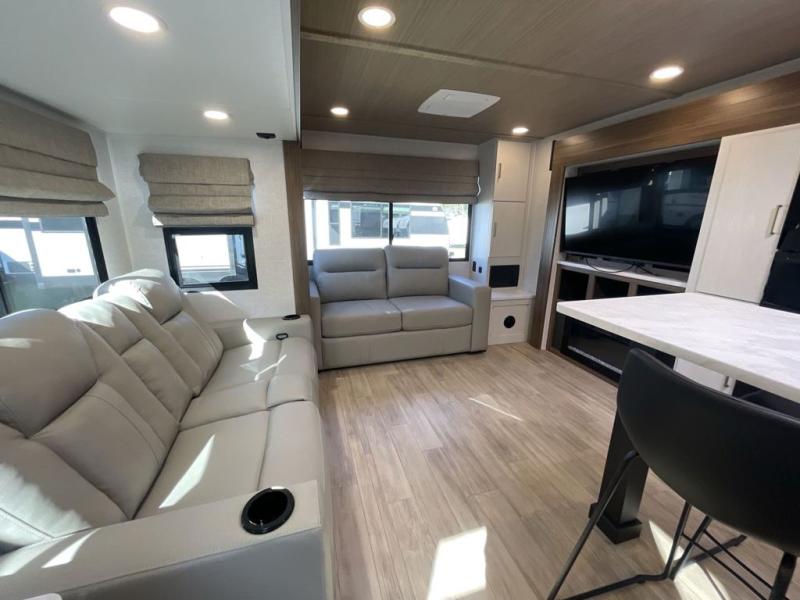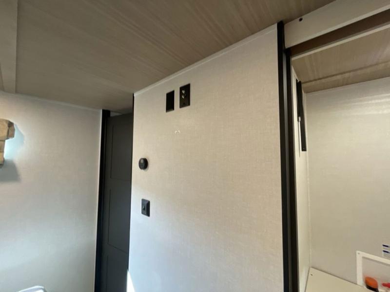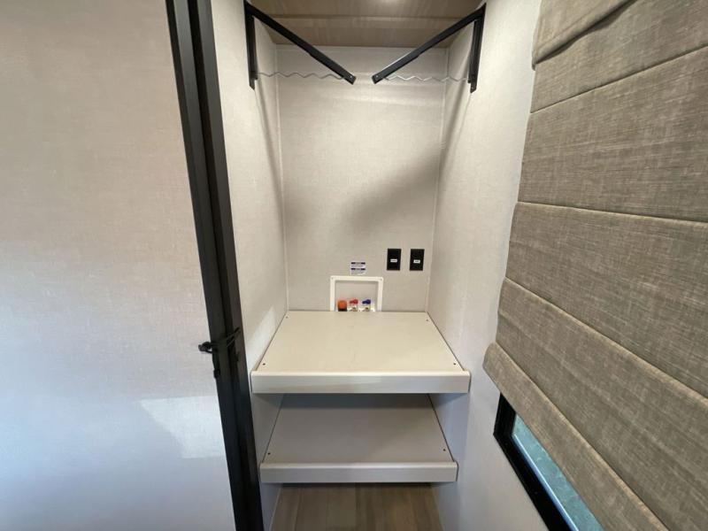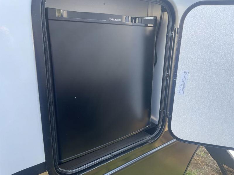 This travel trailer allows you to enjoy the great outdoors without having to give up your creature comforts. The dual opposing slides provide the chef space to work around the kitchen island, and there is plenty of seating space for your guests on the theater seating or the sleeper sofa, plus there's a desk area with chair so you can work on the go. The fireplace with a TV above will be perfect for those rainy days, and there is even a large skylight to let natural light into the living room. This model also includes Sure-Step entry steps, pass-through storage, plus two power awnings with LED lights so you can spend more time outdoors with friends and family!