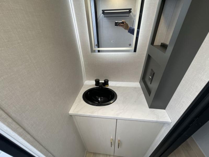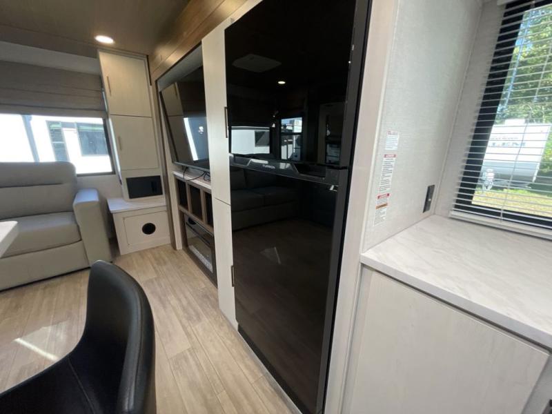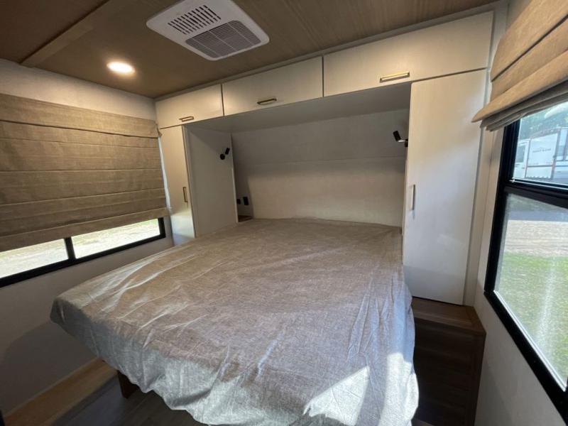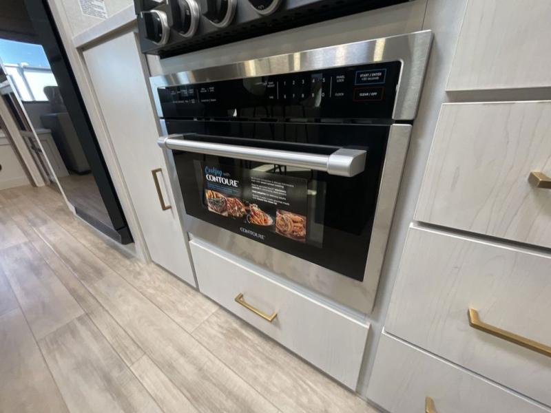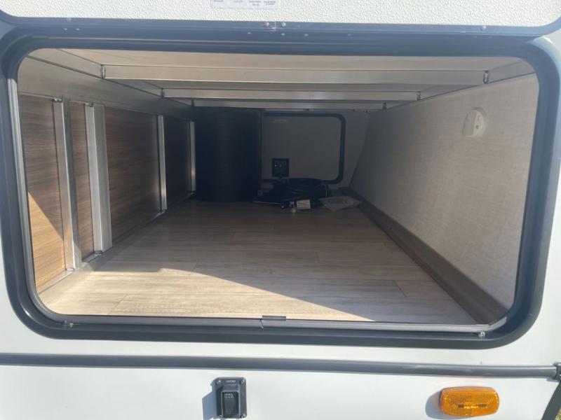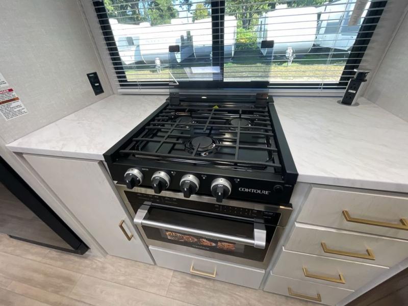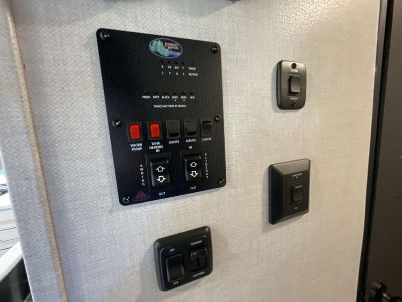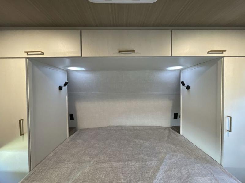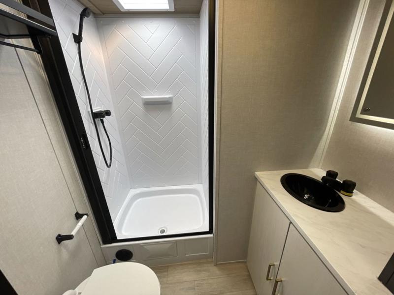 This travel trailer allows you to enjoy the great outdoors without having to give up your creature comforts. The dual opposing slides provide the chef space to work around the kitchen island, and there is plenty of seating space for your guests on the theater seating or the sleeper sofa, plus there's a desk area with chair so you can work on the go. The fireplace with a TV above will be perfect for those rainy days, and there is even a large skylight to let natural light into the living room. This model also includes Sure-Step entry steps, pass-through storage, plus two power awnings with LED lights so you can spend more time outdoors with friends and family!