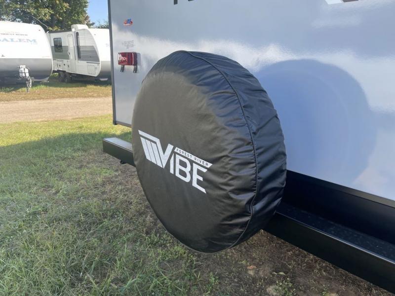 With any Vibe travel trailer by Forest River, you will enjoy comfort at every turn! There is a Norco huck-bolted steel frame, an enclosed underbelly with 12V heating pads, and a PVC roof membrane for added durability. You will also find a universal docking station outside, along with slam latch doors, European style square windows, and an automotive painted front cap. Head inside to enjoy the premium residential-style furniture, decorative window treatments, privacy shades in the living room and bedroom, and many more comforts!