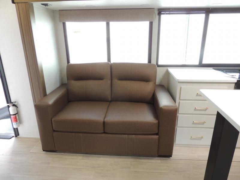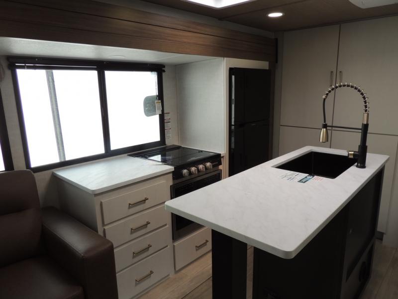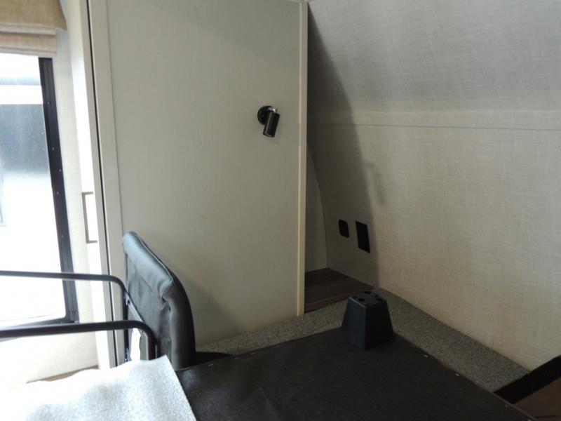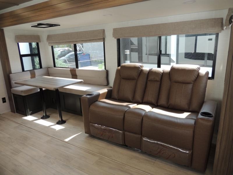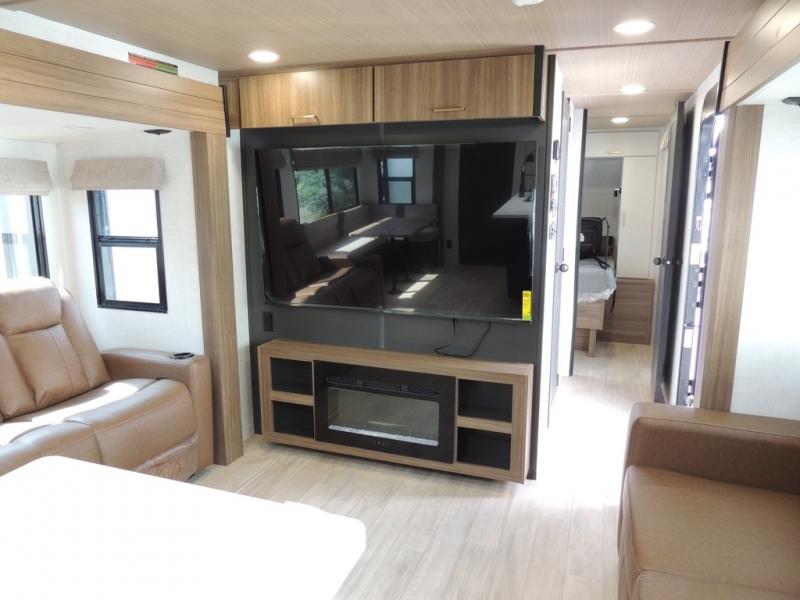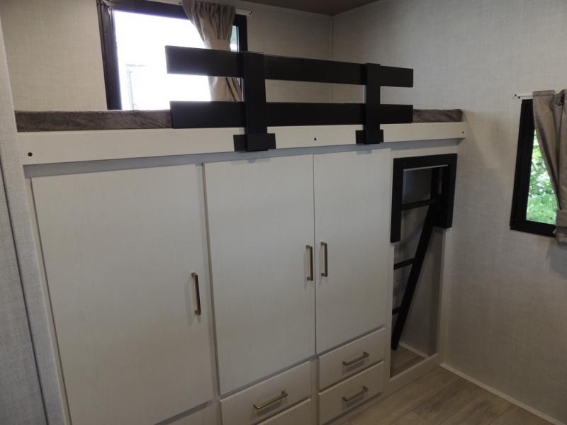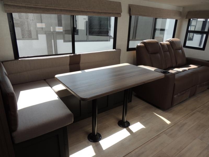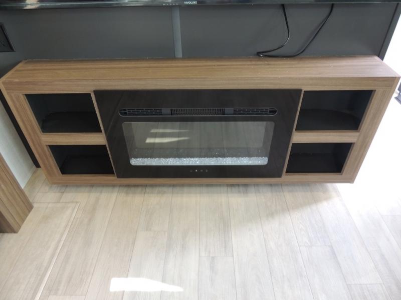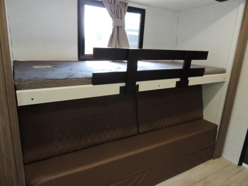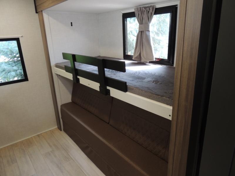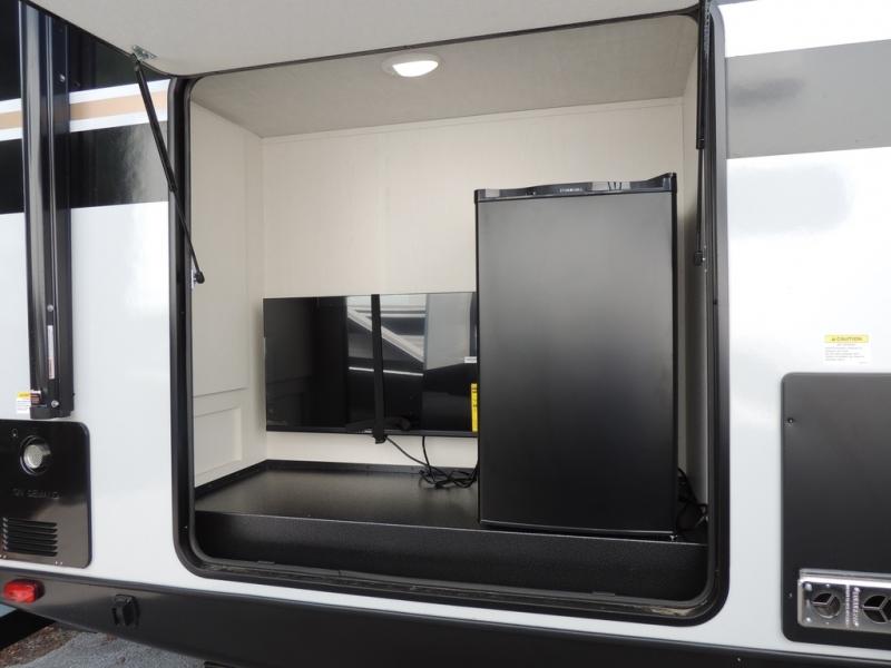 Whether you enjoy spending time outdoors or indoors, there is something for everyone in this travel trailer. The large pass-through storage can store your fishing poles, and the 20' electric awning with LED lights will create an outdoor living space. There is even an outdoor refrigerator with an outside storage cabinet and 32" TV! You will love all the interior space thanks to the dual opposing slides in the main living area, which will give the chef space to work around the kitchen island. Your crew can visit on the tri-fold sofa, theater seating and 5-person dinette while the fireplace is going, but you'll probably find the kids spending most of their time in the private bunkhouse! What more could you want in a travel trailer?!