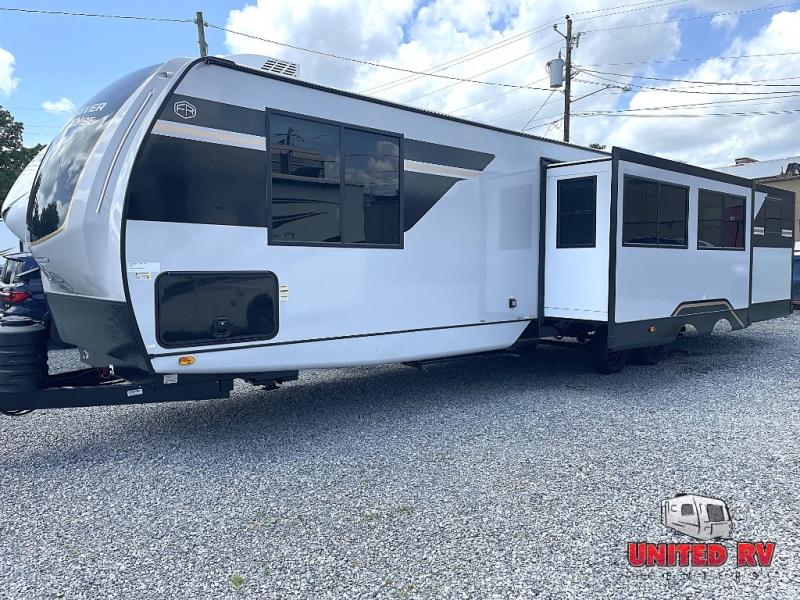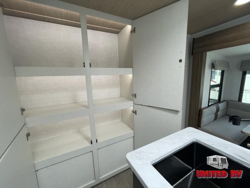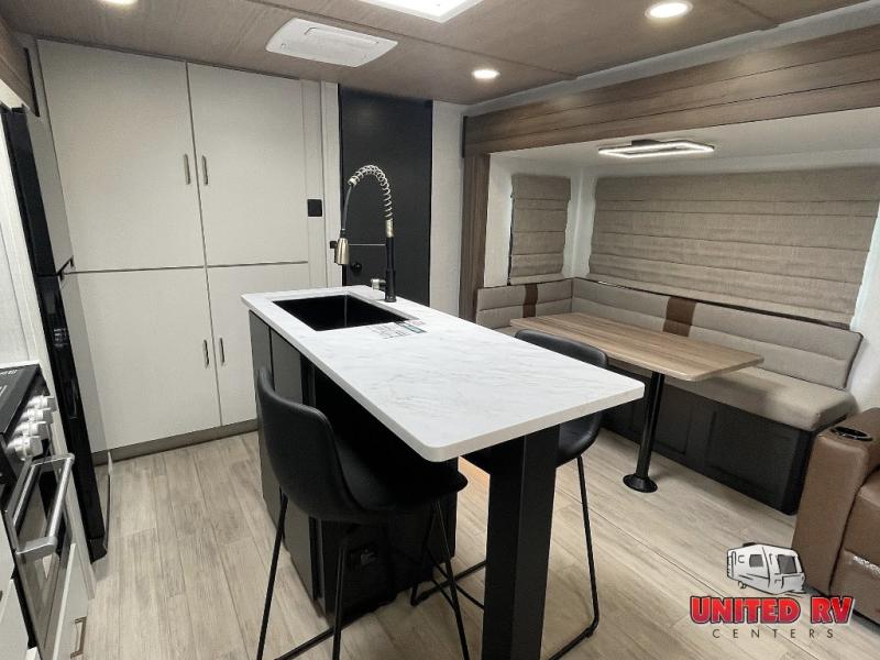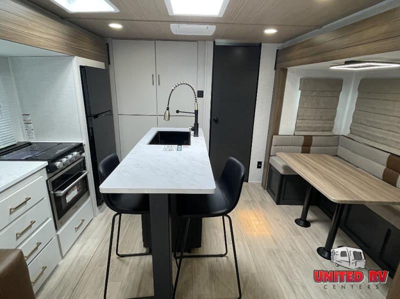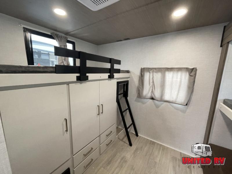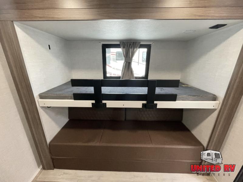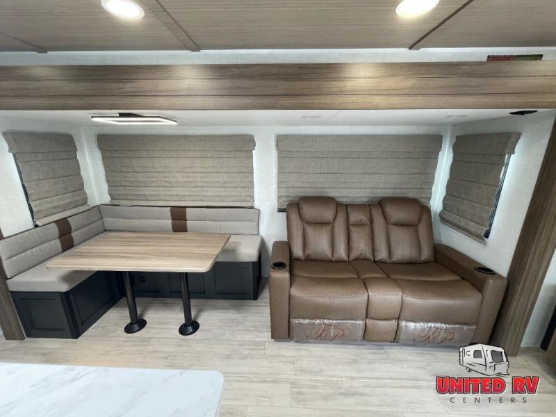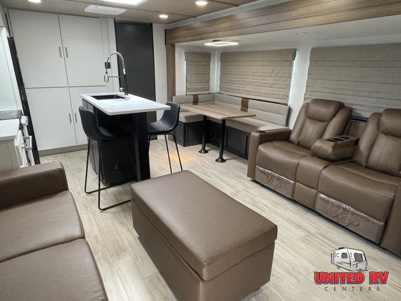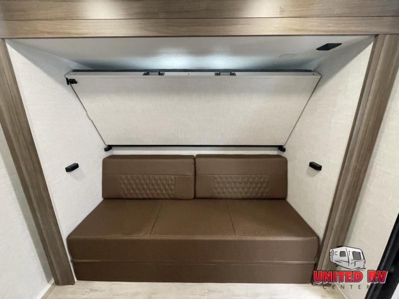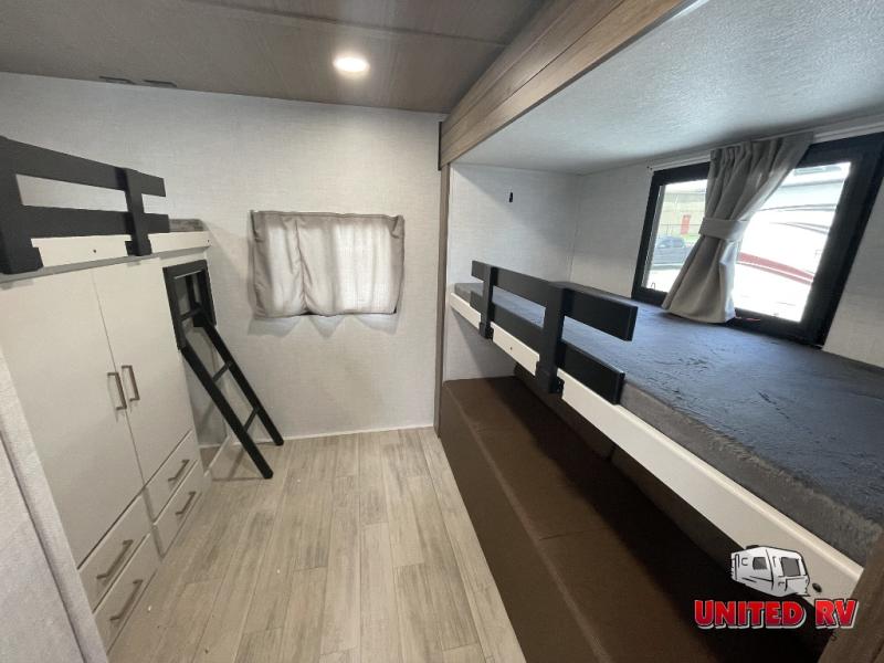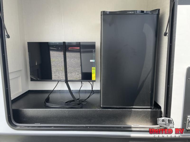 Whether you enjoy spending time outdoors or indoors, there is something for everyone in this travel trailer. The large pass-through storage can store your fishing poles, and the 20' electric awning with LED lights will create an outdoor living space. There is even an outdoor refrigerator with an outside storage cabinet and 32" TV! You will love all the interior space thanks to the dual opposing slides in the main living area, which will give the chef space to work around the kitchen island. Your crew can visit on the tri-fold sofa, theater seating and 5-person dinette while the fireplace is going, but you'll probably find the kids spending most of their time in the private bunkhouse! What more could you want in a travel trailer?!