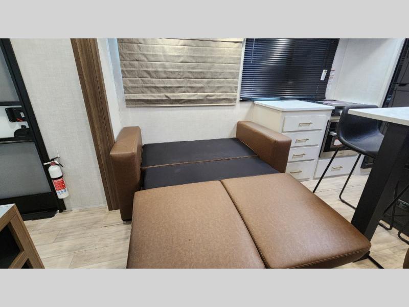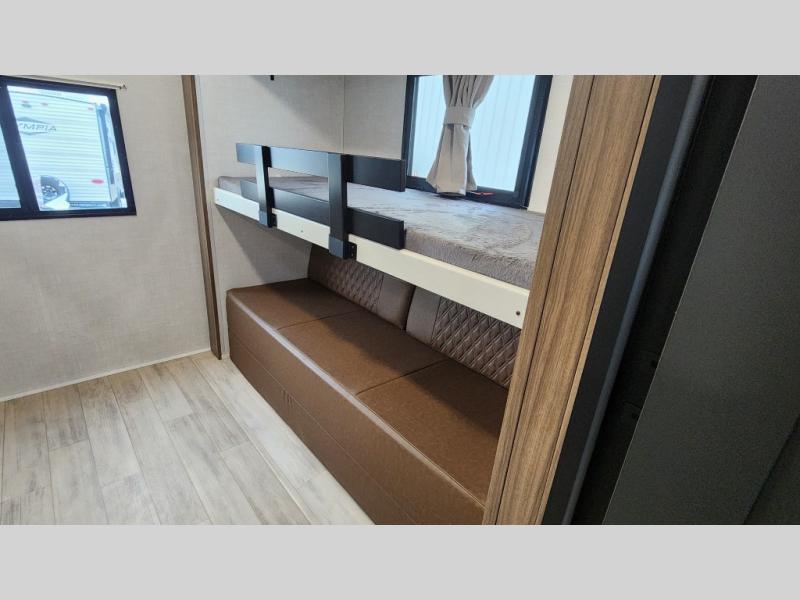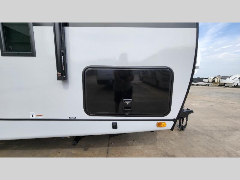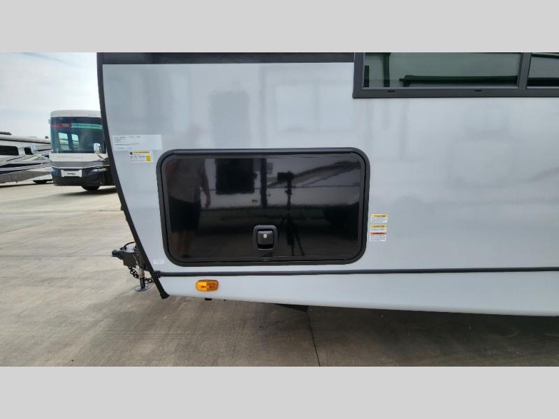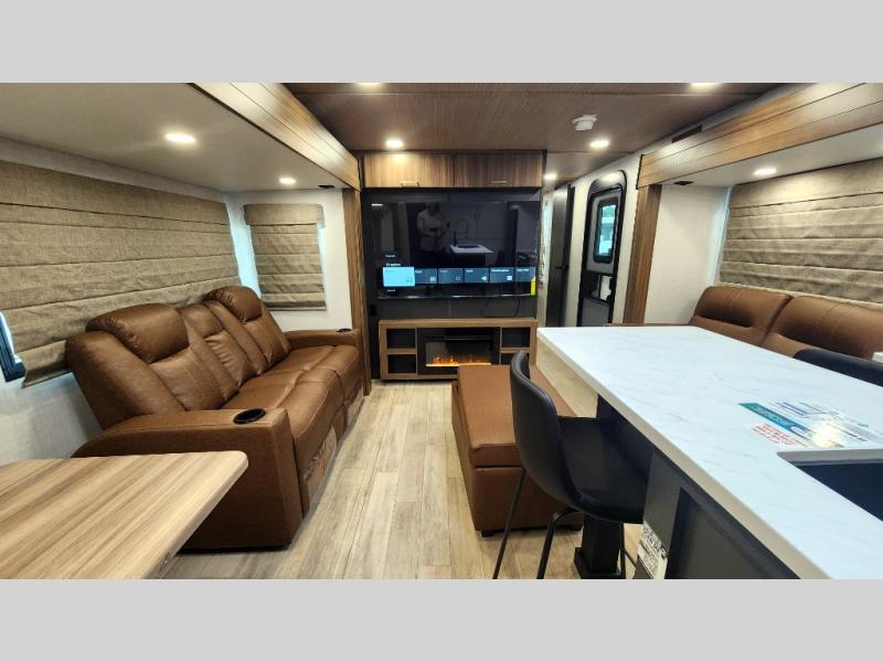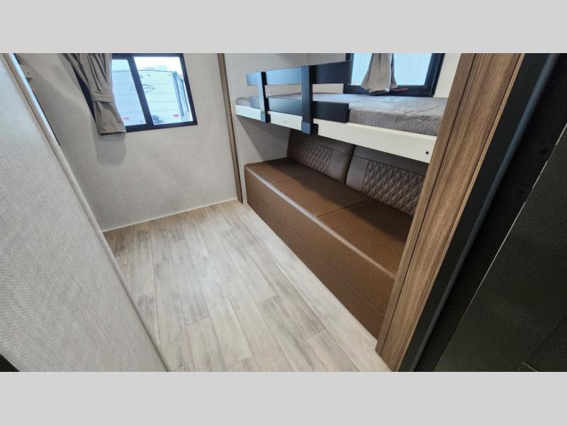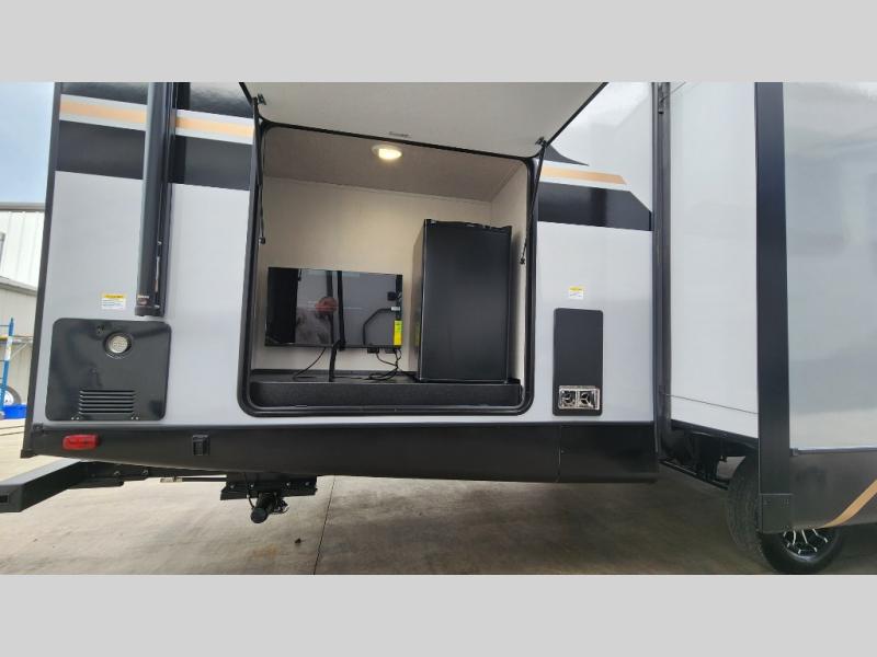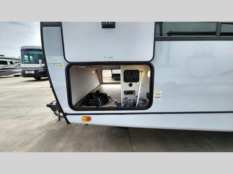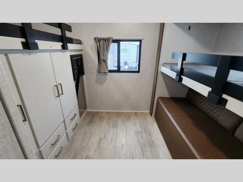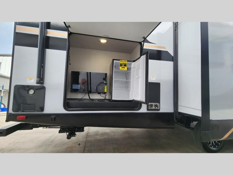 Whether you enjoy spending time outdoors or indoors, there is something for everyone in this travel trailer. The large pass-through storage can store your fishing poles, and the 20' electric awning with LED lights will create an outdoor living space. There is even an outdoor refrigerator with an outside storage cabinet and 32" TV! You will love all the interior space thanks to the dual opposing slides in the main living area, which will give the chef space to work around the kitchen island. Your crew can visit on the tri-fold sofa, theater seating and 5-person dinette while the fireplace is going, but you'll probably find the kids spending most of their time in the private bunkhouse! What more could you want in a travel trailer?!