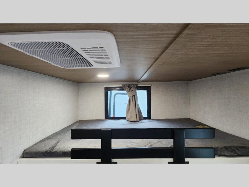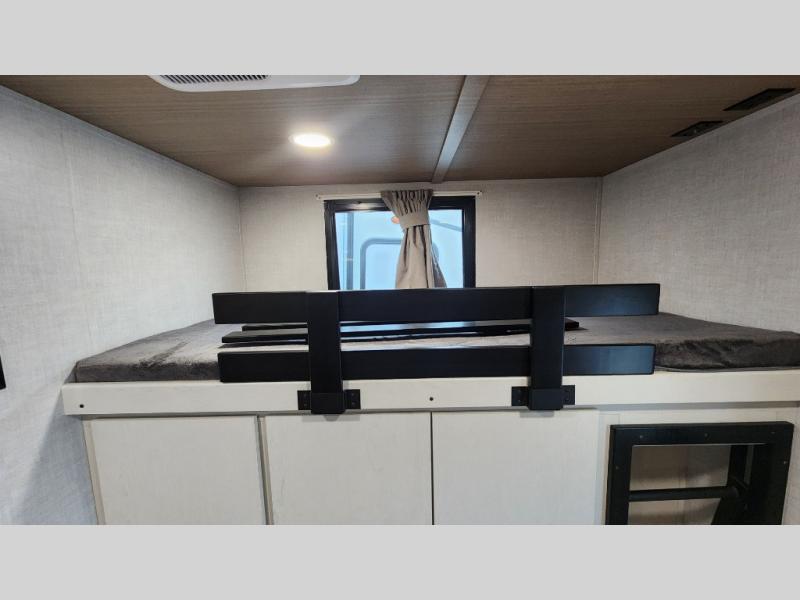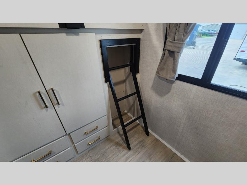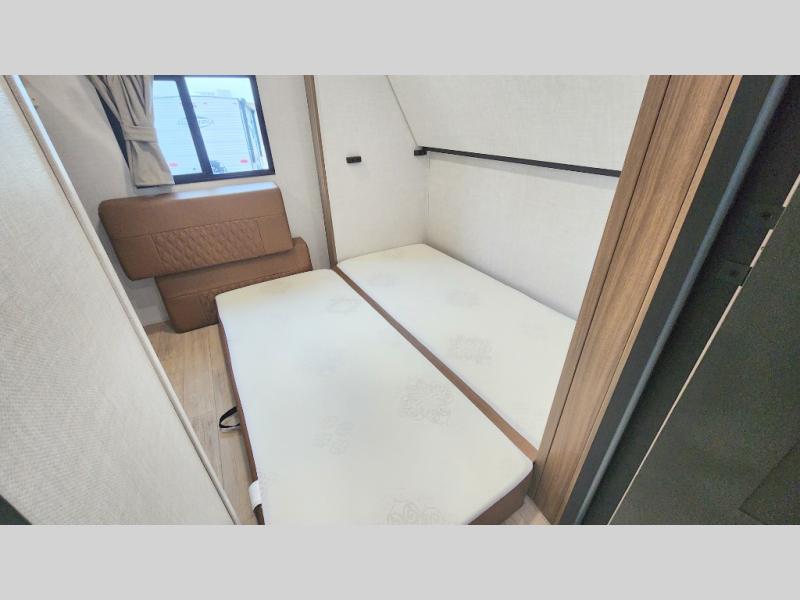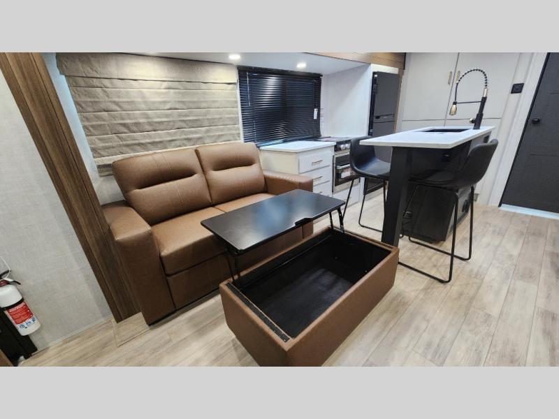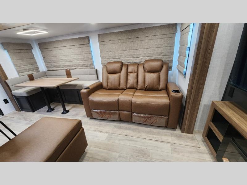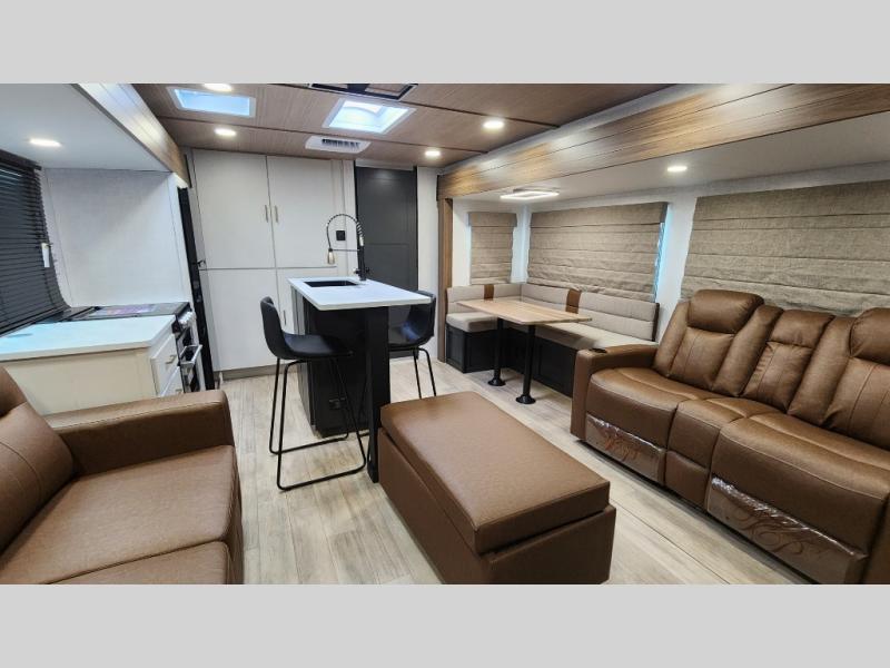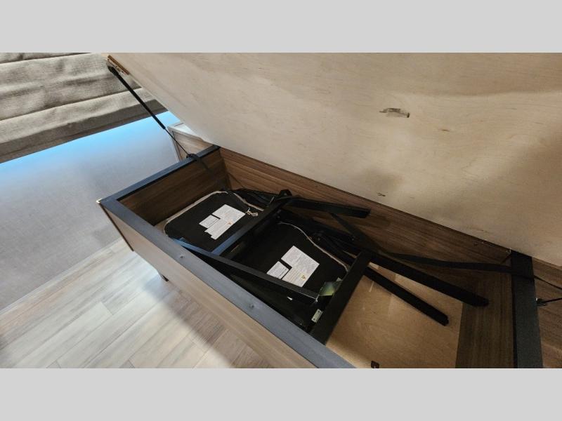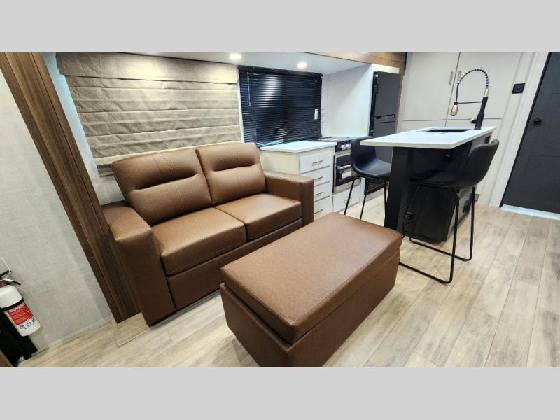 Whether you enjoy spending time outdoors or indoors, there is something for everyone in this travel trailer. The large pass-through storage can store your fishing poles, and the 20' electric awning with LED lights will create an outdoor living space. There is even an outdoor refrigerator with an outside storage cabinet and 32" TV! You will love all the interior space thanks to the dual opposing slides in the main living area, which will give the chef space to work around the kitchen island. Your crew can visit on the tri-fold sofa, theater seating and 5-person dinette while the fireplace is going, but you'll probably find the kids spending most of their time in the private bunkhouse! What more could you want in a travel trailer?!