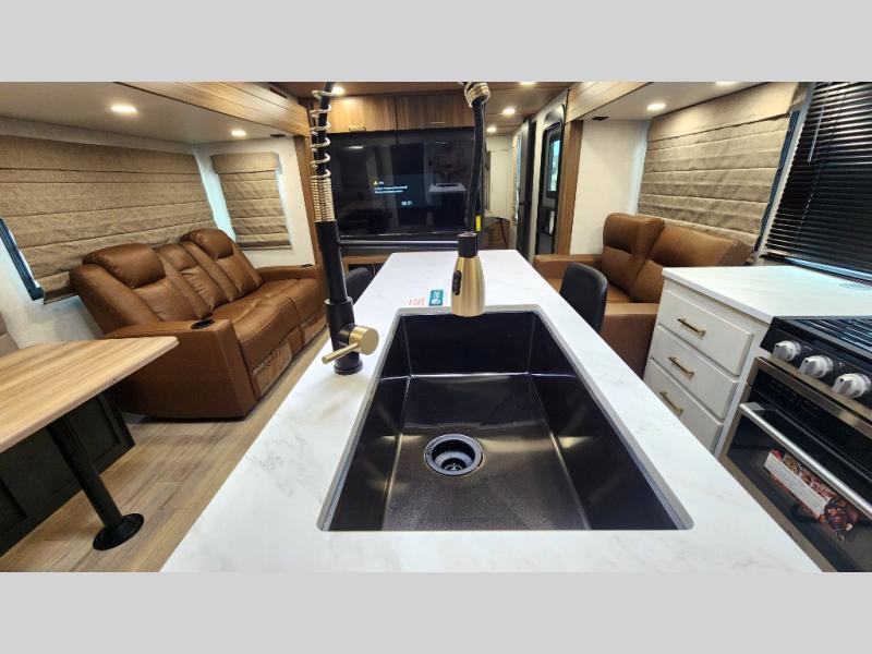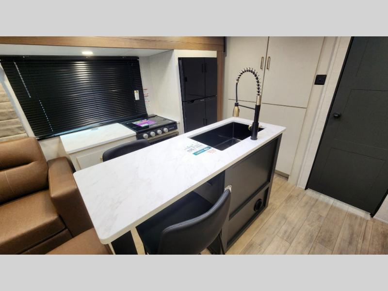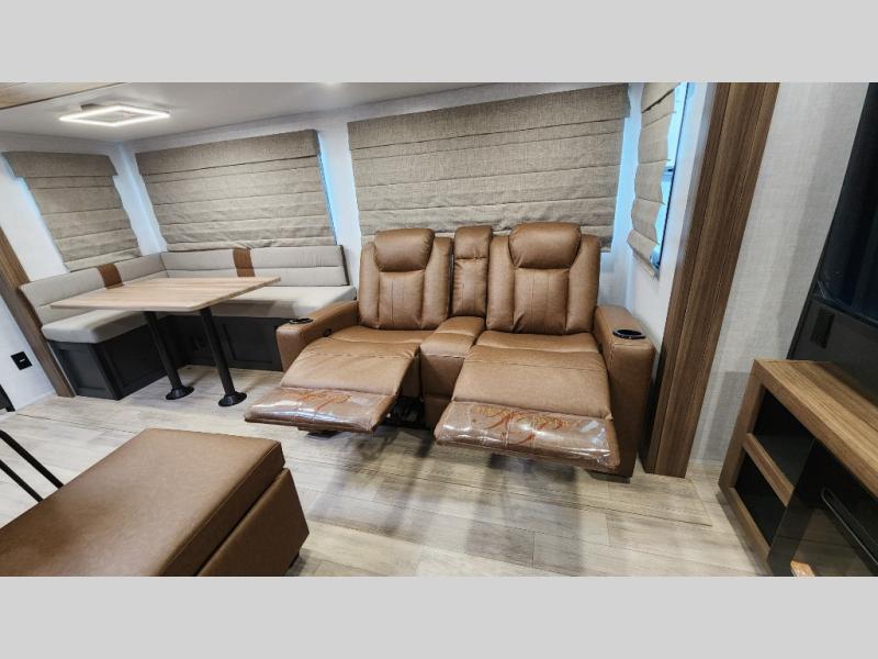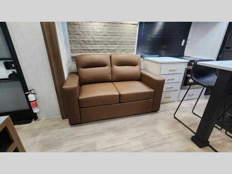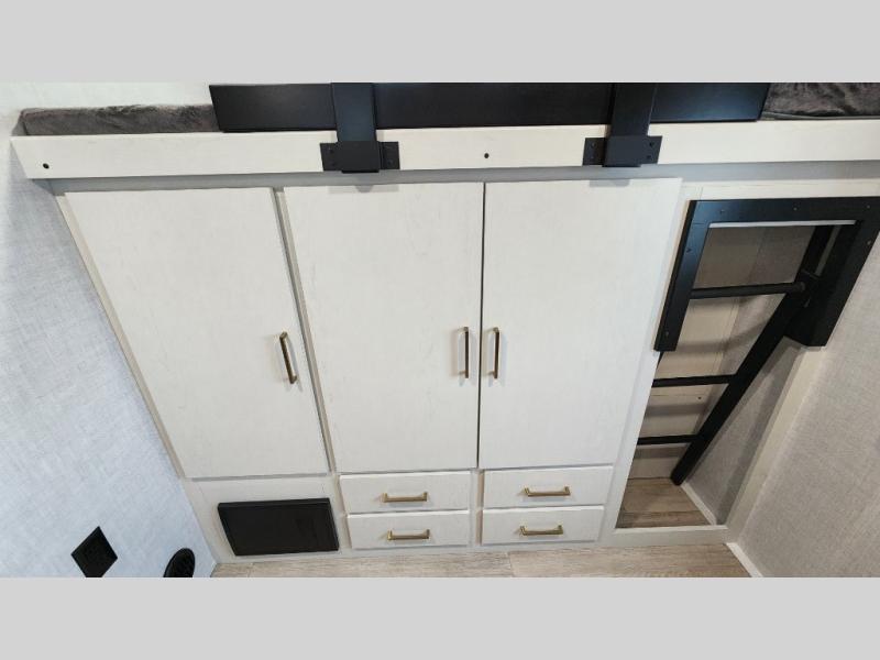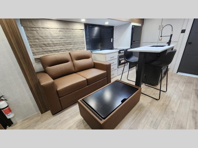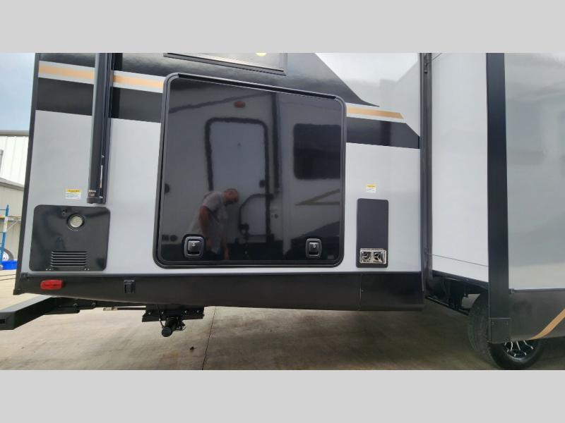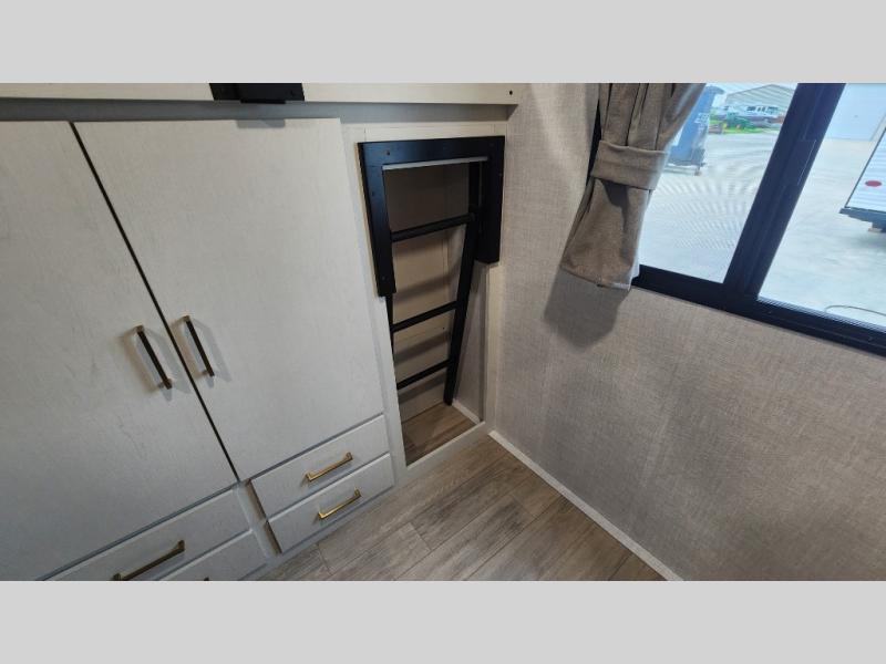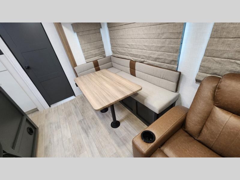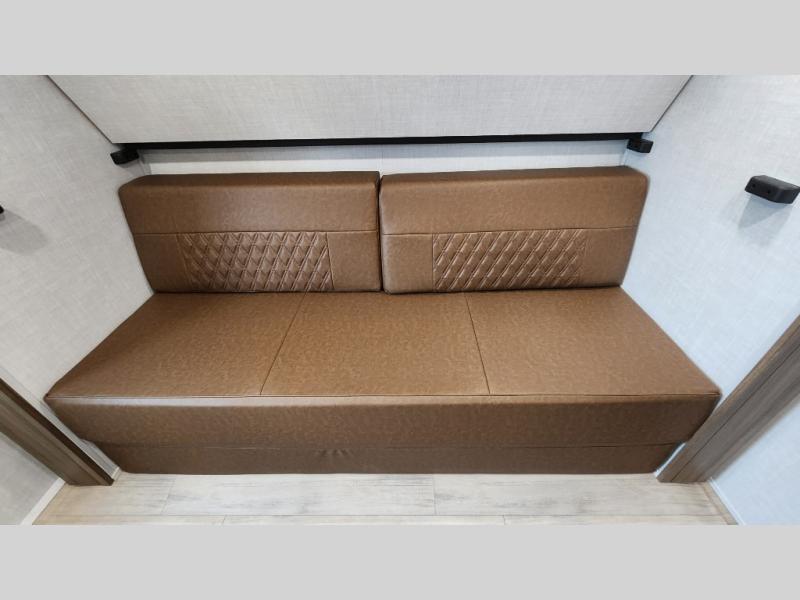 Whether you enjoy spending time outdoors or indoors, there is something for everyone in this travel trailer. The large pass-through storage can store your fishing poles, and the 20' electric awning with LED lights will create an outdoor living space. There is even an outdoor refrigerator with an outside storage cabinet and 32" TV! You will love all the interior space thanks to the dual opposing slides in the main living area, which will give the chef space to work around the kitchen island. Your crew can visit on the tri-fold sofa, theater seating and 5-person dinette while the fireplace is going, but you'll probably find the kids spending most of their time in the private bunkhouse! What more could you want in a travel trailer?!