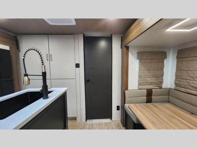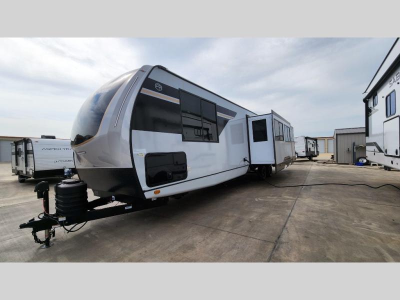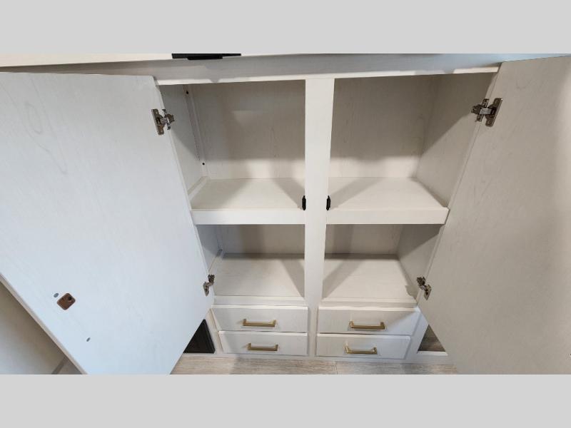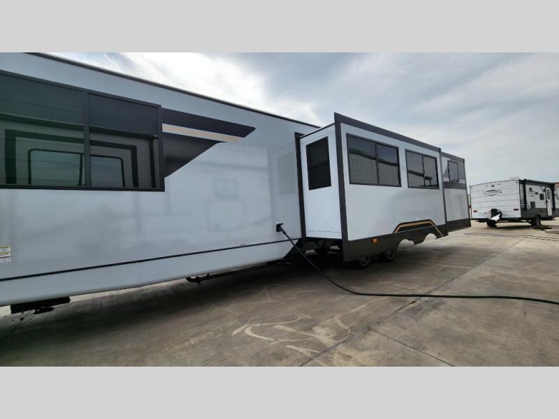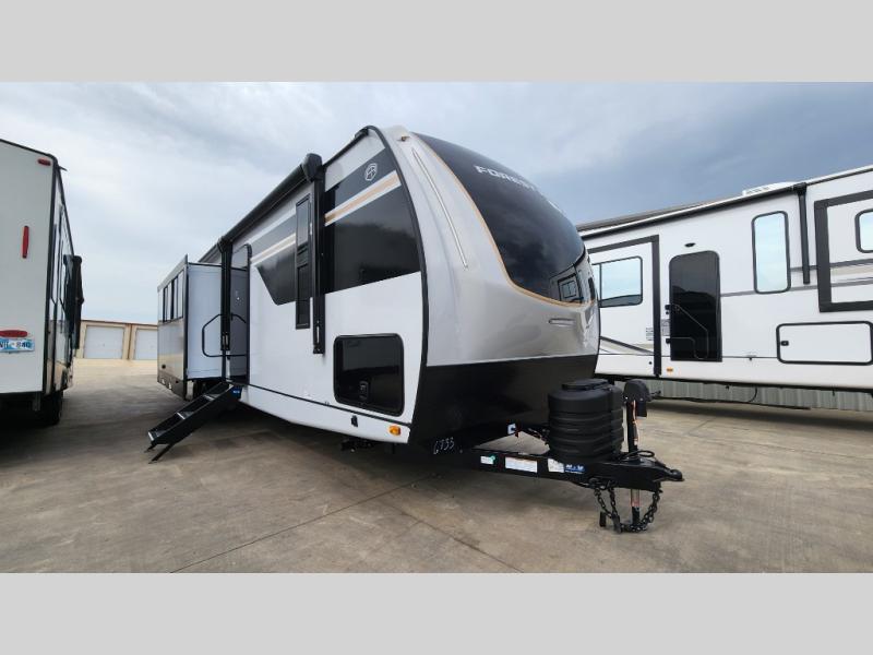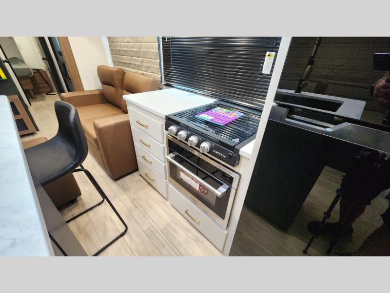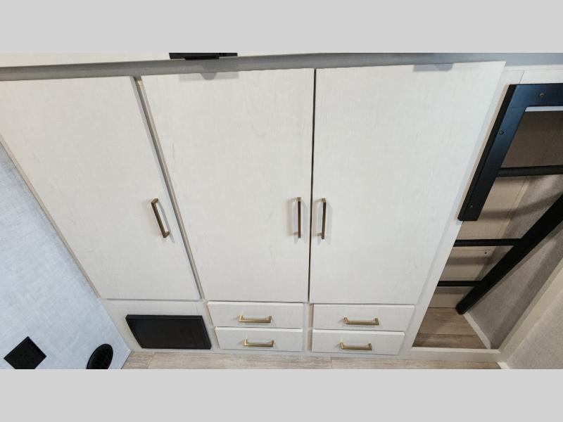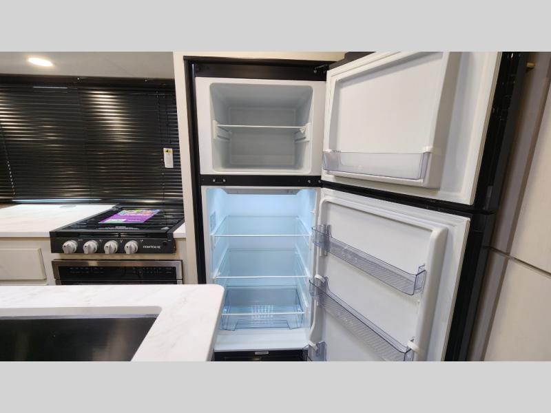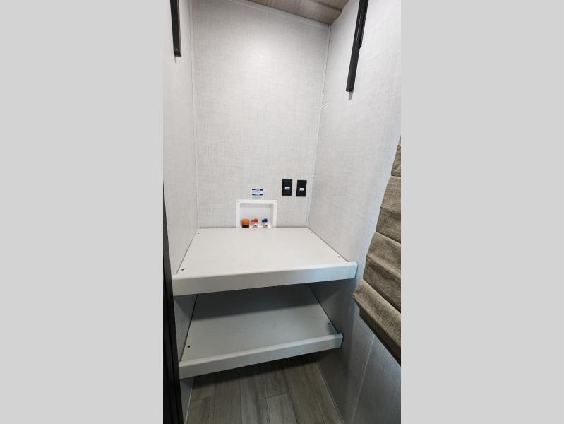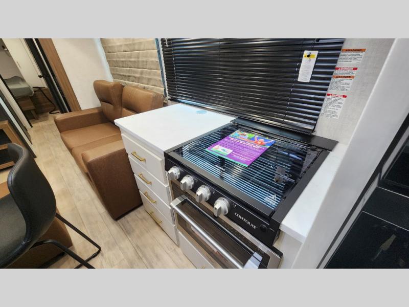 Whether you enjoy spending time outdoors or indoors, there is something for everyone in this travel trailer. The large pass-through storage can store your fishing poles, and the 20' electric awning with LED lights will create an outdoor living space. There is even an outdoor refrigerator with an outside storage cabinet and 32" TV! You will love all the interior space thanks to the dual opposing slides in the main living area, which will give the chef space to work around the kitchen island. Your crew can visit on the tri-fold sofa, theater seating and 5-person dinette while the fireplace is going, but you'll probably find the kids spending most of their time in the private bunkhouse! What more could you want in a travel trailer?!