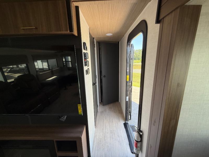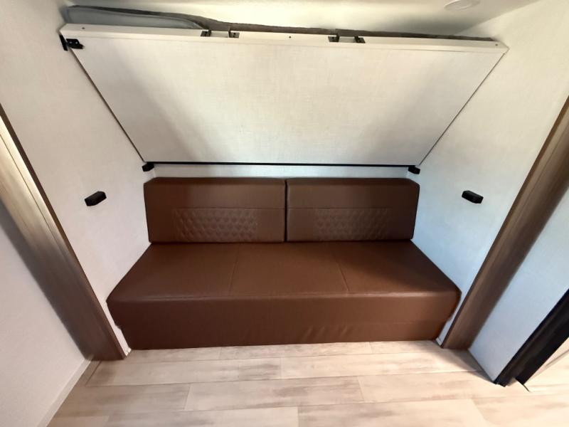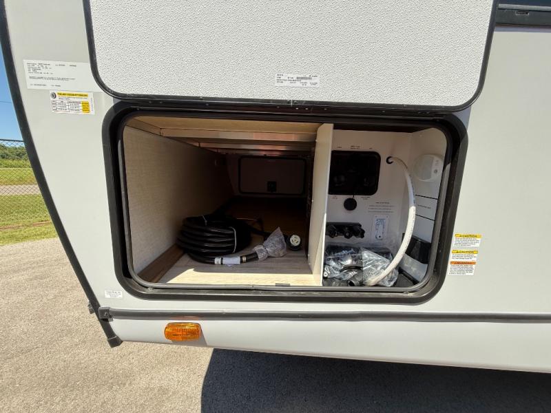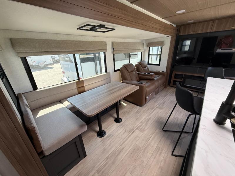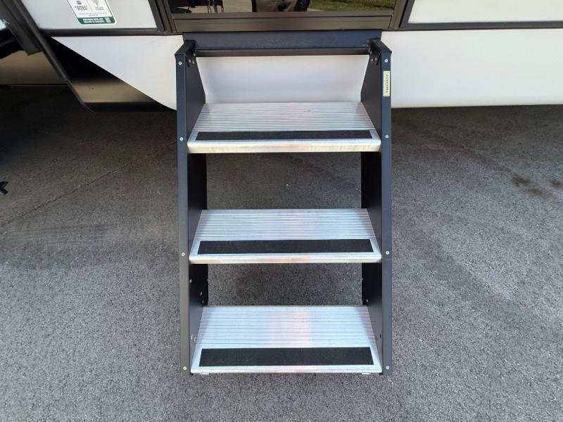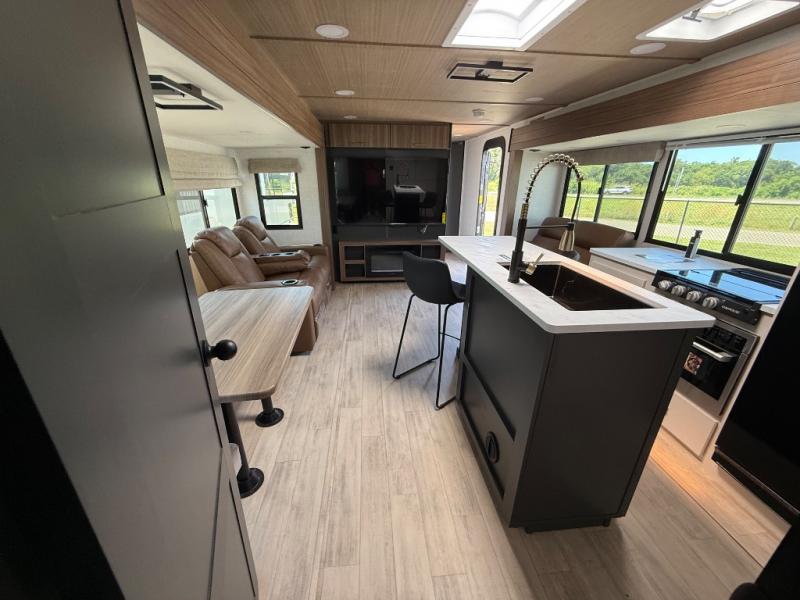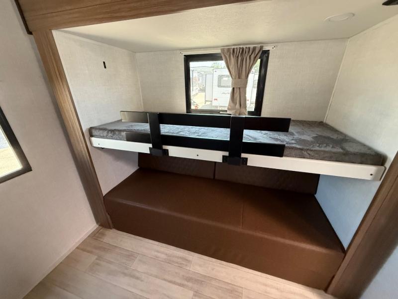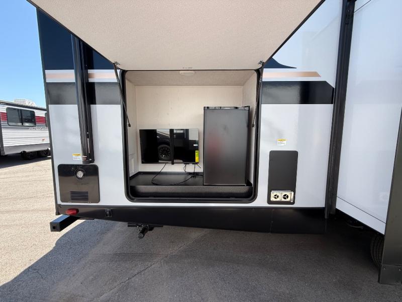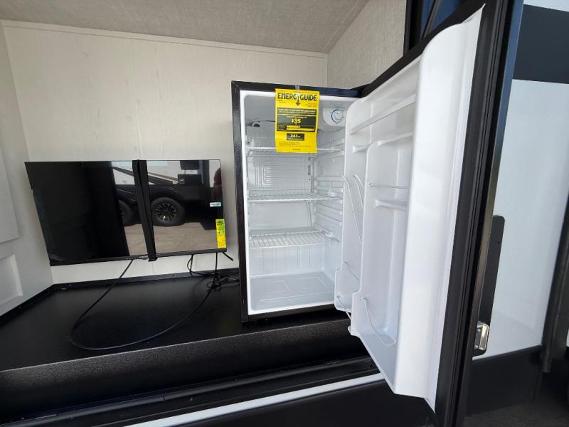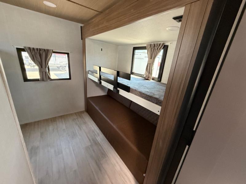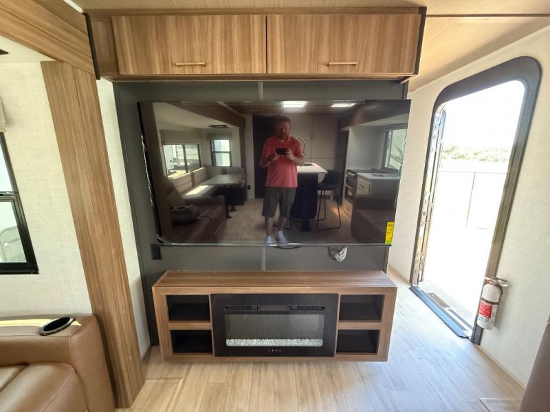Whether you enjoy spending time outdoors or indoors, there is something for everyone in this travel trailer. The large pass-through storage can store your fishing poles, and the 20' electric awning with LED lights will create an outdoor living space. There is even an outdoor refrigerator with an outside storage cabinet and 32" TV! You will love all the interior space thanks to the dual opposing slides in the main living area, which will give the chef space to work around the kitchen island. Your crew can visit on the tri-fold sofa, theater seating and 5-person dinette while the fireplace is going, but you'll probably find the kids spending most of their time in the private bunkhouse! What more could you want in a travel trailer?!