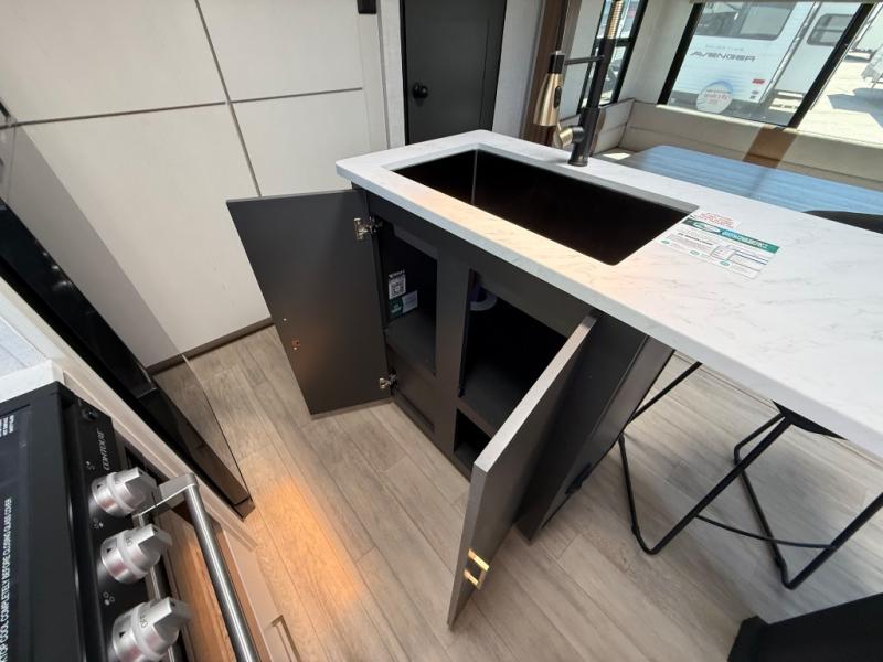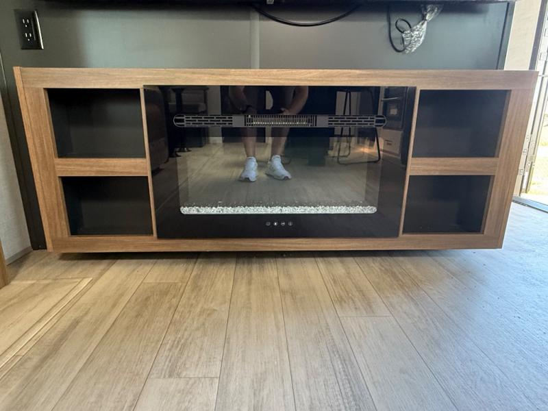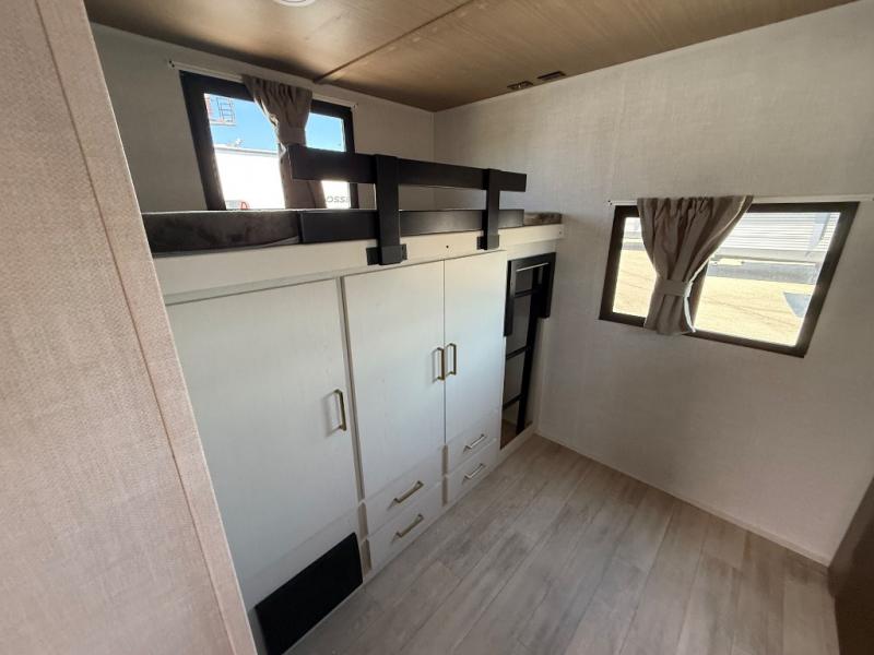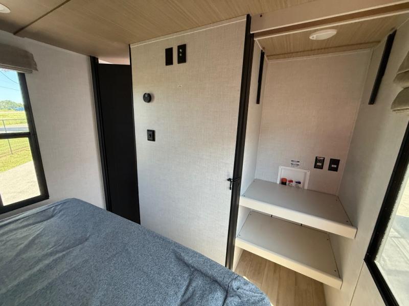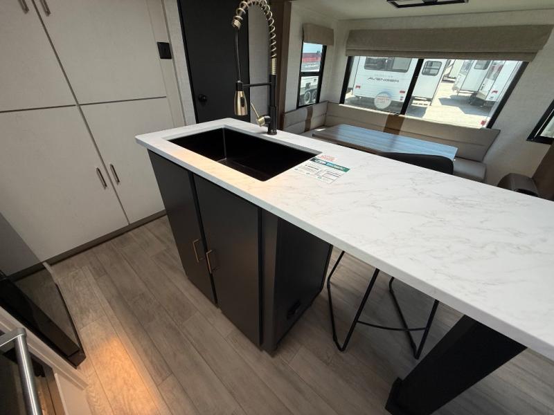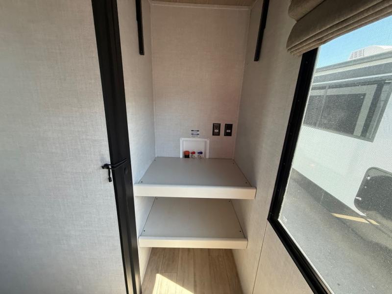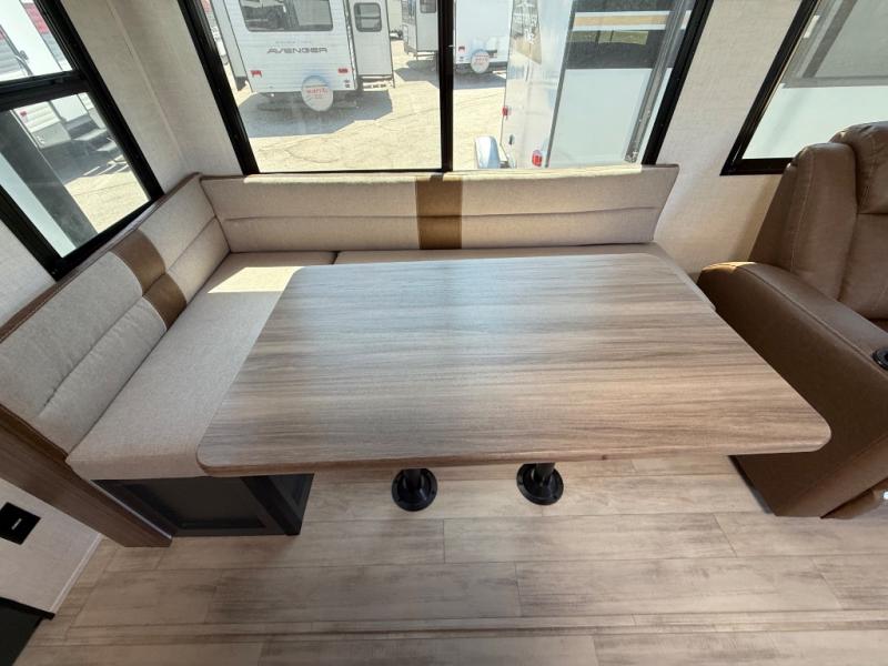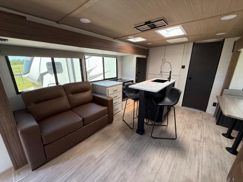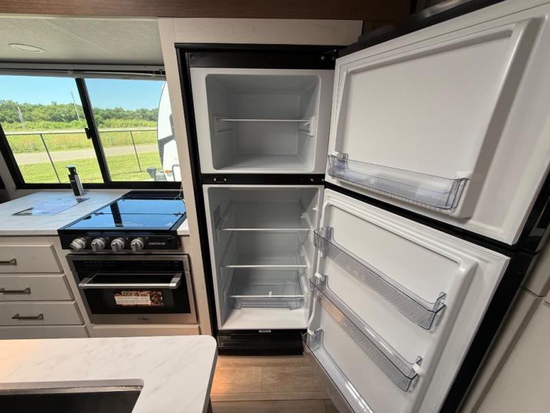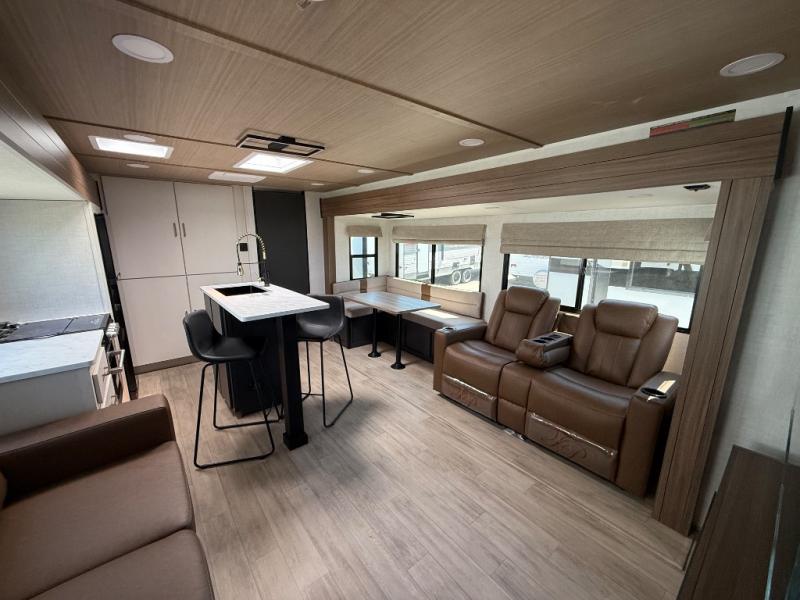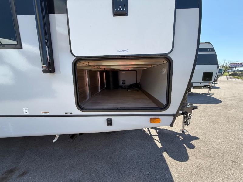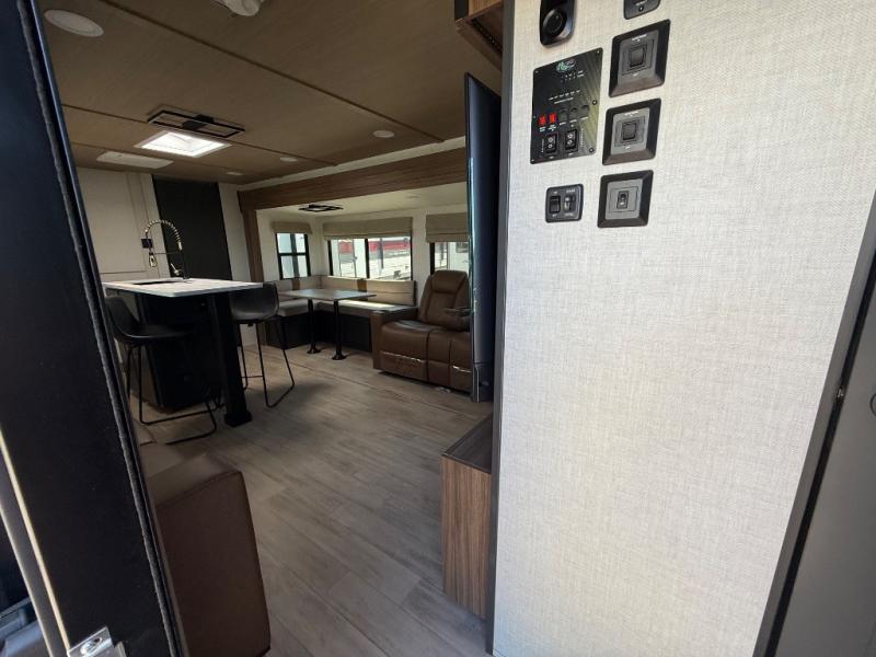 Whether you enjoy spending time outdoors or indoors, there is something for everyone in this travel trailer. The large pass-through storage can store your fishing poles, and the 20' electric awning with LED lights will create an outdoor living space. There is even an outdoor refrigerator with an outside storage cabinet and 32" TV! You will love all the interior space thanks to the dual opposing slides in the main living area, which will give the chef space to work around the kitchen island. Your crew can visit on the tri-fold sofa, theater seating and 5-person dinette while the fireplace is going, but you'll probably find the kids spending most of their time in the private bunkhouse! What more could you want in a travel trailer?!