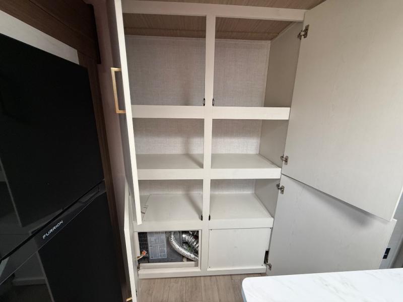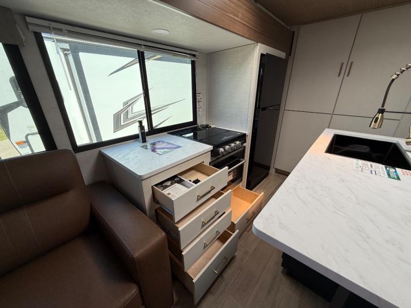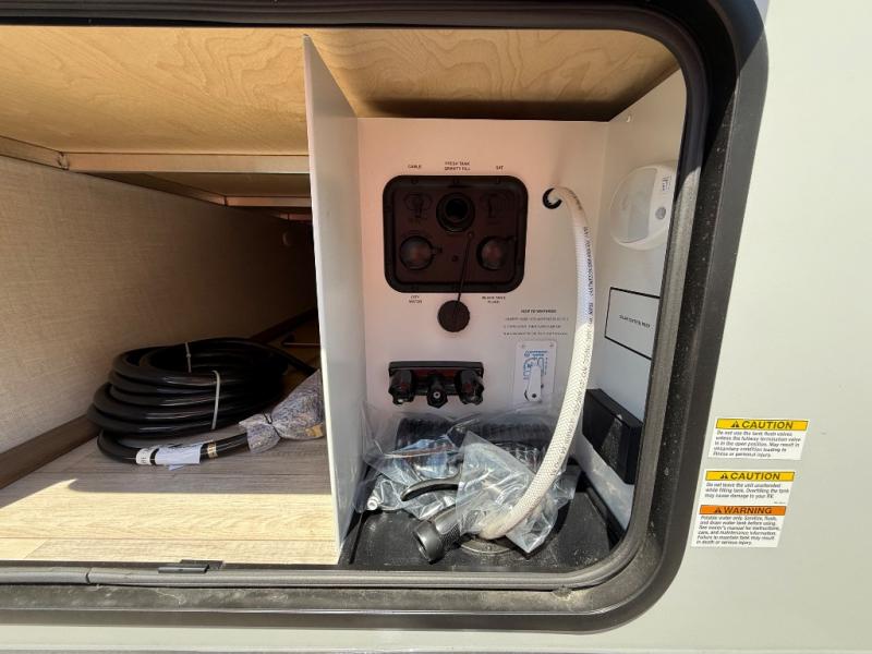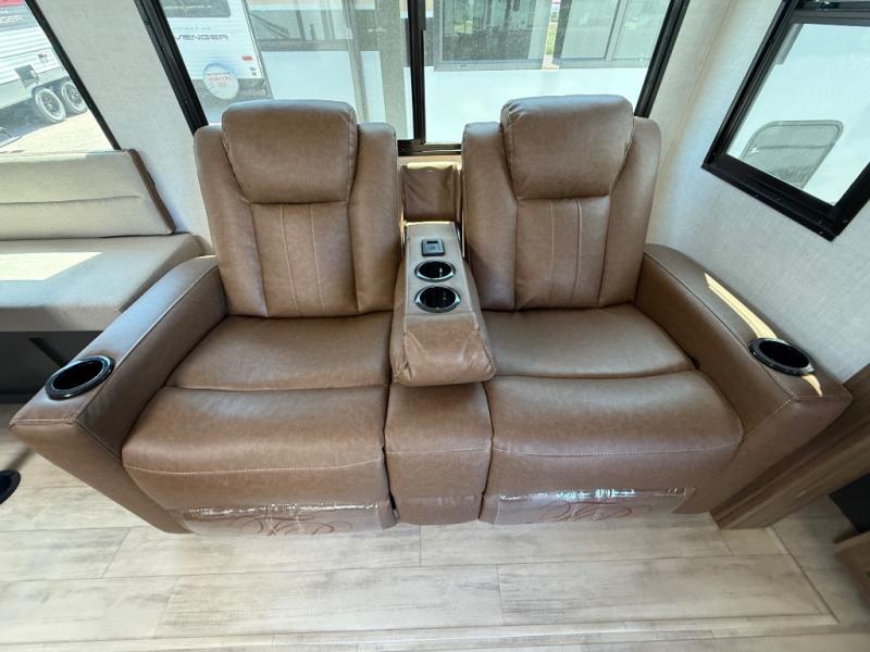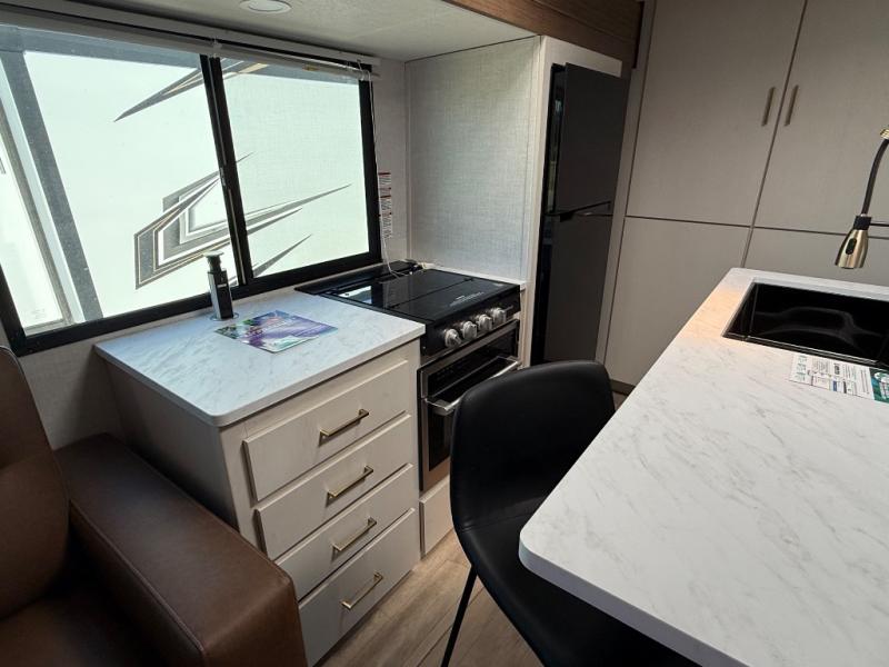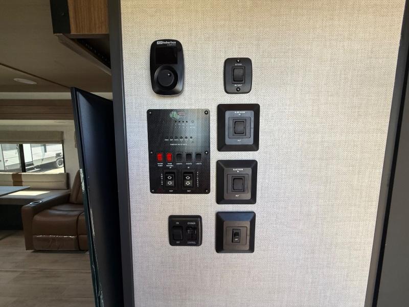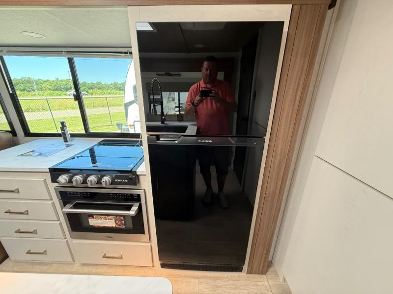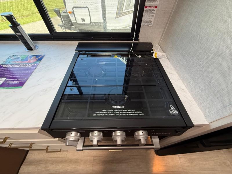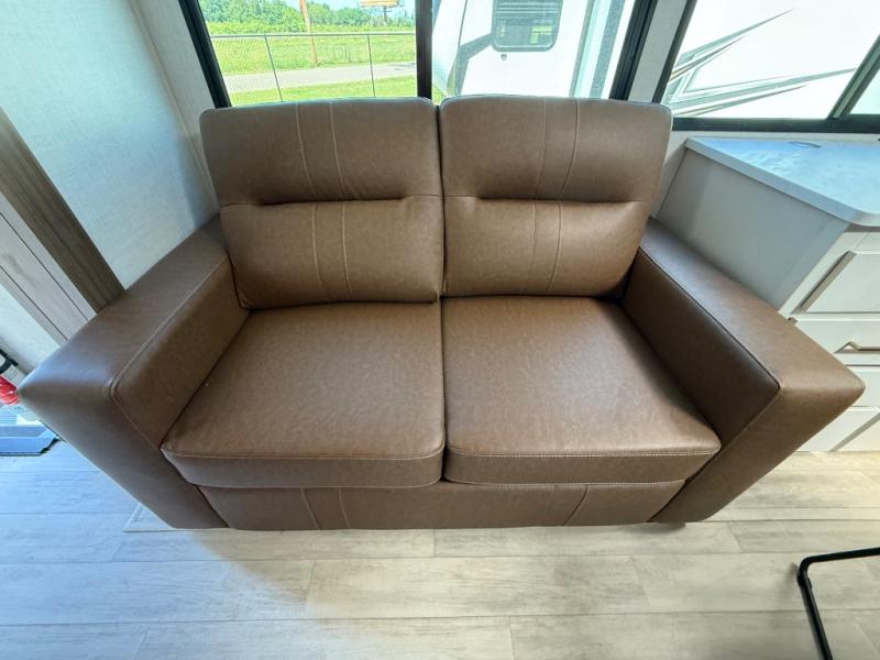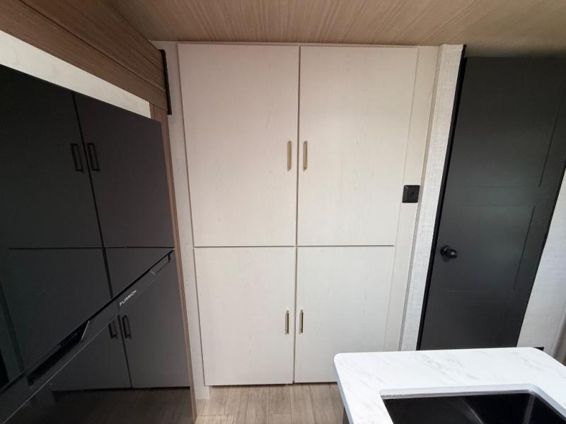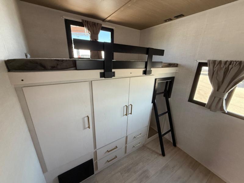 Whether you enjoy spending time outdoors or indoors, there is something for everyone in this travel trailer. The large pass-through storage can store your fishing poles, and the 20' electric awning with LED lights will create an outdoor living space. There is even an outdoor refrigerator with an outside storage cabinet and 32" TV! You will love all the interior space thanks to the dual opposing slides in the main living area, which will give the chef space to work around the kitchen island. Your crew can visit on the tri-fold sofa, theater seating and 5-person dinette while the fireplace is going, but you'll probably find the kids spending most of their time in the private bunkhouse! What more could you want in a travel trailer?!