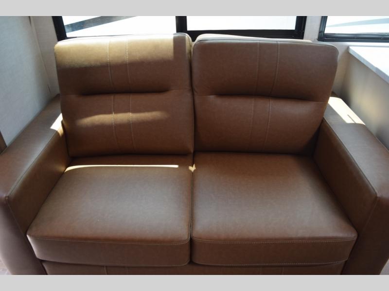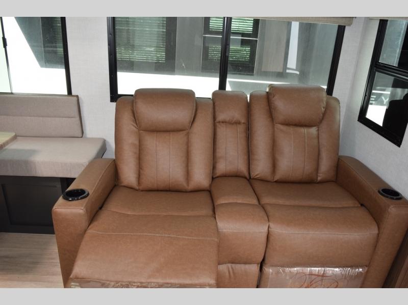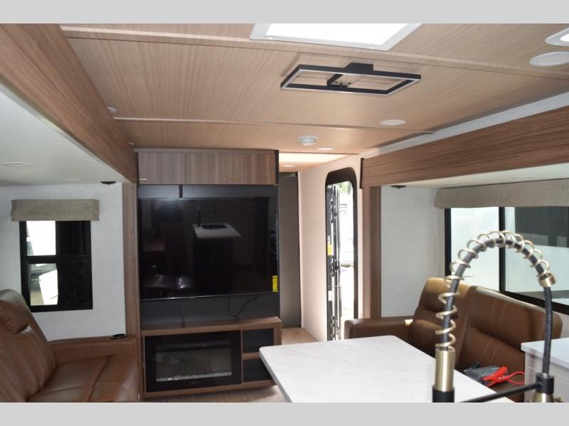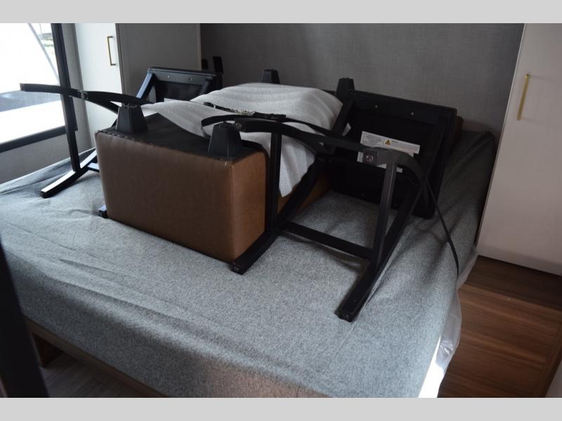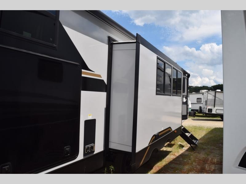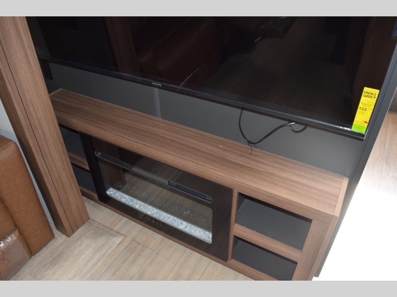 Whether you enjoy spending time outdoors or indoors, there is something for everyone in this travel trailer. The large pass-through storage can store your fishing poles, and the 20' electric awning with LED lights will create an outdoor living space. There is even an outdoor refrigerator with an outside storage cabinet and 32" TV! You will love all the interior space thanks to the dual opposing slides in the main living area, which will give the chef space to work around the kitchen island. Your crew can visit on the tri-fold sofa, theater seating and 5-person dinette while the fireplace is going, but you'll probably find the kids spending most of their time in the private bunkhouse! What more could you want in a travel trailer?!