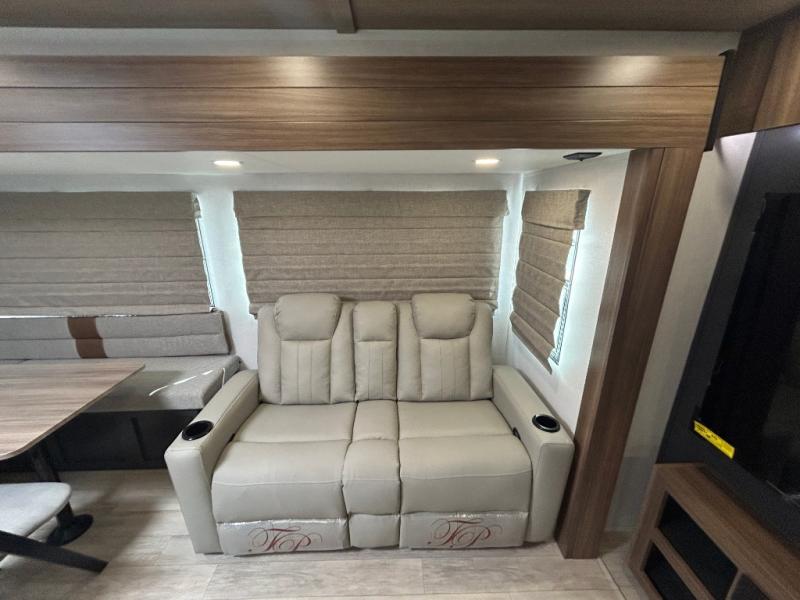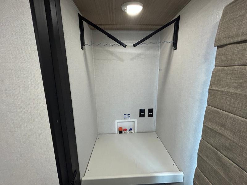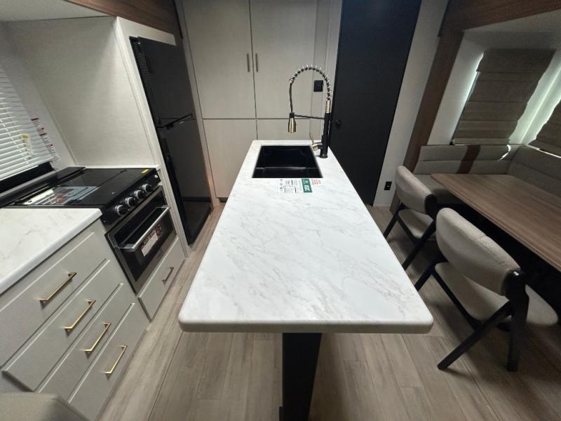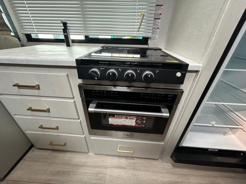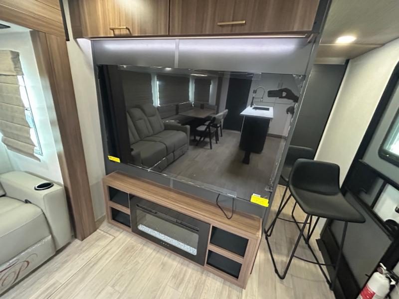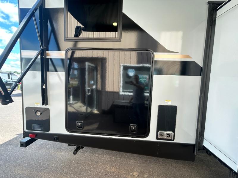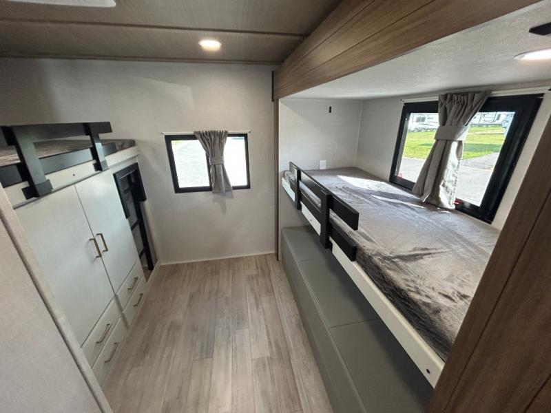 Whether you enjoy spending time outdoors or indoors, there is something for everyone in this travel trailer. The large pass-through storage can store your fishing poles, and the 20' electric awning with LED lights will create an outdoor living space. There is even an outdoor refrigerator with an outside storage cabinet and 32" TV! You will love all the interior space thanks to the dual opposing slides in the main living area, which will give the chef space to work around the kitchen island. Your crew can visit on the tri-fold sofa, theater seating and 5-person dinette while the fireplace is going, but you'll probably find the kids spending most of their time in the private bunkhouse! What more could you want in a travel trailer?!