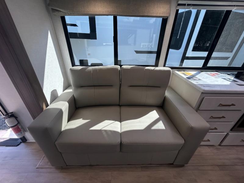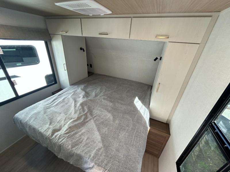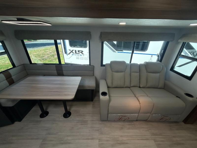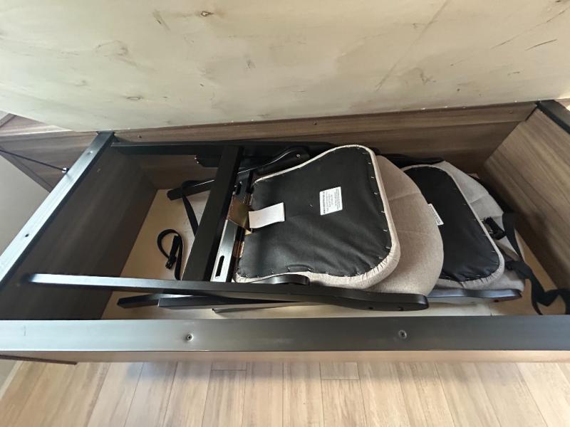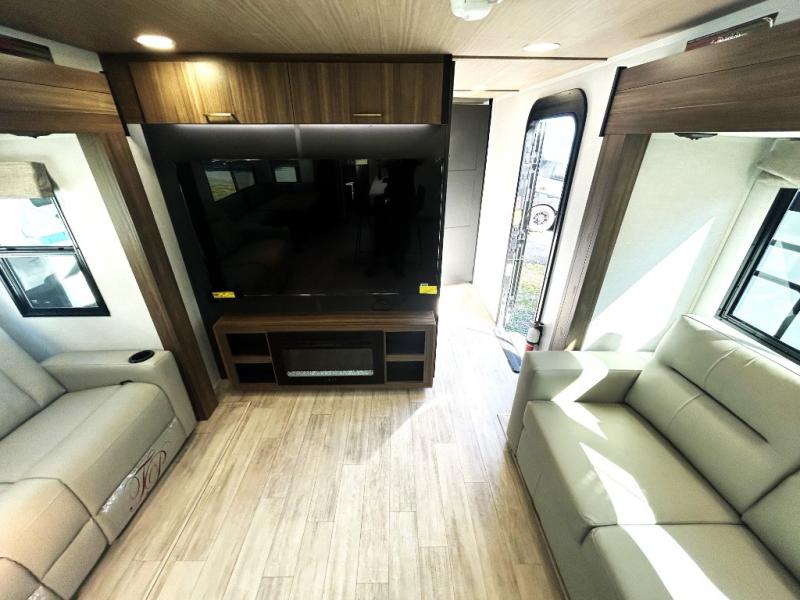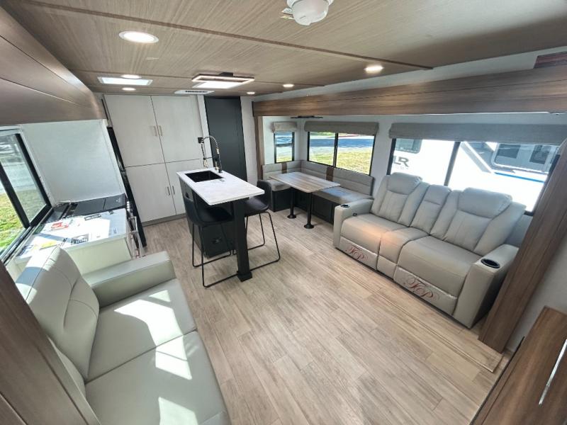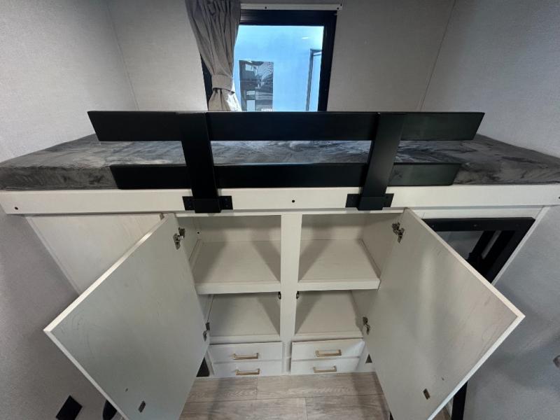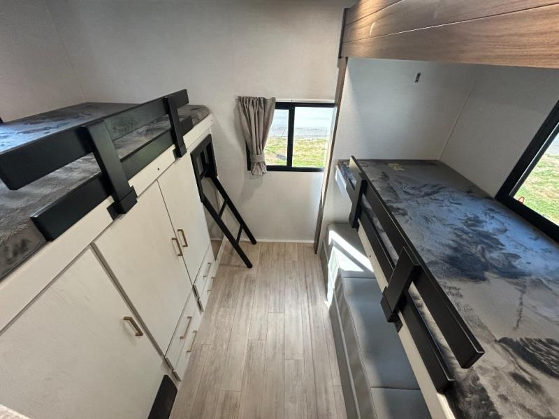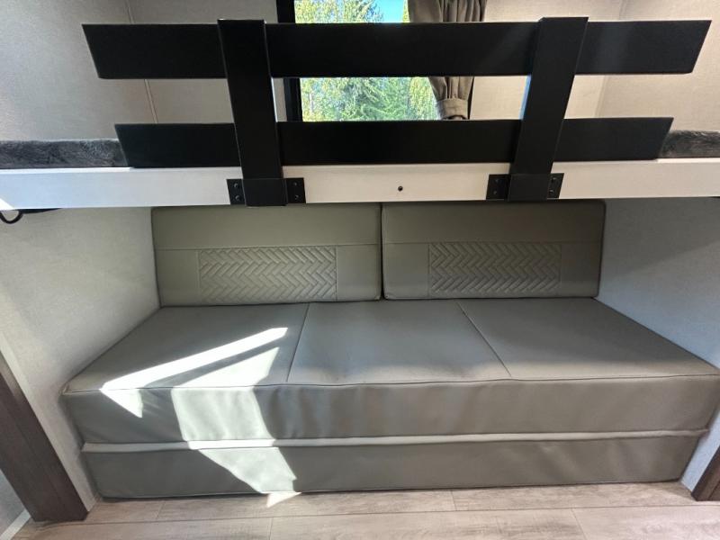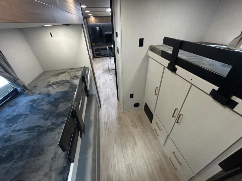 Whether you enjoy spending time outdoors or indoors, there is something for everyone in this travel trailer. The large pass-through storage can store your fishing poles, and the 20' electric awning with LED lights will create an outdoor living space. There is even an outdoor refrigerator with an outside storage cabinet and 32" TV! You will love all the interior space thanks to the dual opposing slides in the main living area, which will give the chef space to work around the kitchen island. Your crew can visit on the tri-fold sofa, theater seating and 5-person dinette while the fireplace is going, but you'll probably find the kids spending most of their time in the private bunkhouse! What more could you want in a travel trailer?!