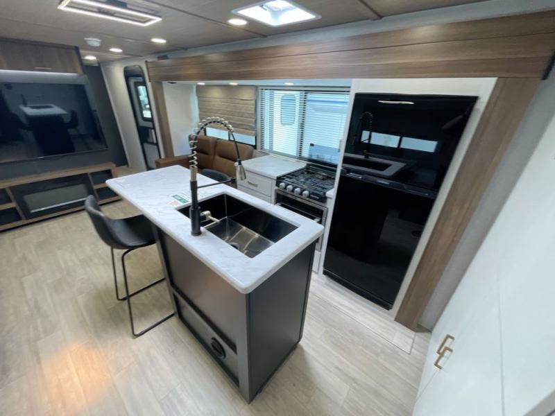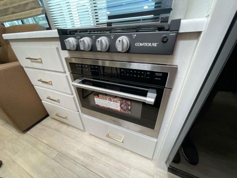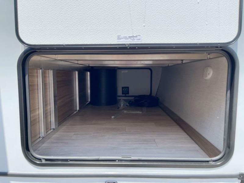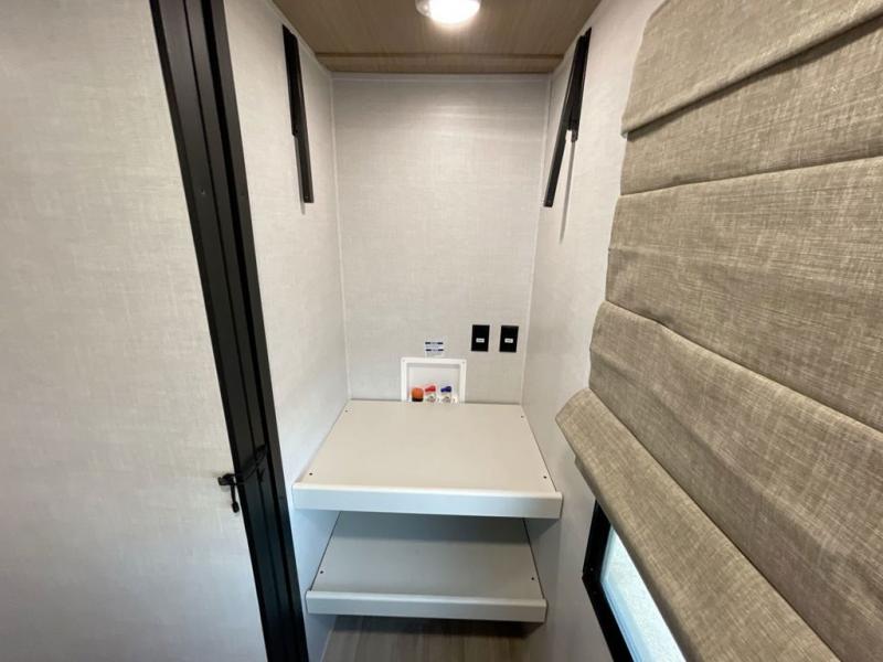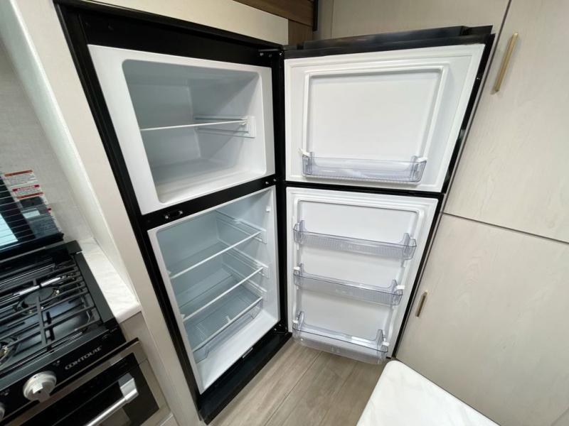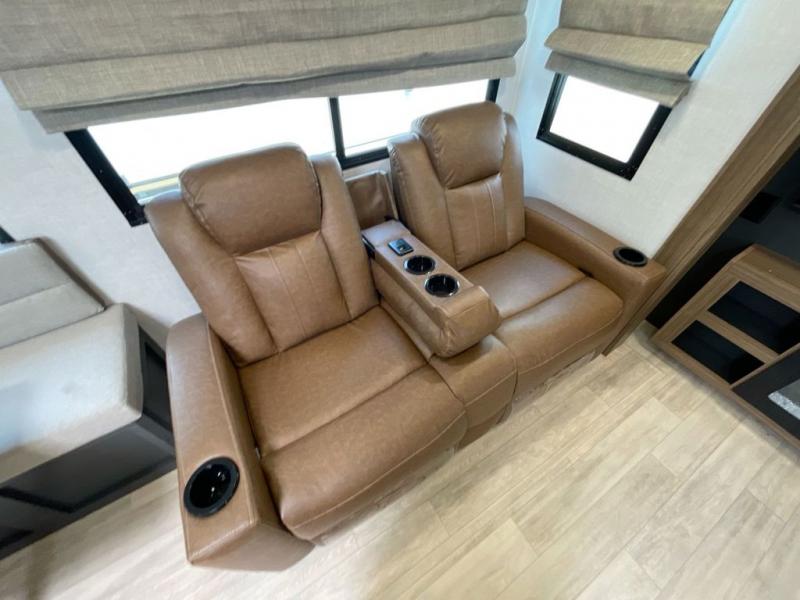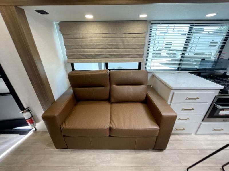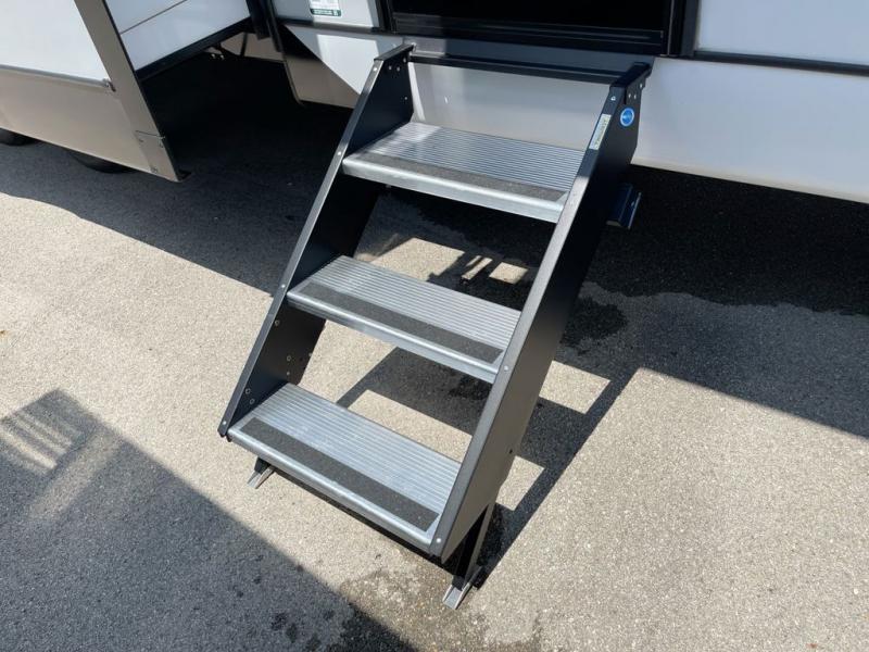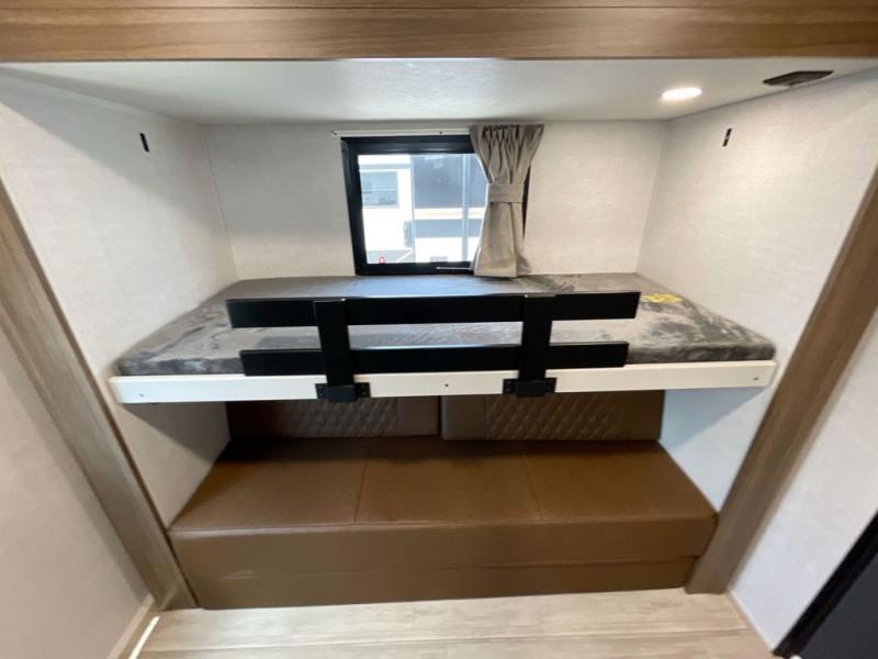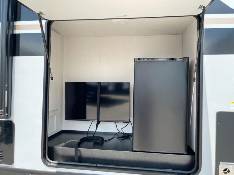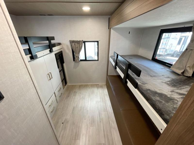 Whether you enjoy spending time outdoors or indoors, there is something for everyone in this travel trailer. The large pass-through storage can store your fishing poles, and the 20' electric awning with LED lights will create an outdoor living space. There is even an outdoor refrigerator with an outside storage cabinet and 32" TV! You will love all the interior space thanks to the dual opposing slides in the main living area, which will give the chef space to work around the kitchen island. Your crew can visit on the tri-fold sofa, theater seating and 5-person dinette while the fireplace is going, but you'll probably find the kids spending most of their time in the private bunkhouse! What more could you want in a travel trailer?!