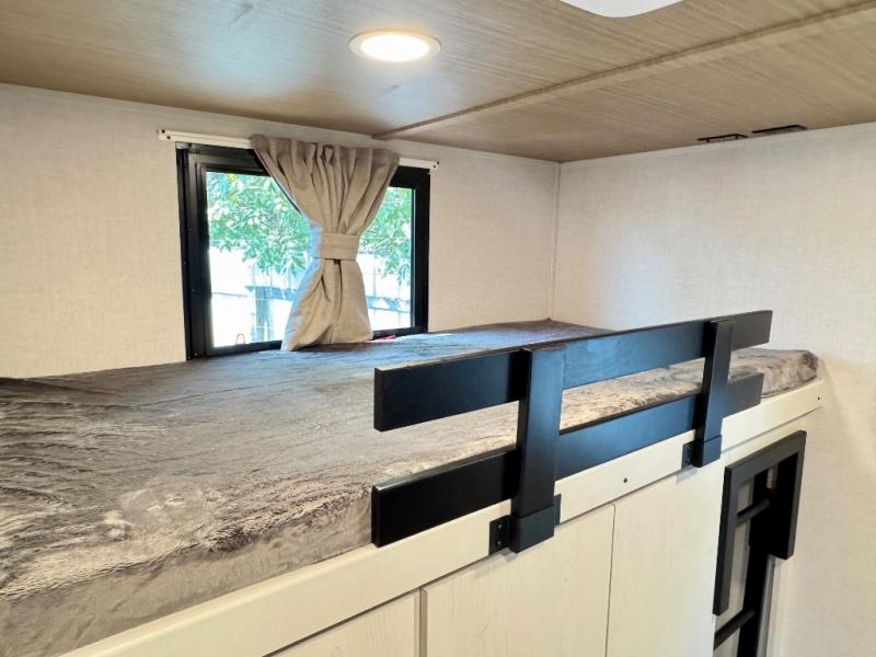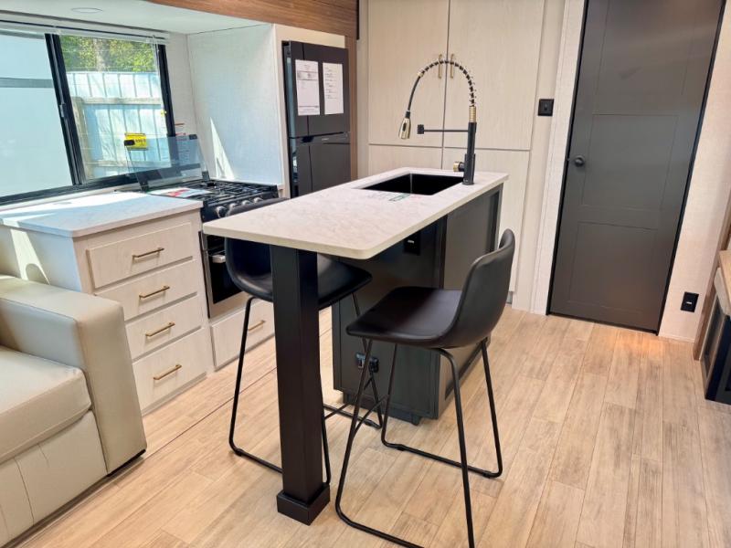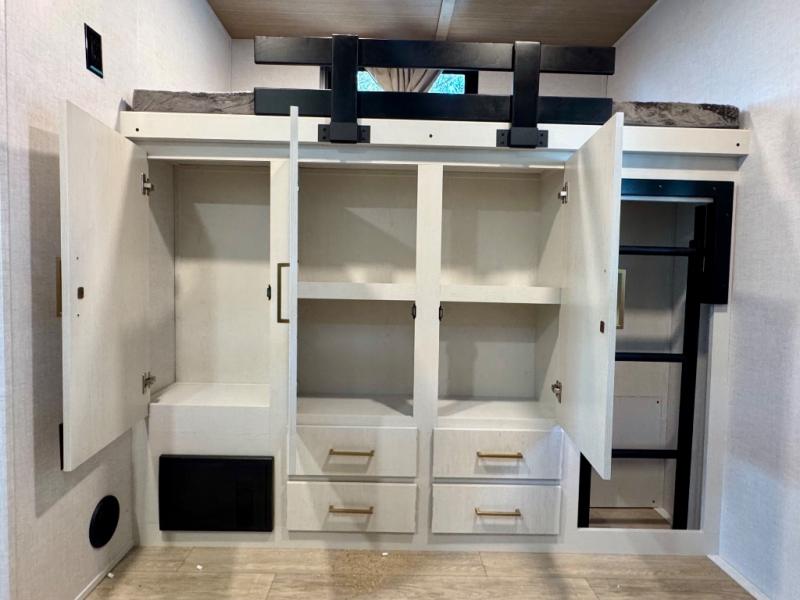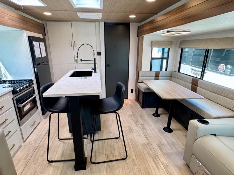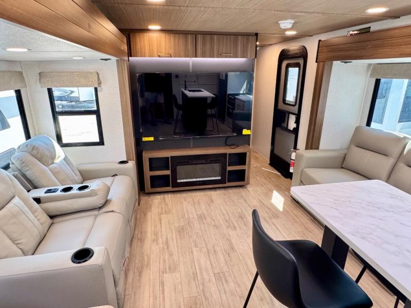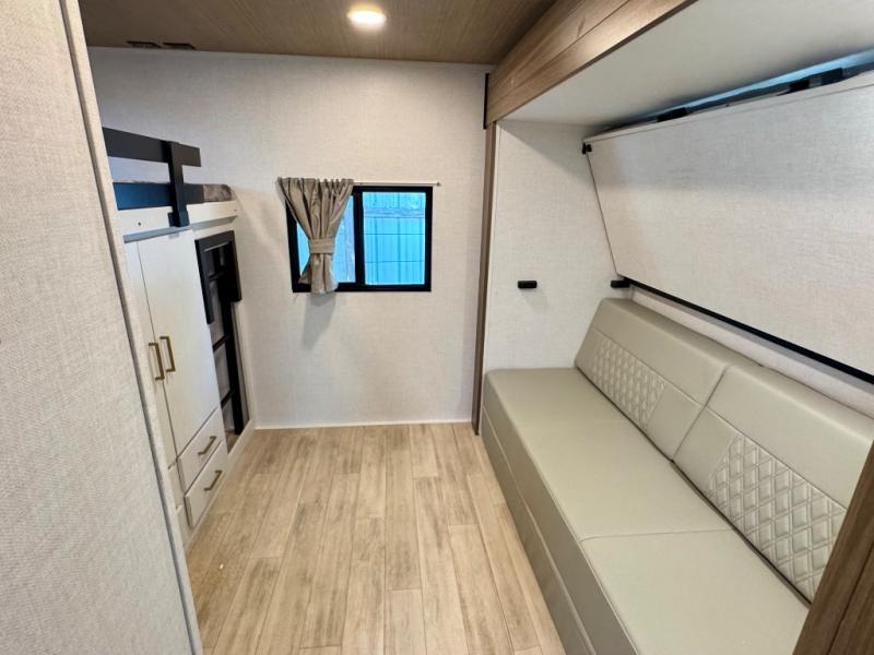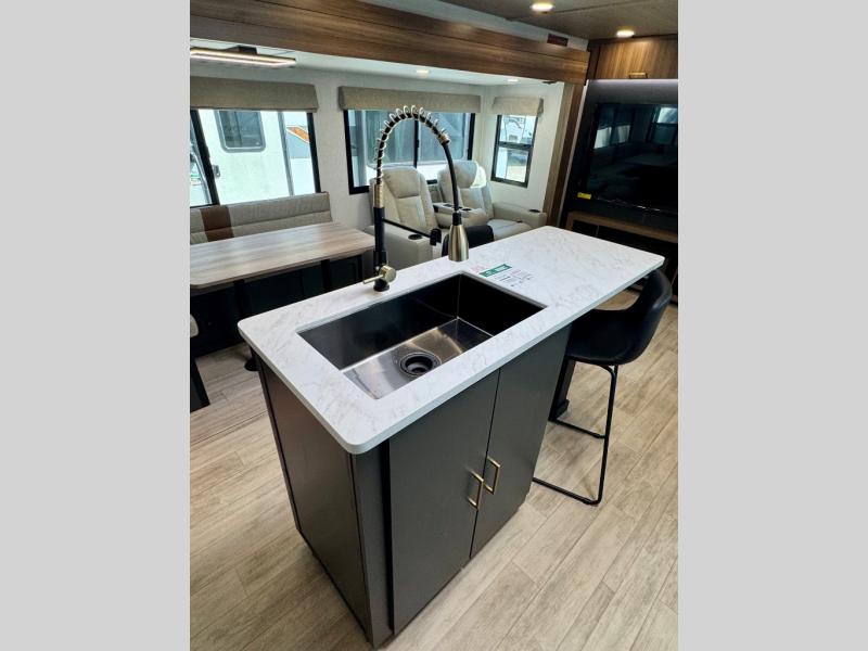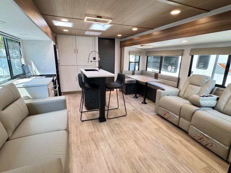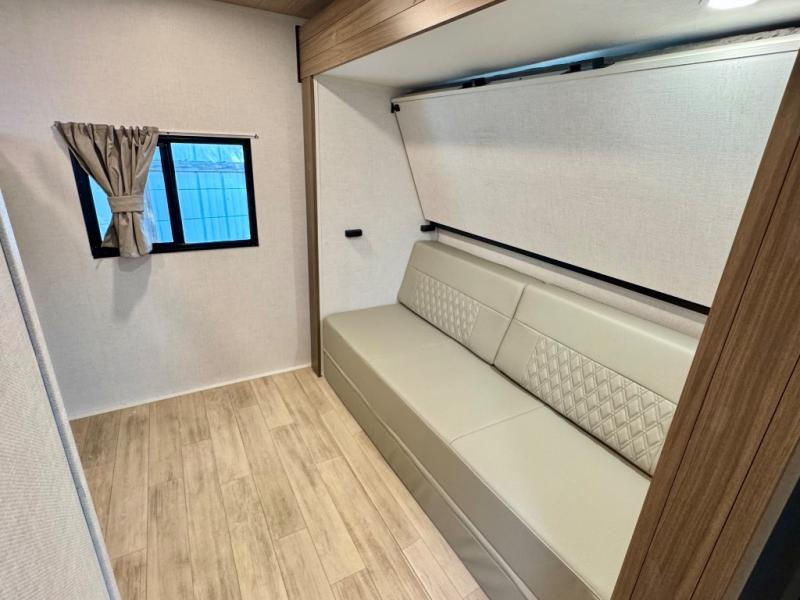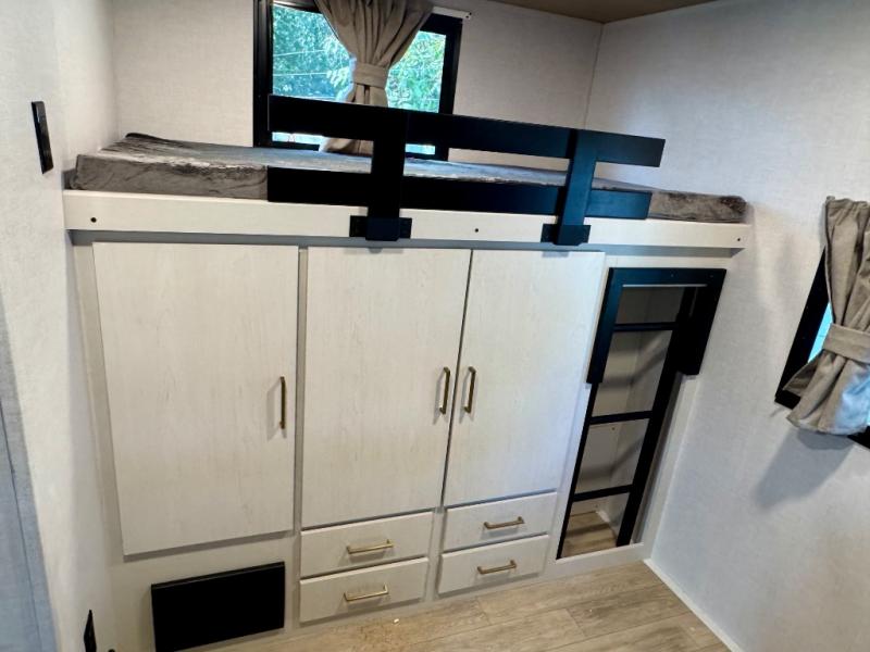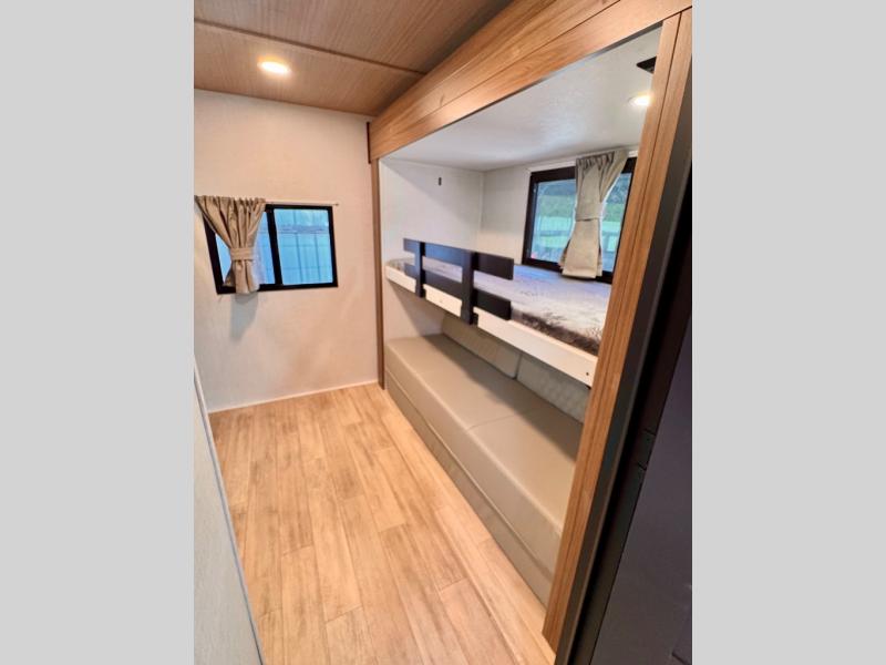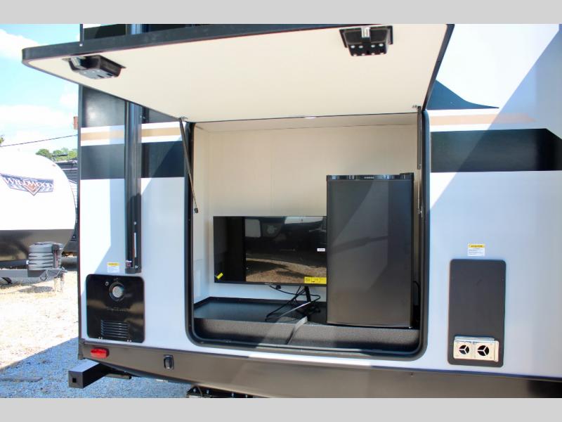 Whether you enjoy spending time outdoors or indoors, there is something for everyone in this travel trailer. The large pass-through storage can store your fishing poles, and the 20' electric awning with LED lights will create an outdoor living space. There is even an outdoor refrigerator with an outside storage cabinet and 32" TV! You will love all the interior space thanks to the dual opposing slides in the main living area, which will give the chef space to work around the kitchen island. Your crew can visit on the tri-fold sofa, theater seating and 5-person dinette while the fireplace is going, but you'll probably find the kids spending most of their time in the private bunkhouse! What more could you want in a travel trailer?!
