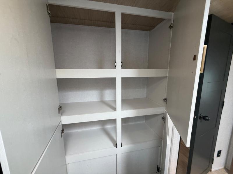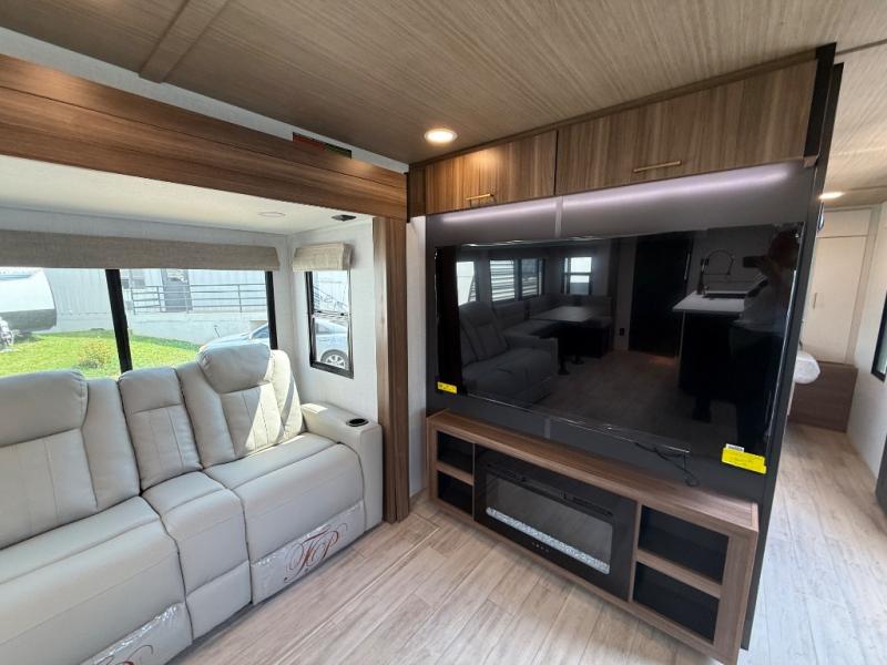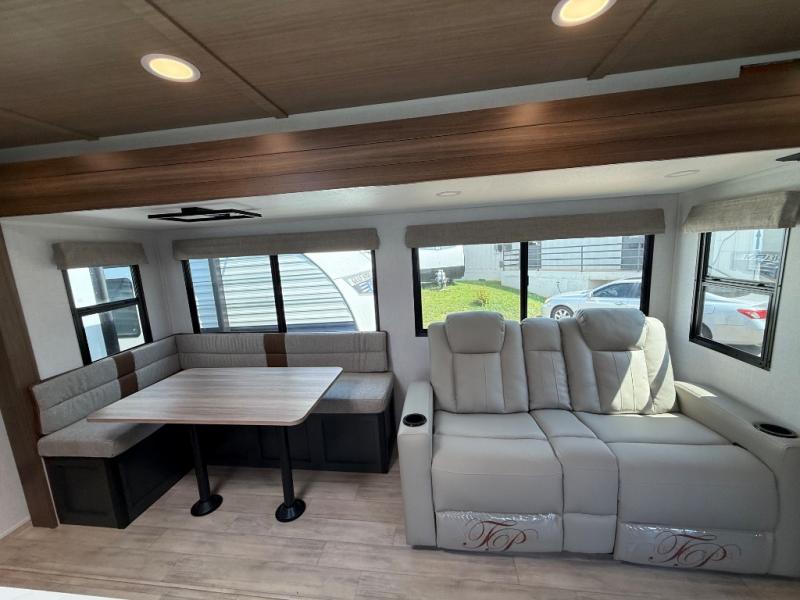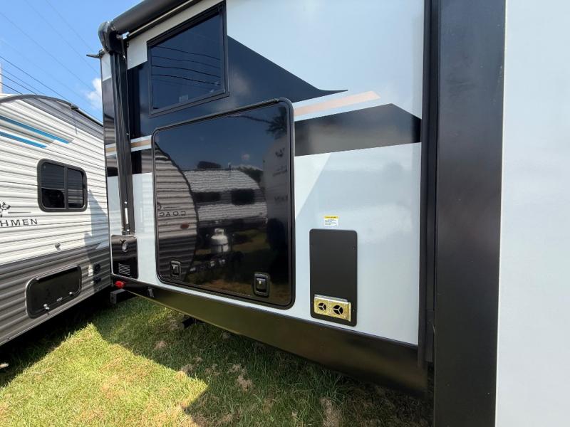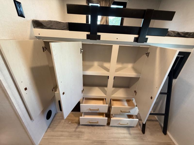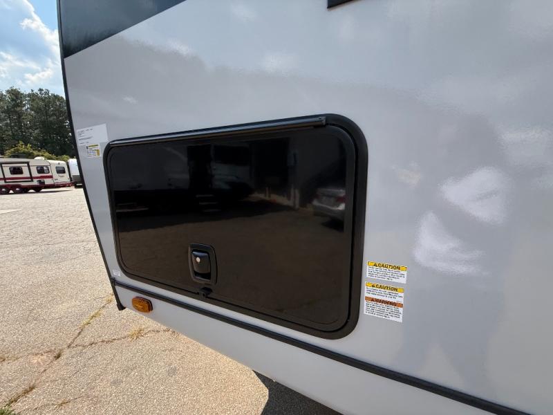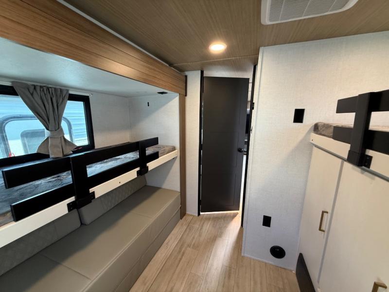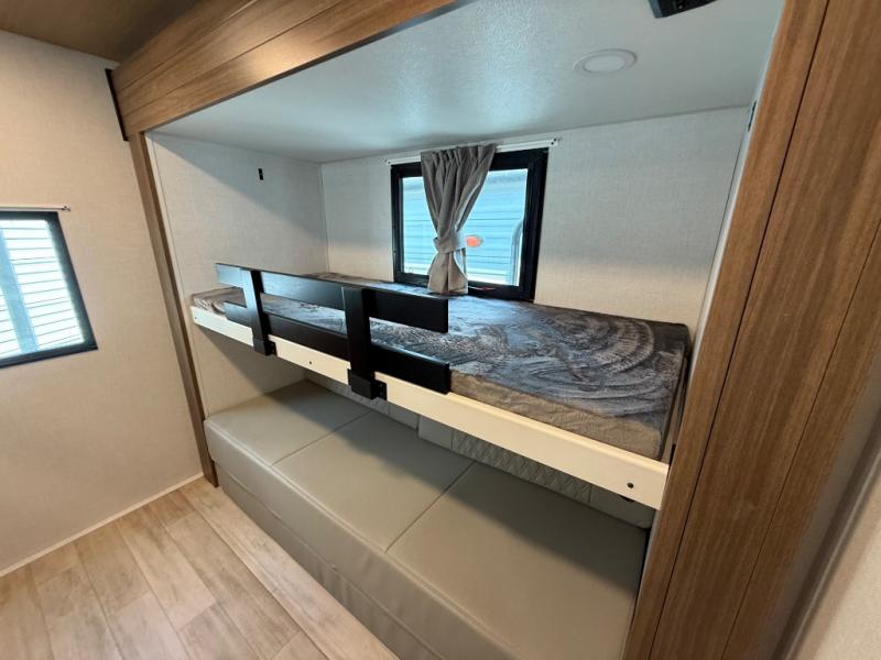 Whether you enjoy spending time outdoors or indoors, there is something for everyone in this travel trailer. The large pass-through storage can store your fishing poles, and the 20' electric awning with LED lights will create an outdoor living space. There is even an outdoor refrigerator with an outside storage cabinet and 32" TV! You will love all the interior space thanks to the dual opposing slides in the main living area, which will give the chef space to work around the kitchen island. Your crew can visit on the tri-fold sofa, theater seating and 5-person dinette while the fireplace is going, but you'll probably find the kids spending most of their time in the private bunkhouse! What more could you want in a travel trailer?!