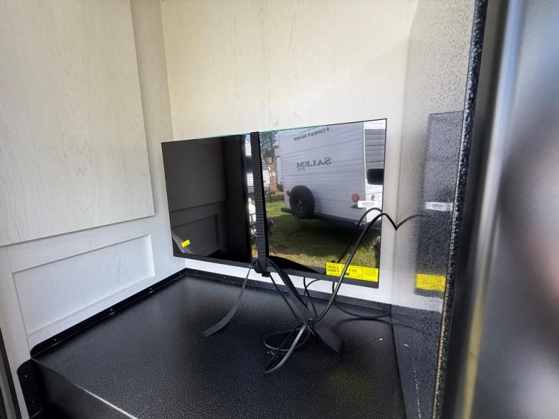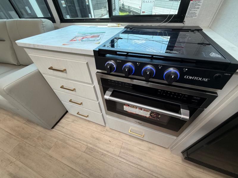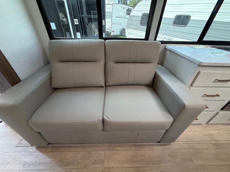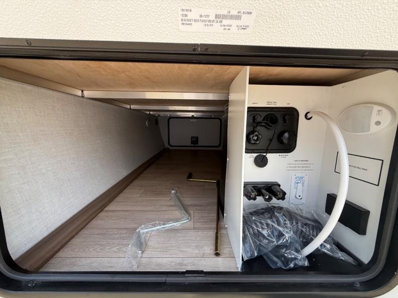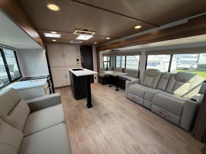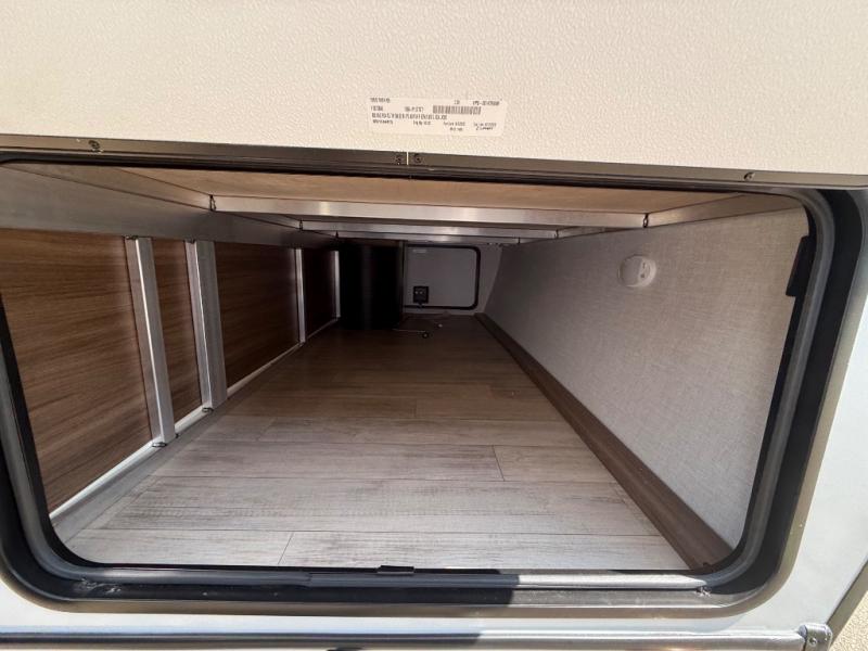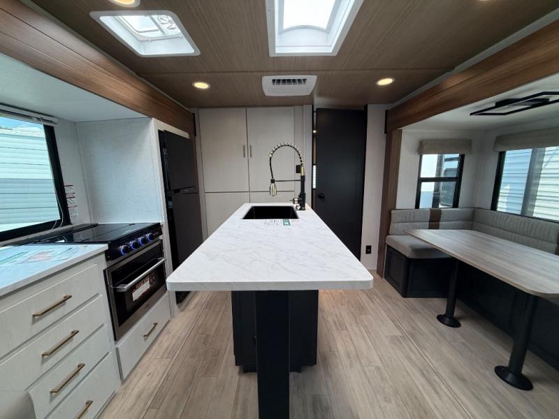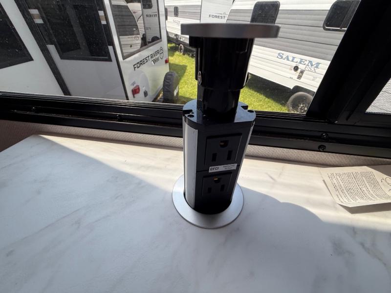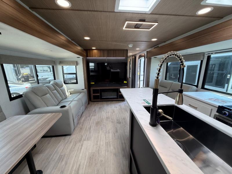 Whether you enjoy spending time outdoors or indoors, there is something for everyone in this travel trailer. The large pass-through storage can store your fishing poles, and the 20' electric awning with LED lights will create an outdoor living space. There is even an outdoor refrigerator with an outside storage cabinet and 32" TV! You will love all the interior space thanks to the dual opposing slides in the main living area, which will give the chef space to work around the kitchen island. Your crew can visit on the tri-fold sofa, theater seating and 5-person dinette while the fireplace is going, but you'll probably find the kids spending most of their time in the private bunkhouse! What more could you want in a travel trailer?!