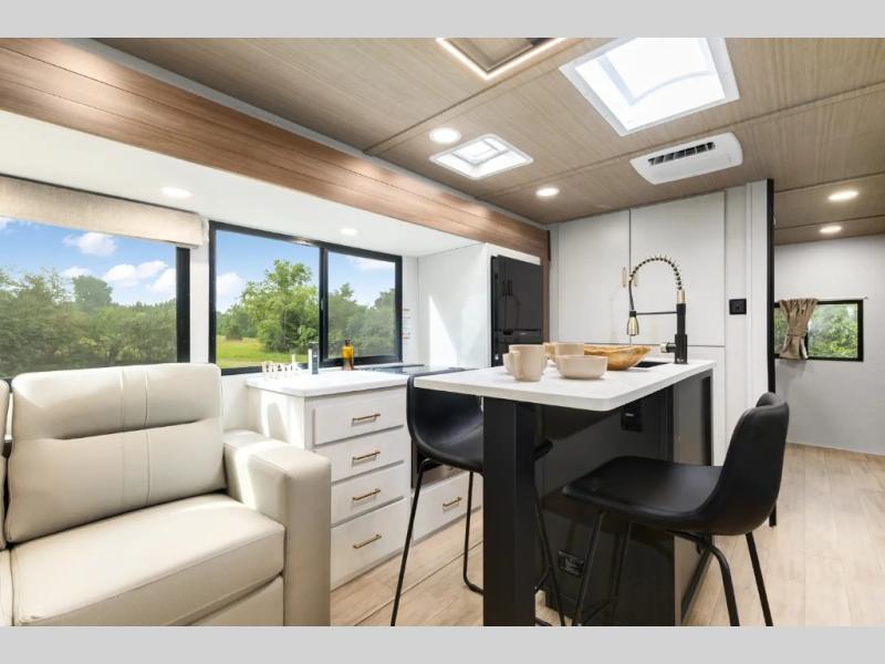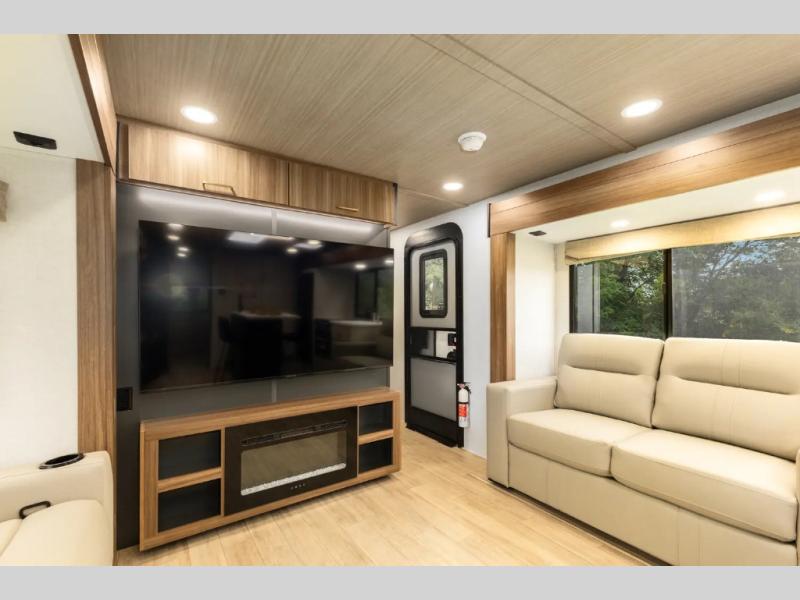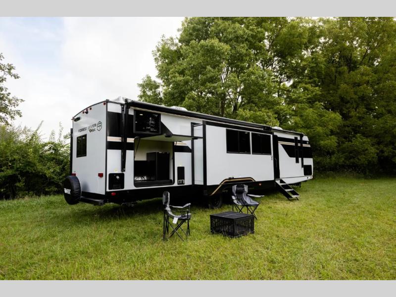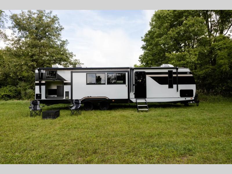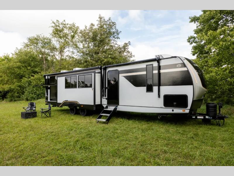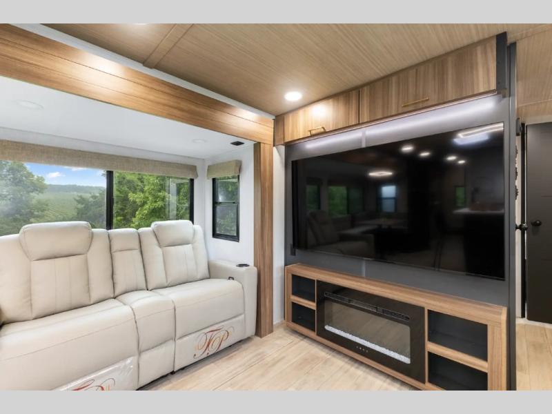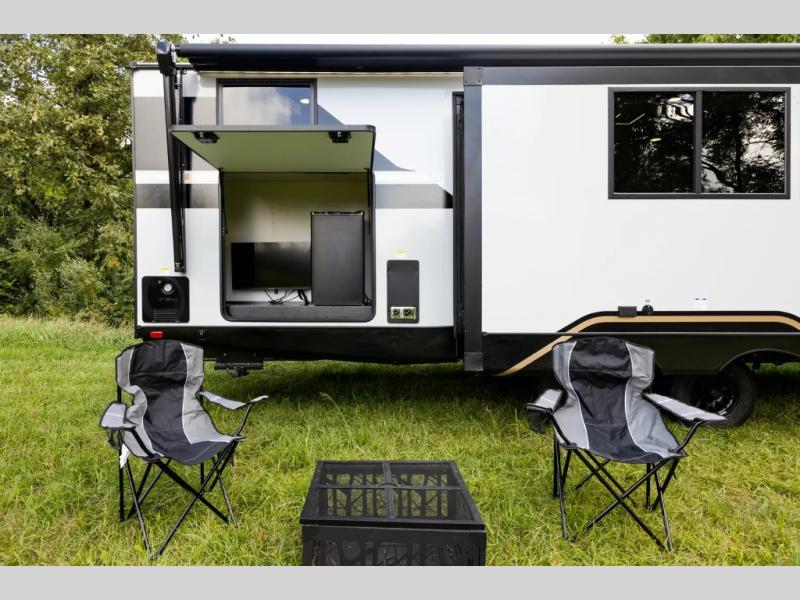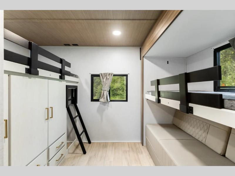 Whether you enjoy spending time outdoors or indoors, there is something for everyone in this travel trailer. The large pass-through storage can store your fishing poles, and the 20' electric awning with LED lights will create an outdoor living space. There is even an outdoor refrigerator with an outside storage cabinet and 32" TV! You will love all the interior space thanks to the dual opposing slides in the main living area, which will give the chef space to work around the kitchen island. Your crew can visit on the tri-fold sofa, theater seating and 5-person dinette while the fireplace is going, but you'll probably find the kids spending most of their time in the private bunkhouse! What more could you want in a travel trailer?!