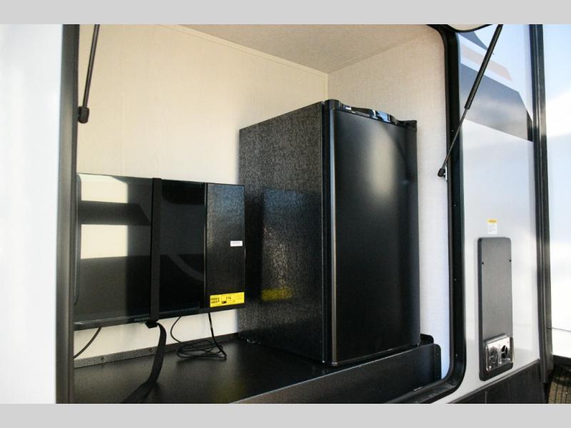 Spend more time outside under the 20-foot electric awning with LED lighting. Grab cold drinks from the outdoor refrigerator, stash essentials in the exterior storage cabinet, and catch the big game or movie night on the 32-inch outdoor TV. The large pass-through storage is perfect for fishing gear, camp chairs, or adventure accessories.