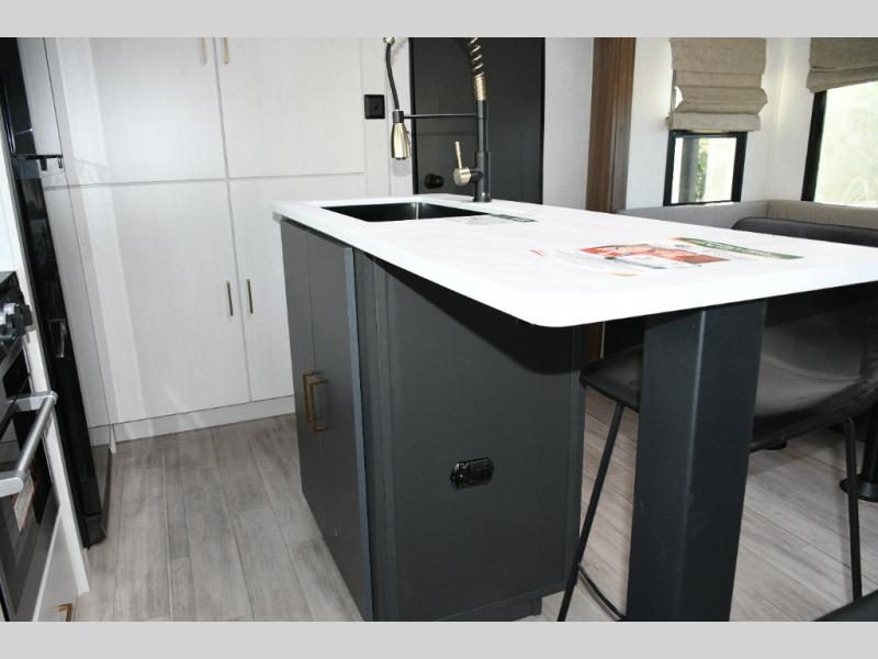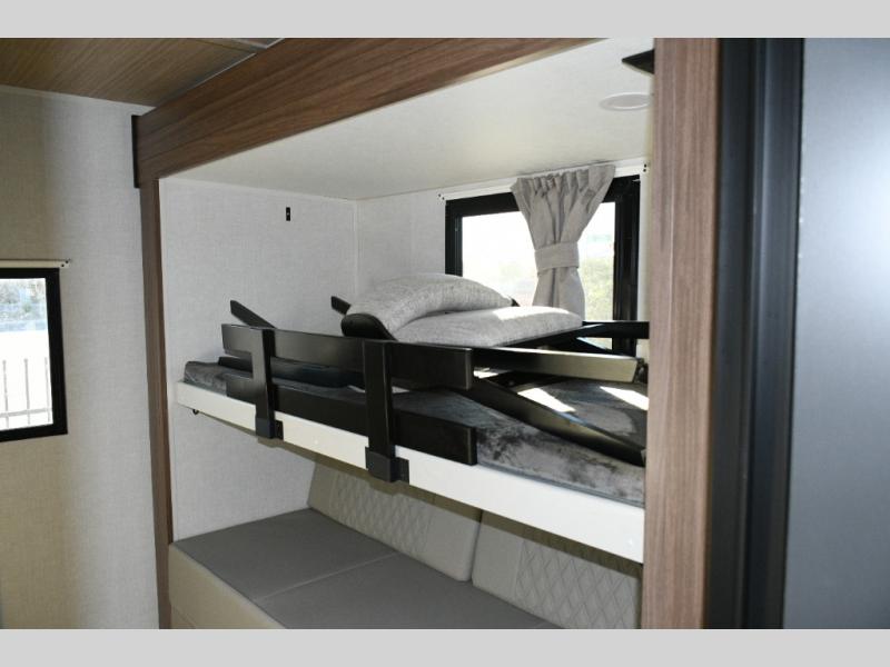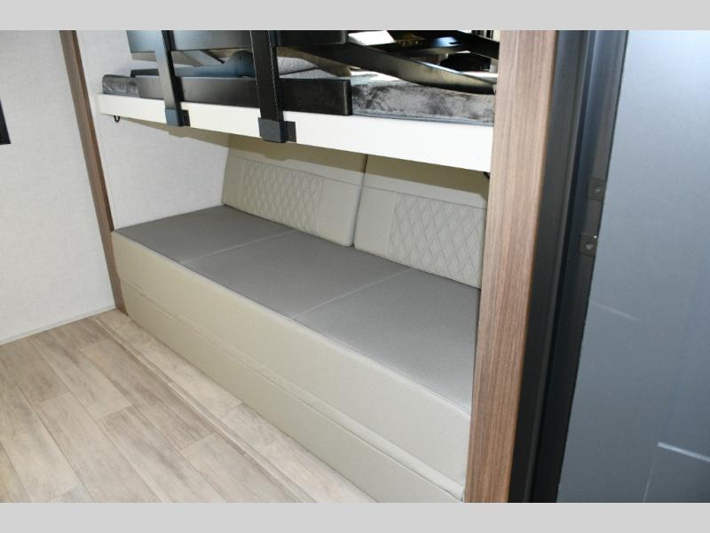 Whether you're entertaining guests or unwinding after a long day outdoors, the dual opposing slides create an impressively open living area. The kitchen island offers great prep space, while the tri-fold sofa, theater seating, and 5-person dinette provide comfortable spots for everyone to settle in. The fireplace sets the mood for cozy evenings, and the private bunkhouse gives kids or guests their own dedicated space to relax.