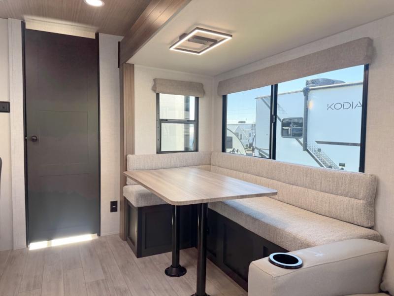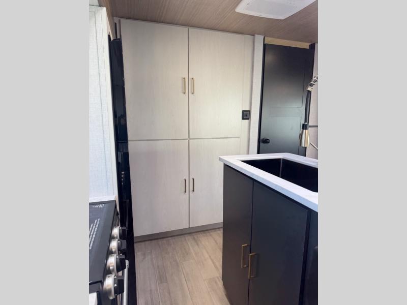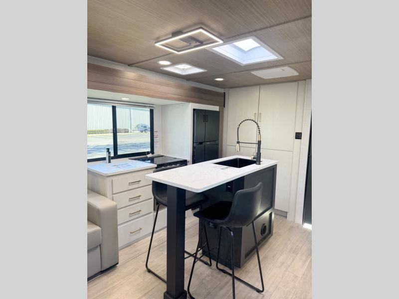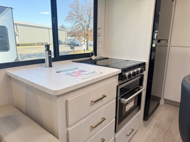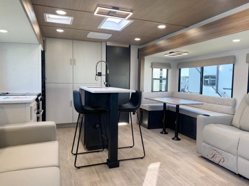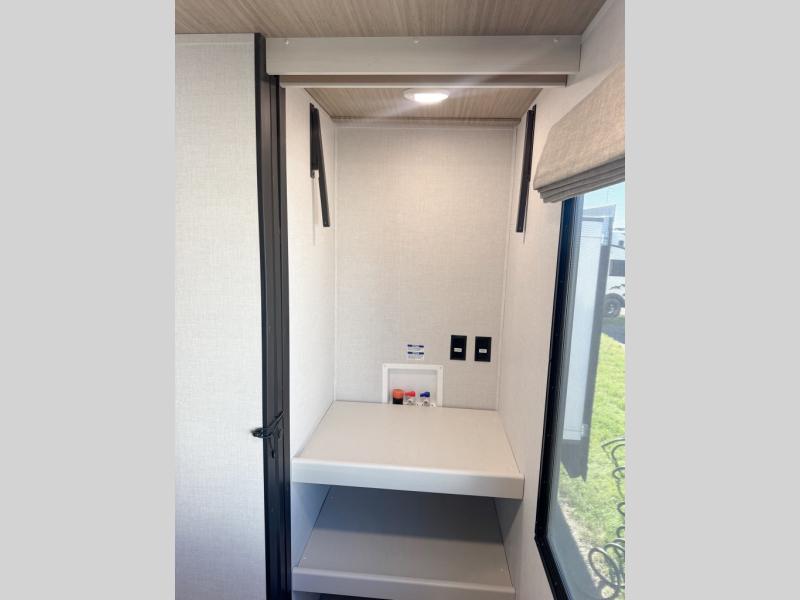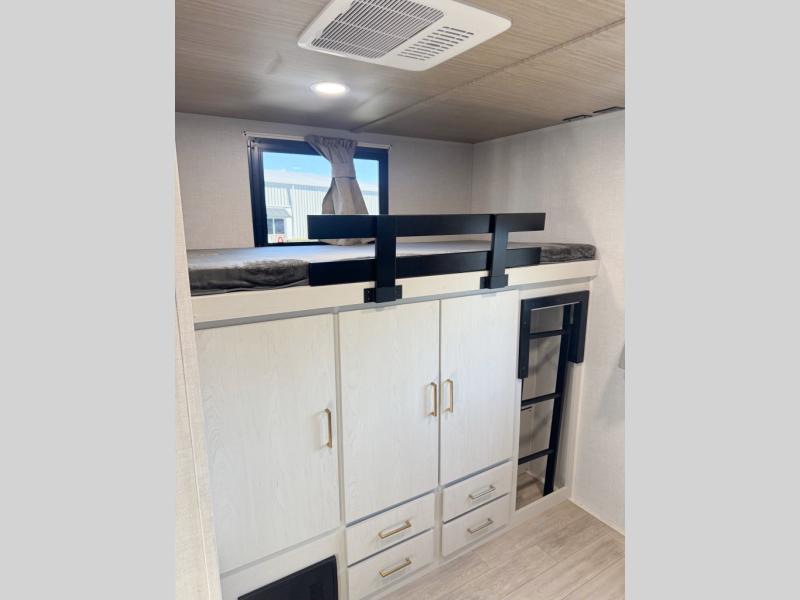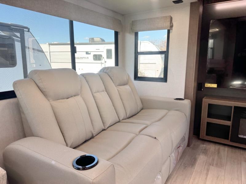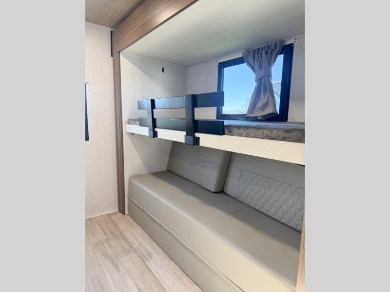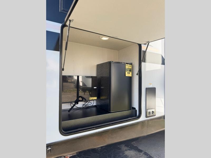 Whether you enjoy spending time outdoors or indoors, there is something for everyone in this travel trailer. The large pass-through storage can store your fishing poles, and the 20' electric awning with LED lights will create an outdoor living space. There is even an outdoor refrigerator with an outside storage cabinet and 32" TV! You will love all the interior space thanks to the dual opposing slides in the main living area, which will give the chef space to work around the kitchen island. Your crew can visit on the tri-fold sofa, theater seating and 5-person dinette while the fireplace is going, but you'll probably find the kids spending most of their time in the private bunkhouse! What more could you want in a travel trailer?!