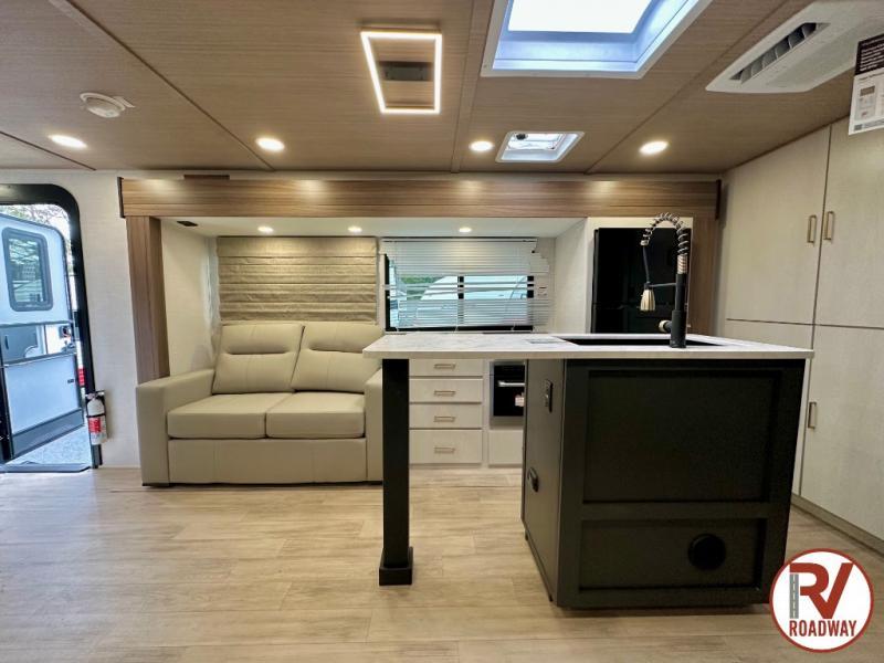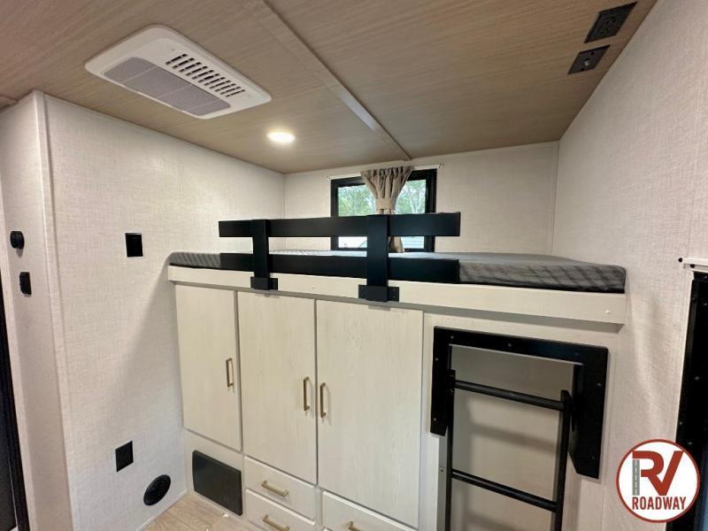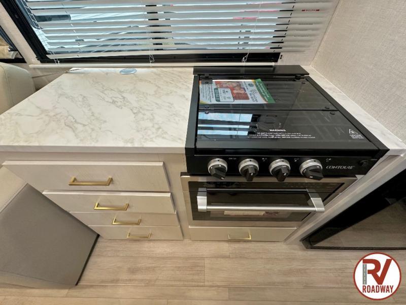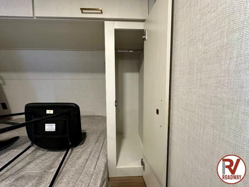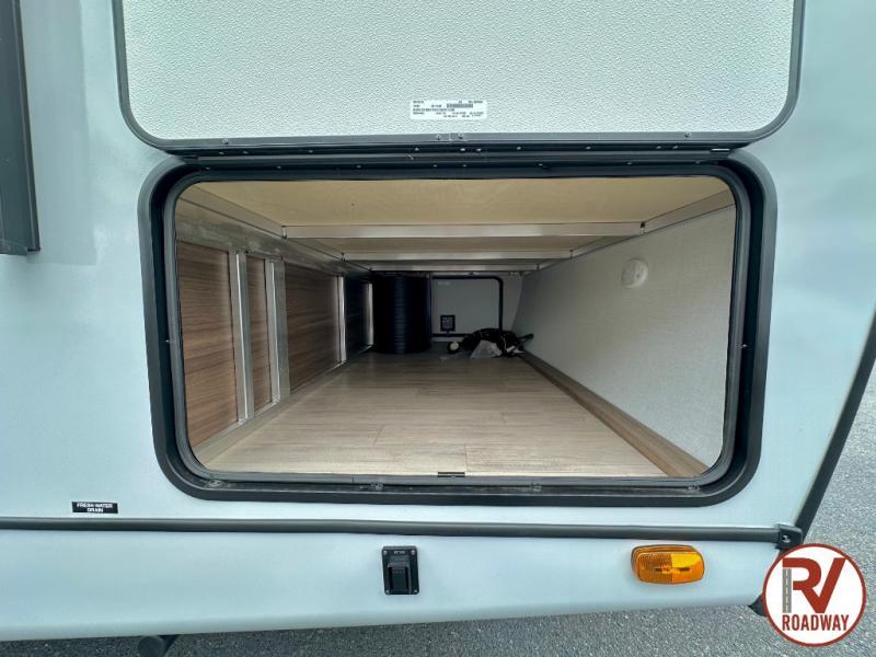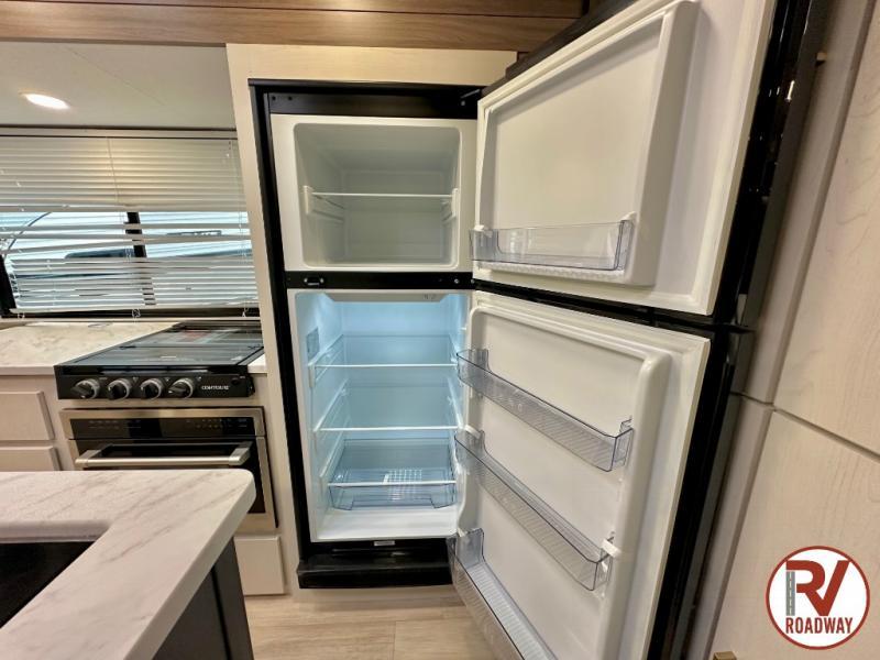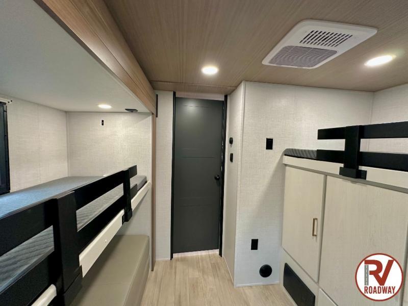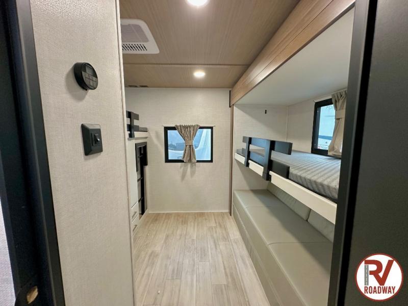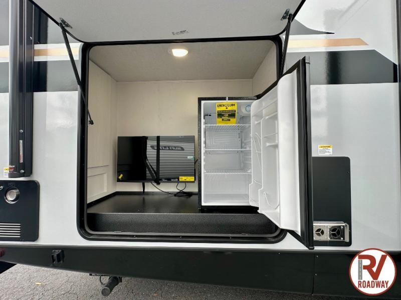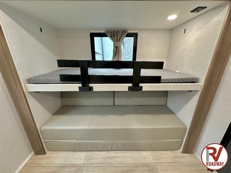 Whether you enjoy spending time outdoors or indoors, there is something for everyone in this travel trailer. The large pass-through storage can store your fishing poles, and the 20' electric awning with LED lights will create an outdoor living space. There is even an outdoor refrigerator with an outside storage cabinet and 32" TV! You will love all the interior space thanks to the dual opposing slides in the main living area, which will give the chef space to work around the kitchen island. Your crew can visit on the tri-fold sofa, theater seating and 5-person dinette while the fireplace is going, but you'll probably find the kids spending most of their time in the private bunkhouse! What more could you want in a travel trailer?!